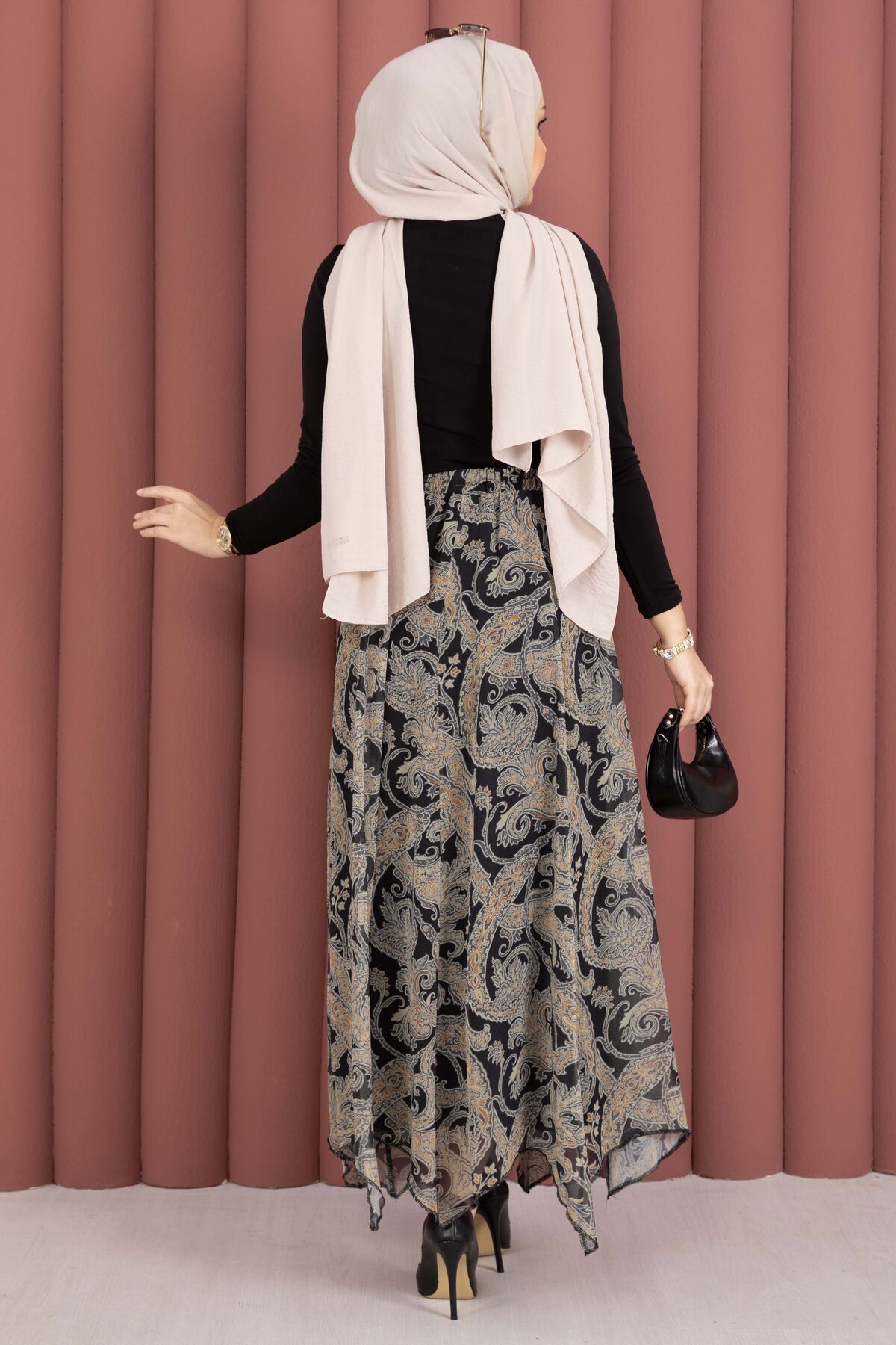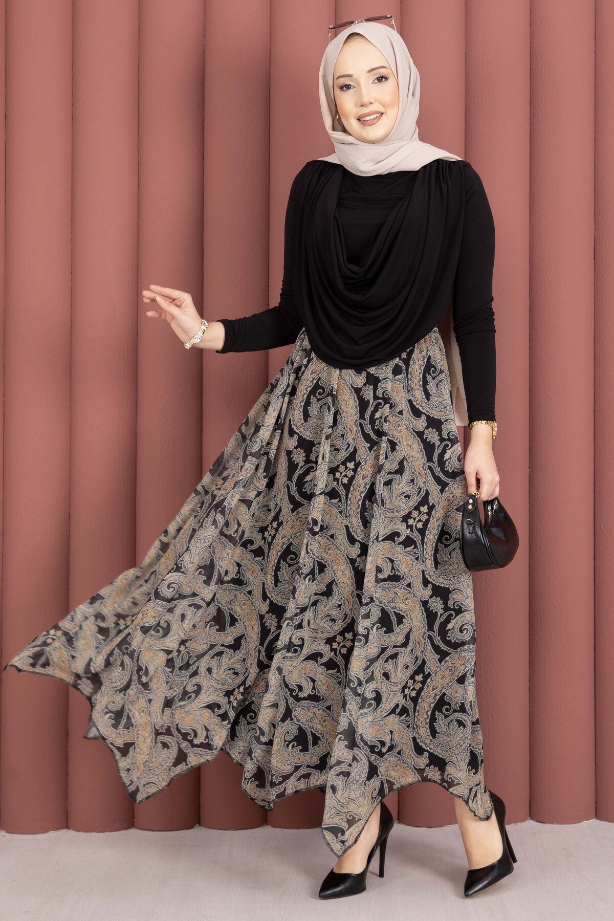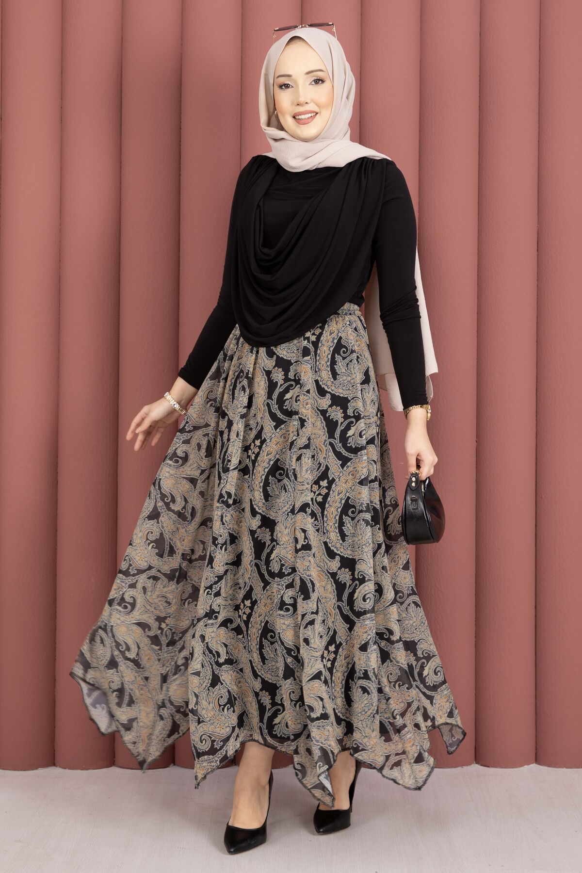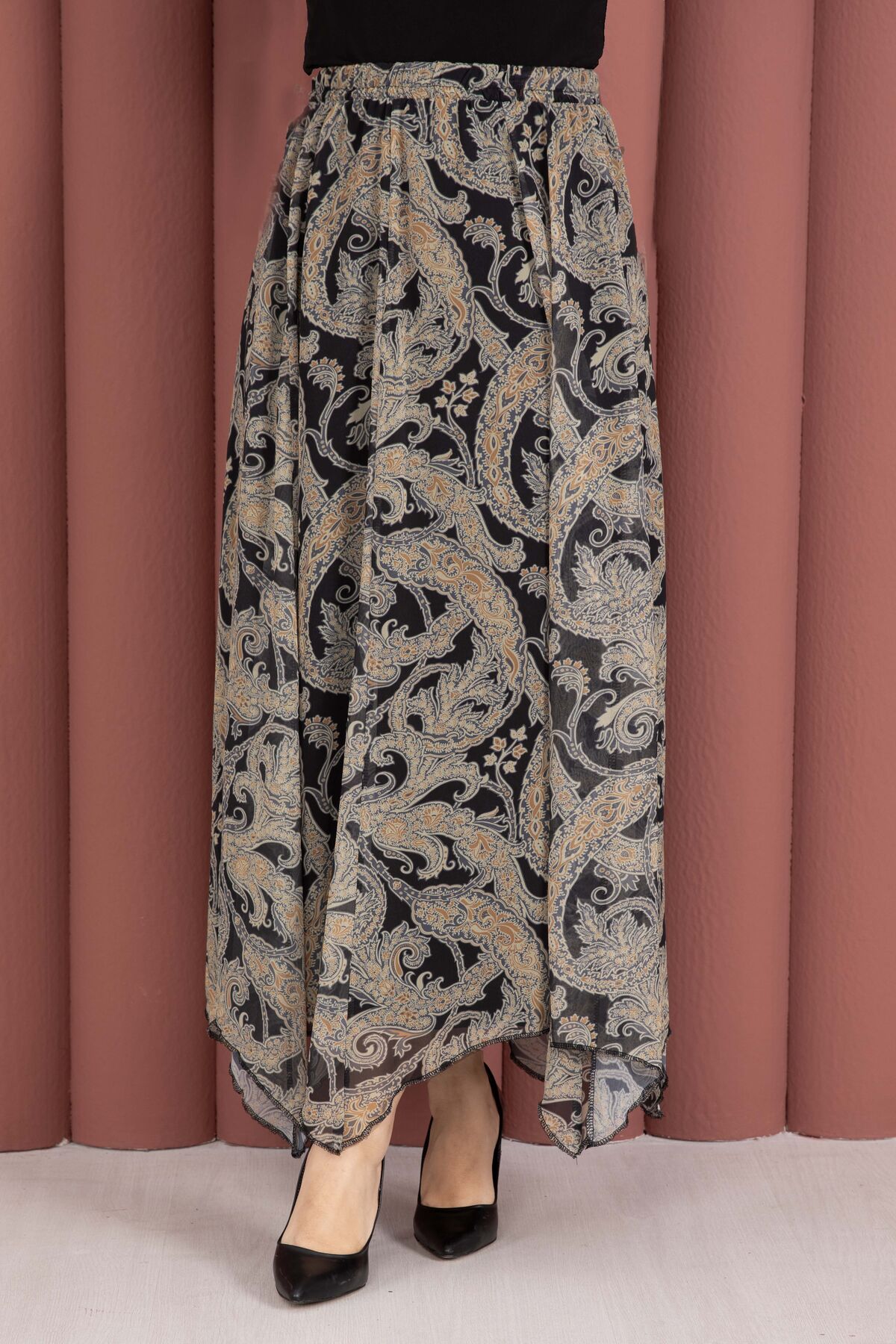 Şal Desen Asimetrik Kesim Şifon Etek Siyah