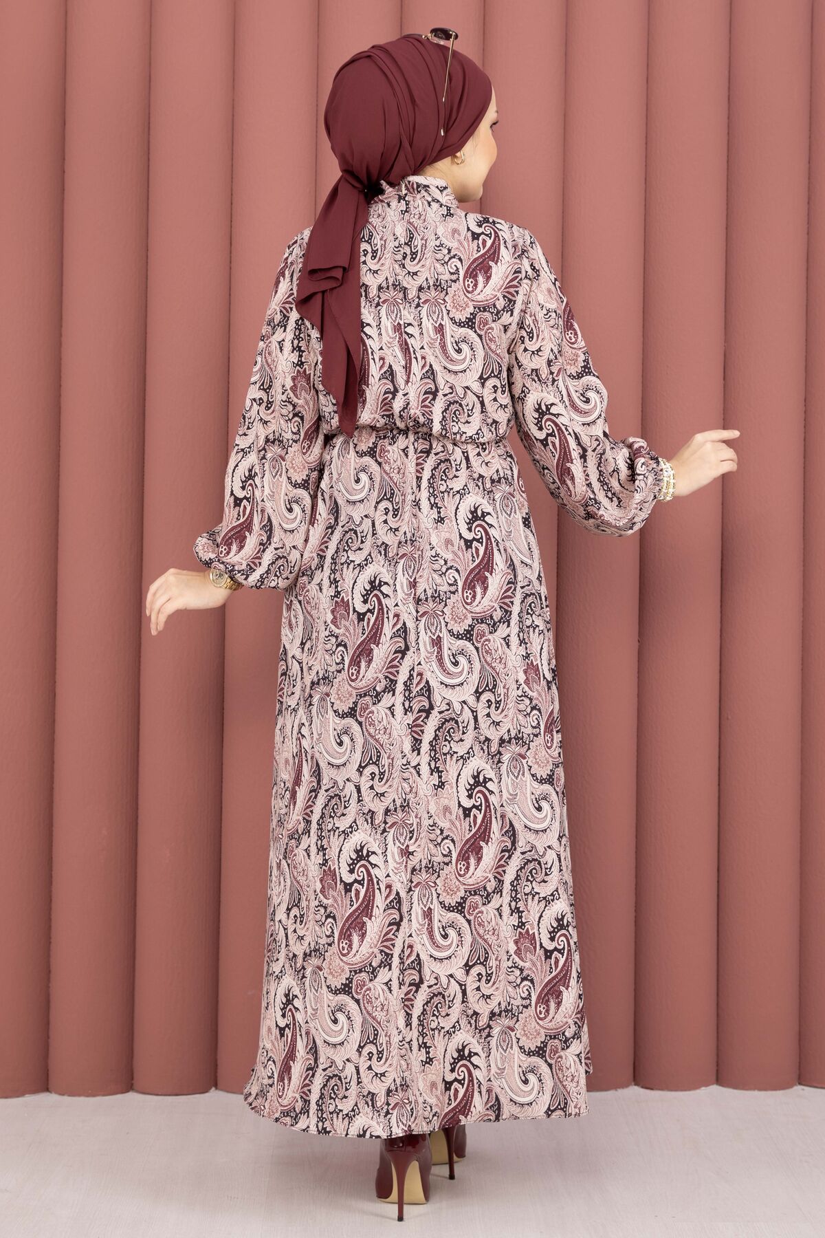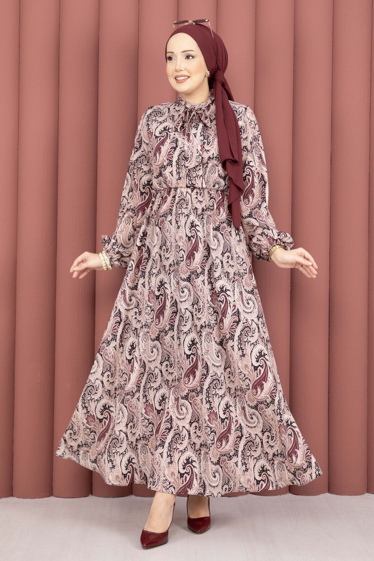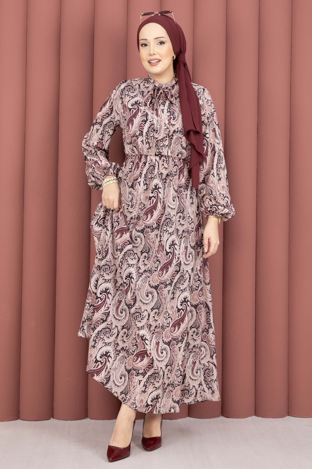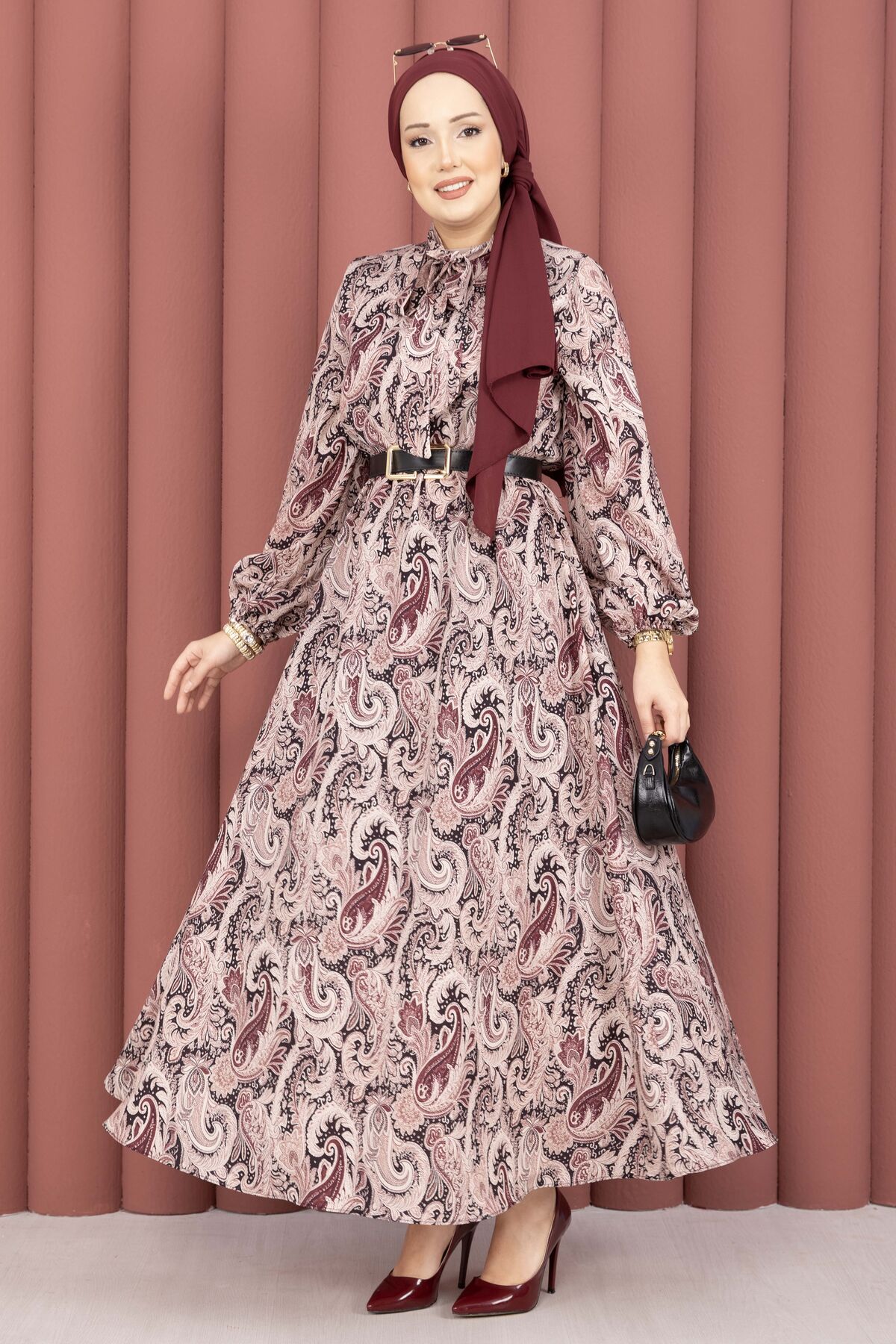 Şal Desen Beli Büzgülü Tesettür Elbise Bordo