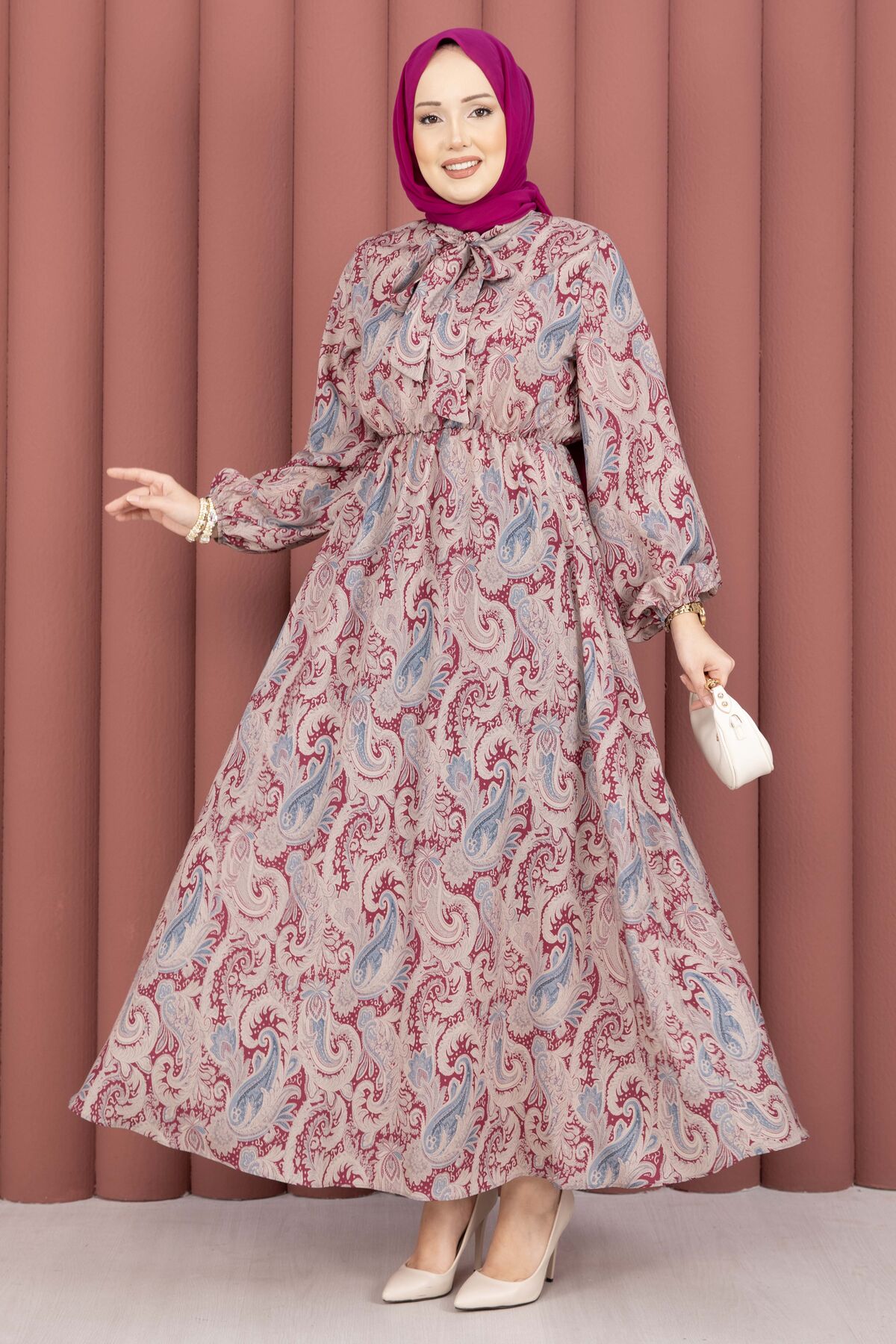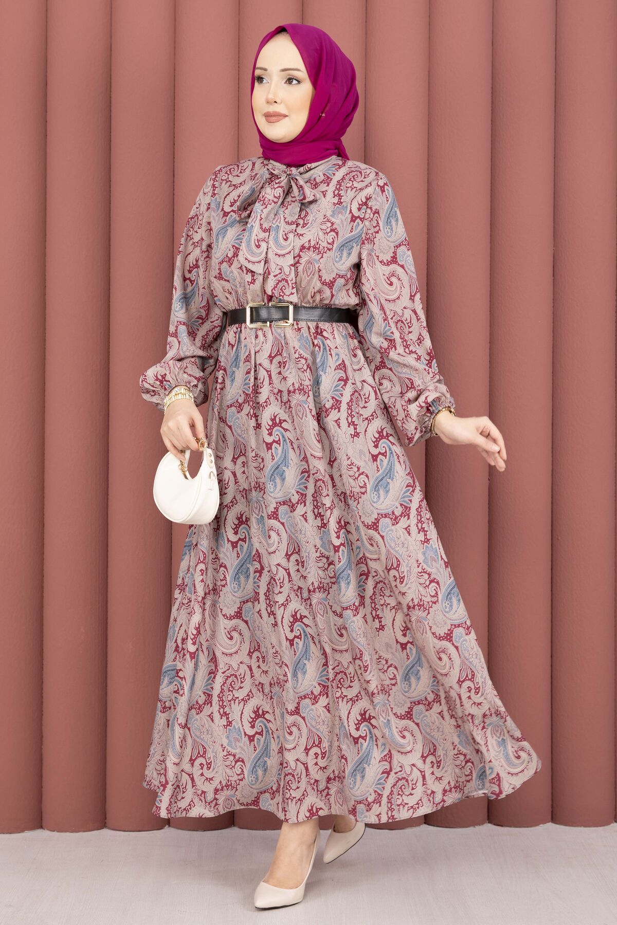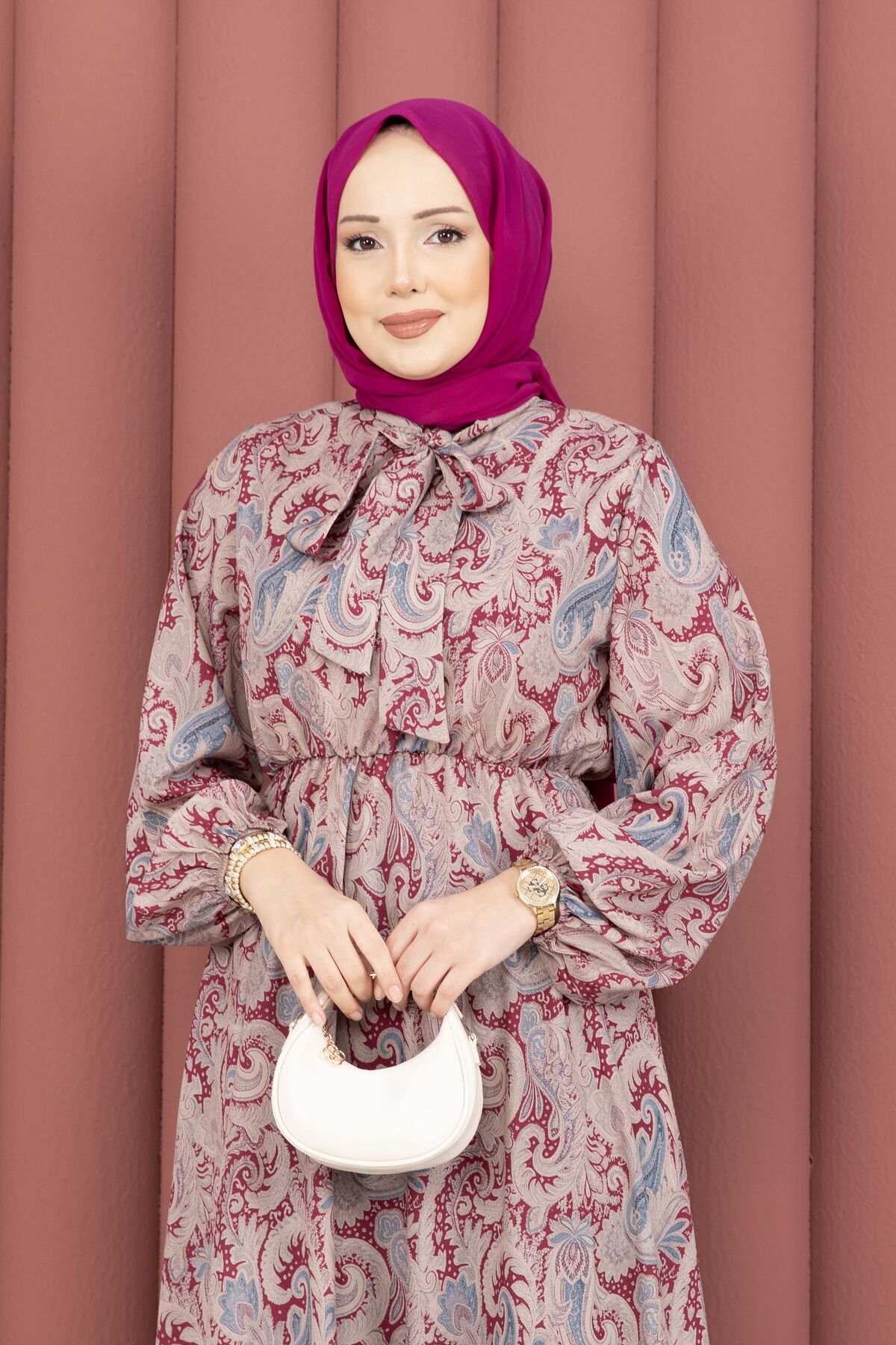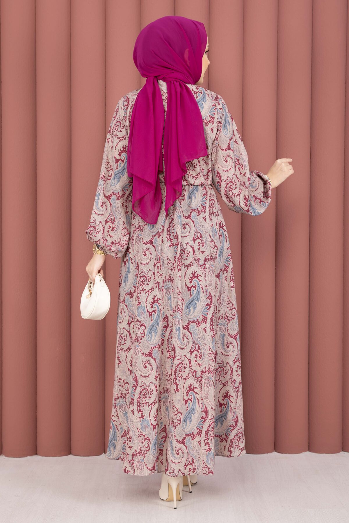 Şal Desen Beli Büzgülü Tesettür Elbise Fuşya
