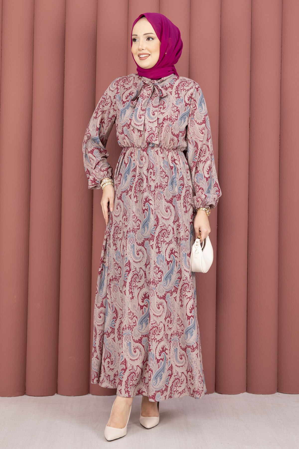 Şal Desen Beli Büzgülü Tesettür Elbise