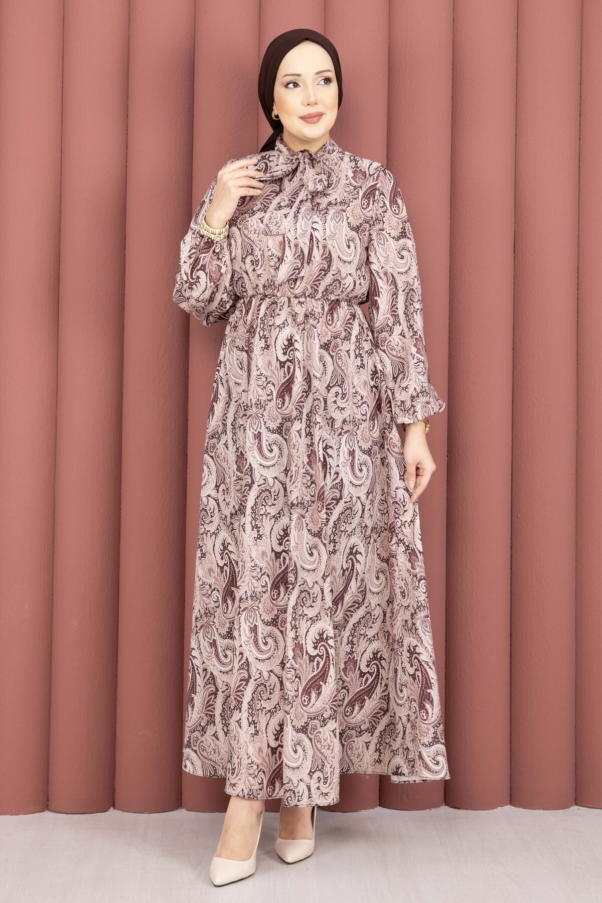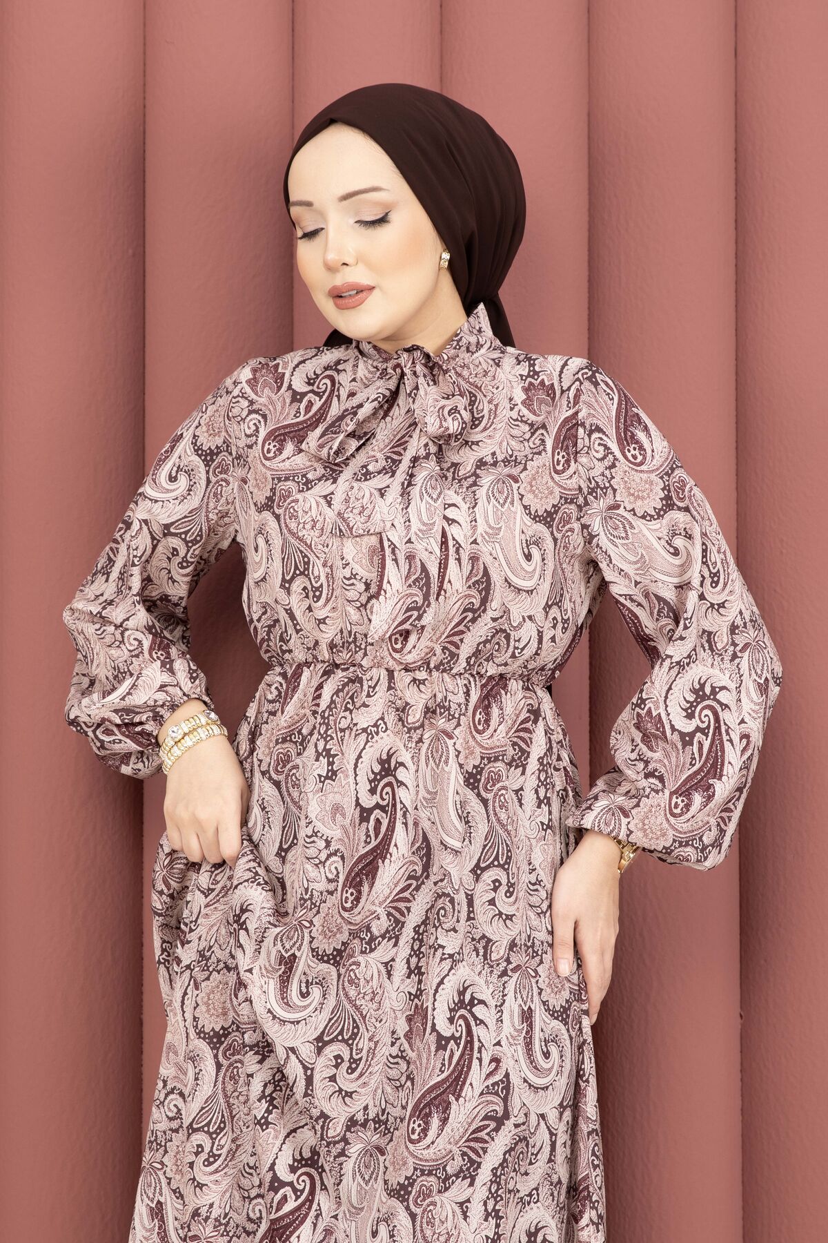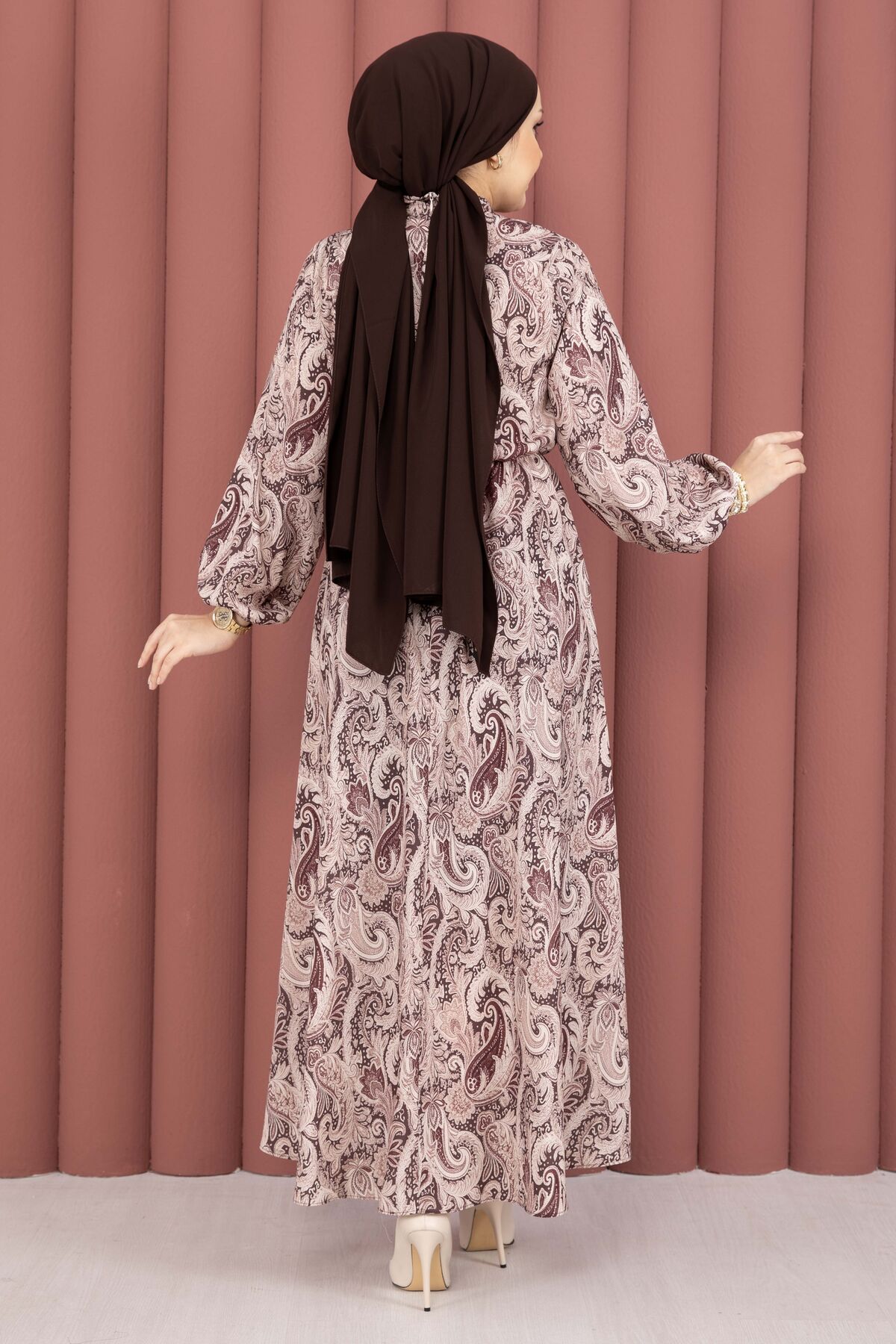 Şal Desen Beli Büzgülü Tesettür Elbise Kahve