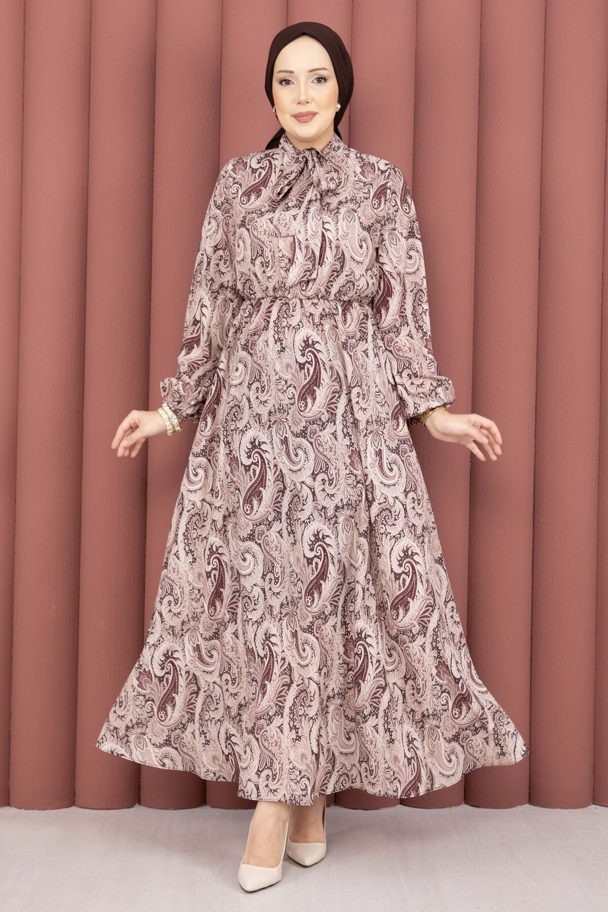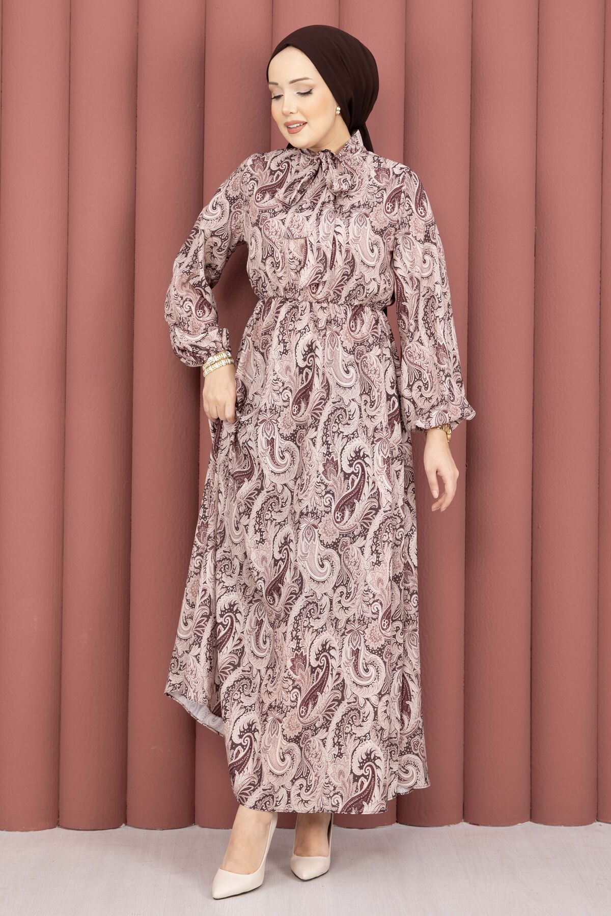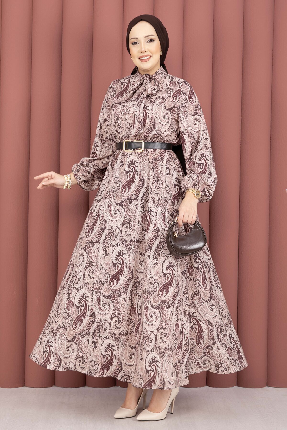 Şal Desen Beli Büzgülü Tesettür Elbise Kahve