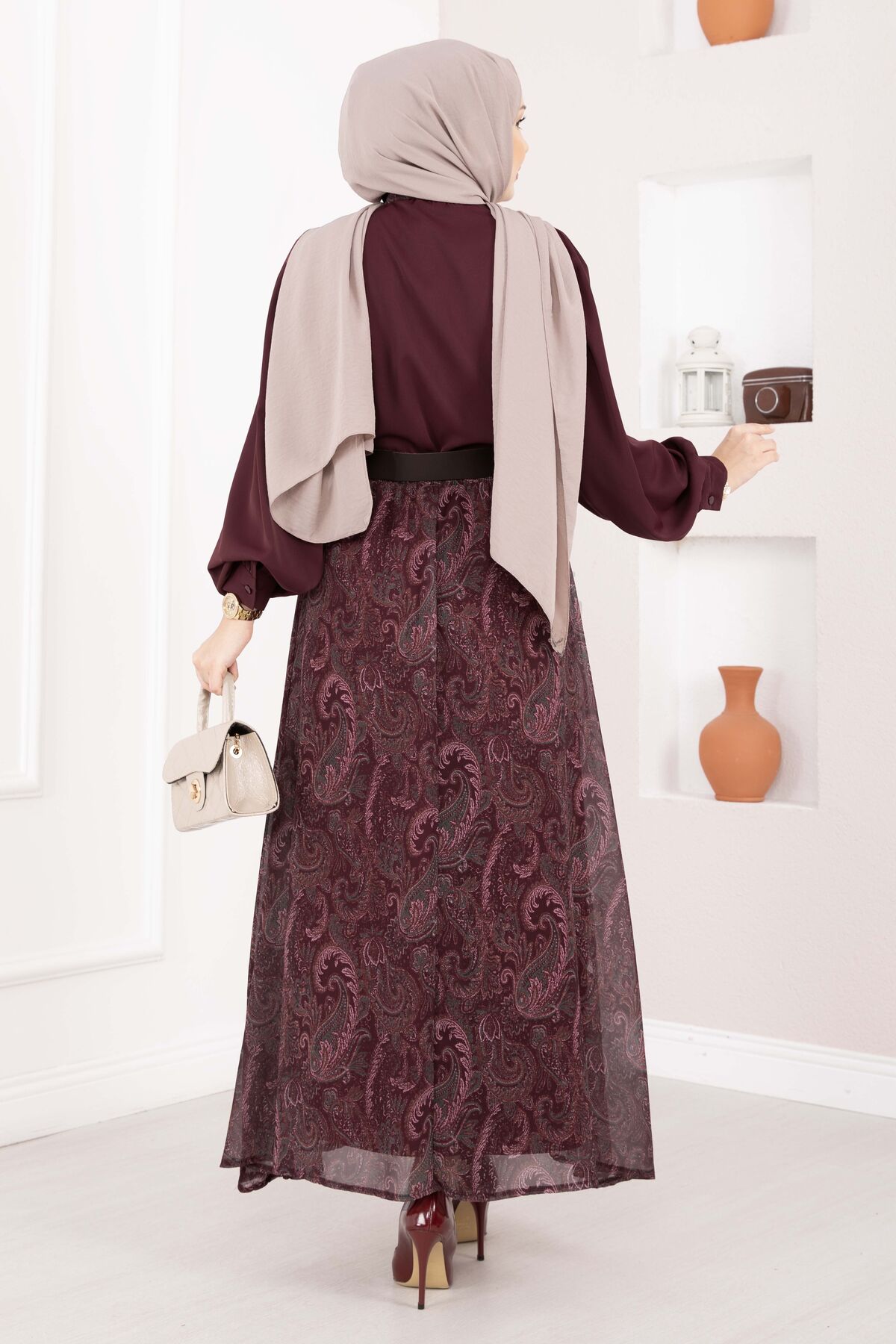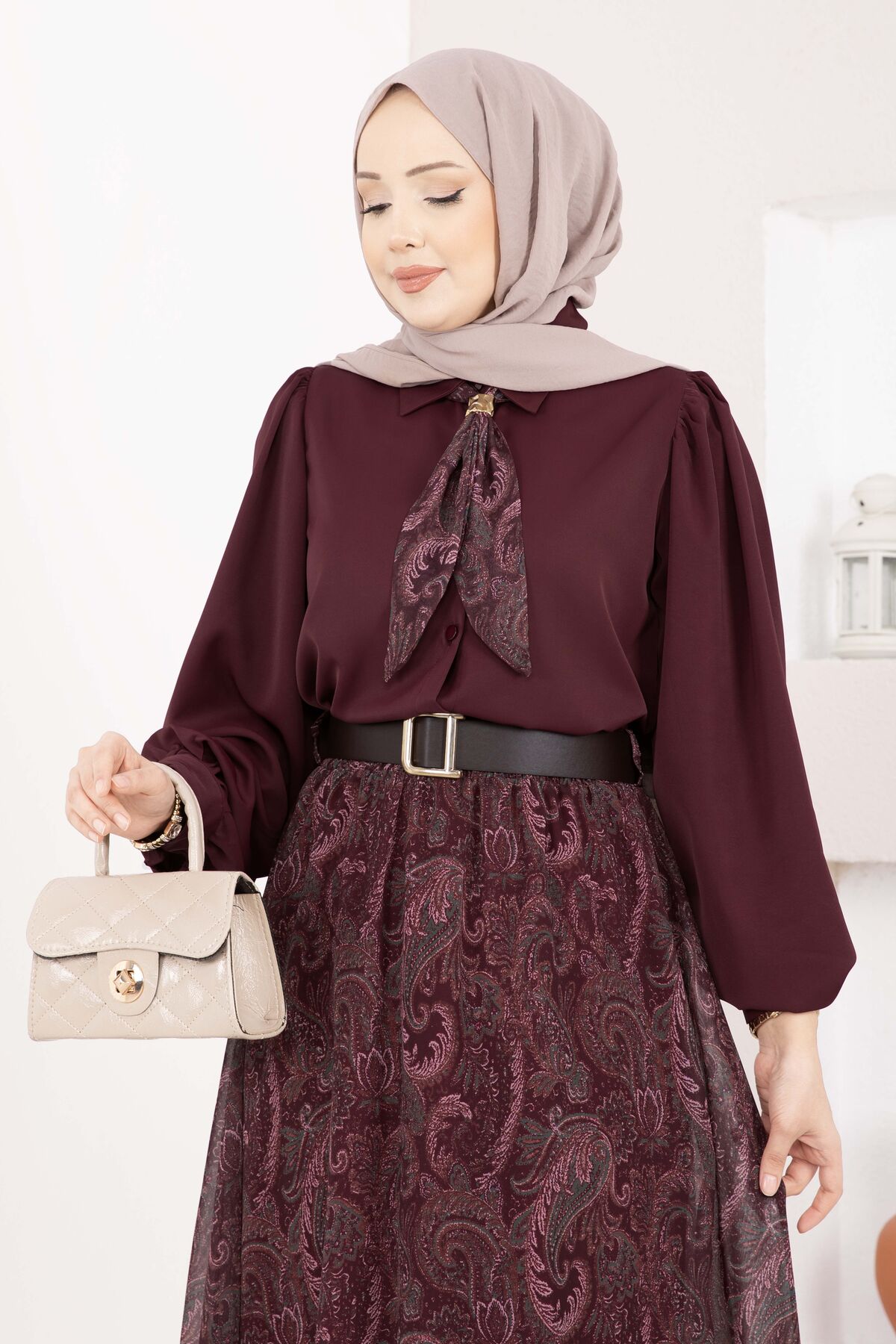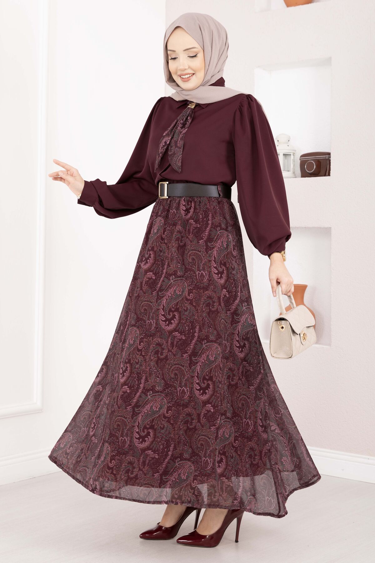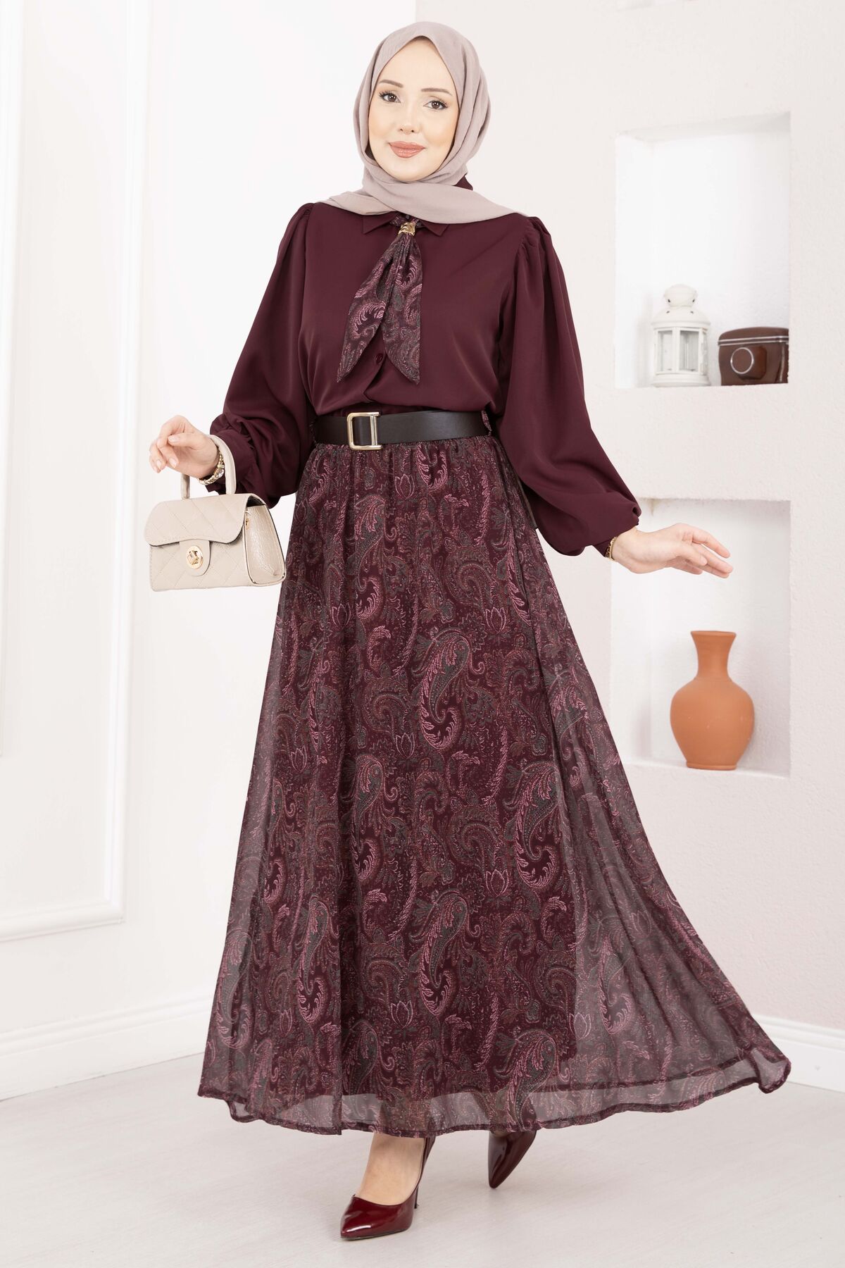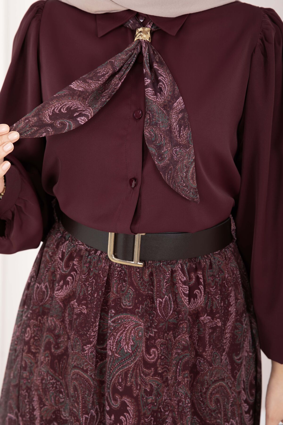 Şal Desen Fularlı Gömlek & Kemerli Etek Takım Bordo
