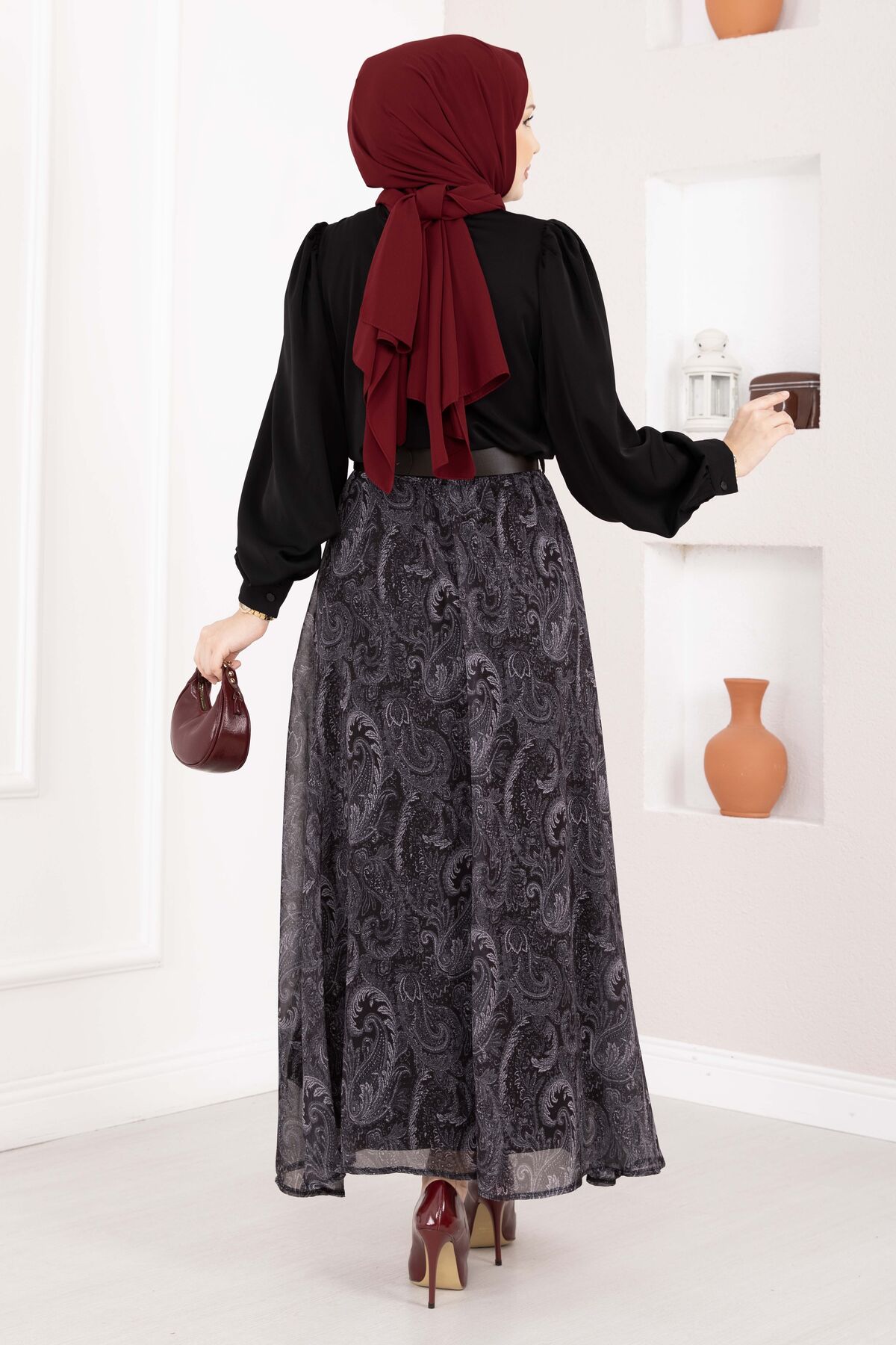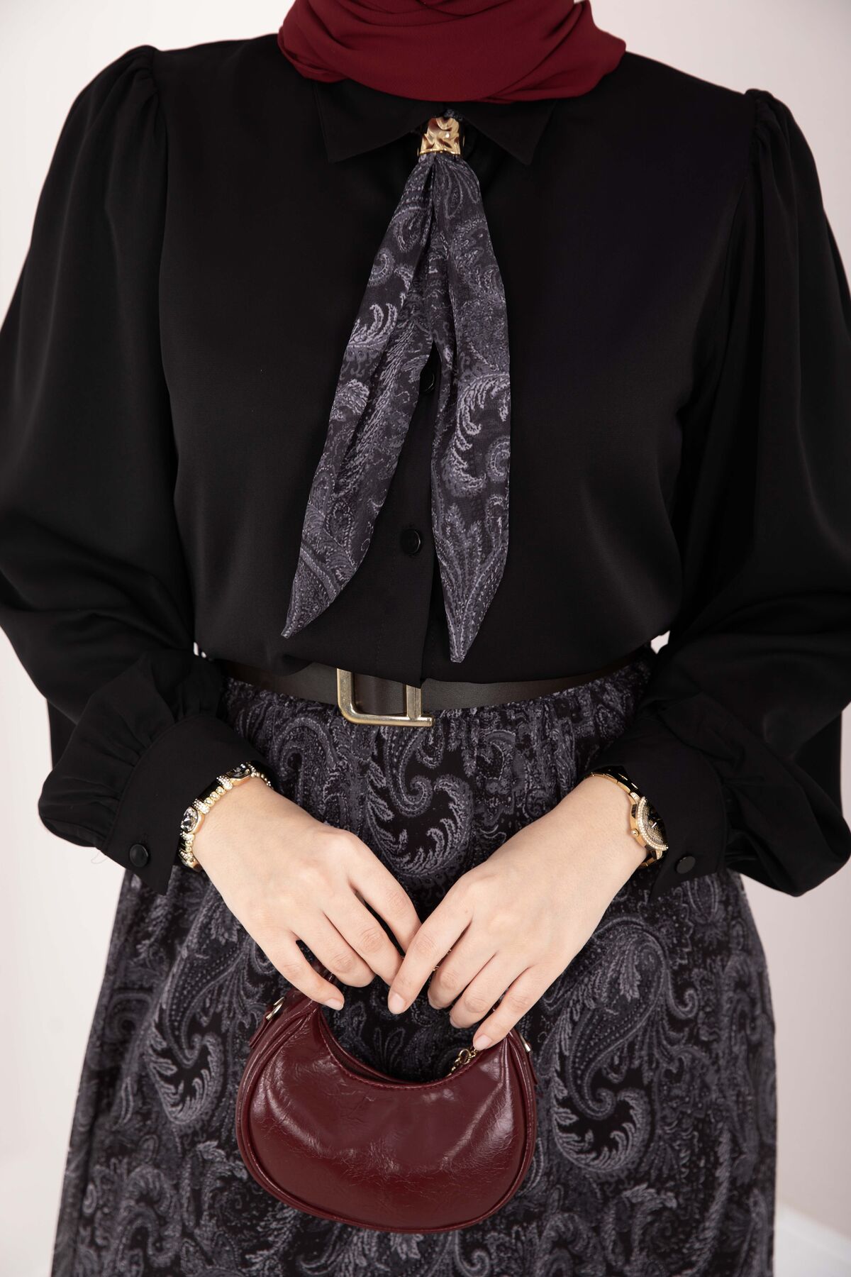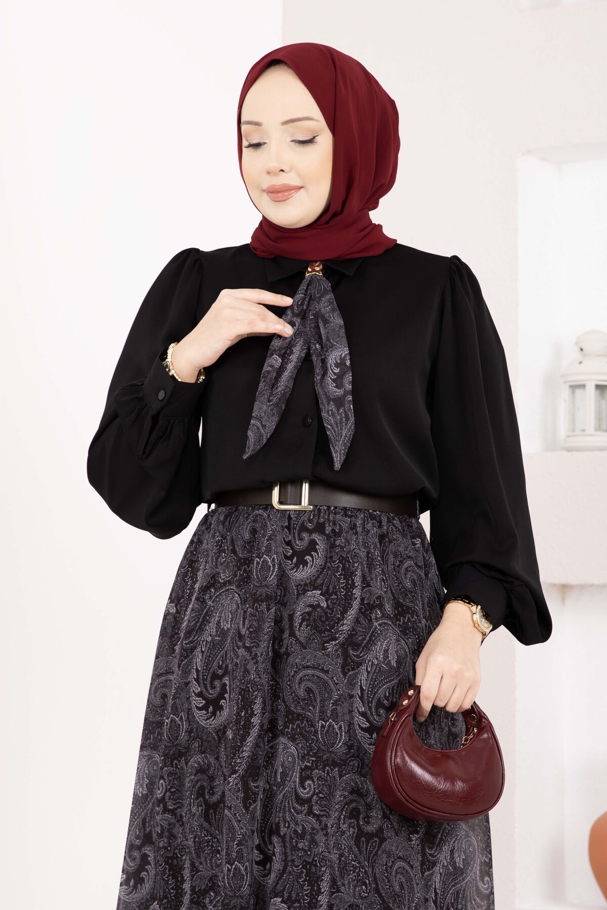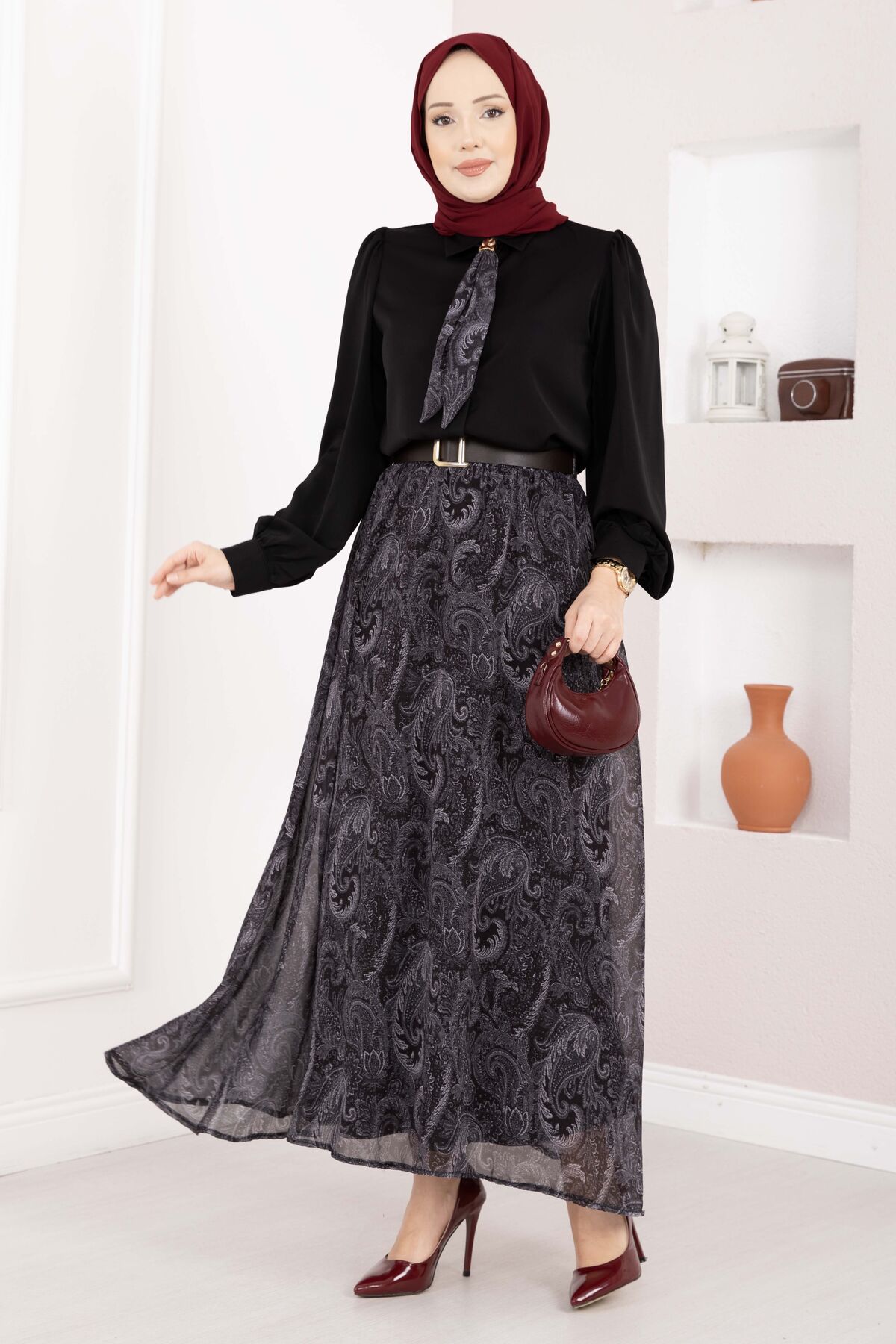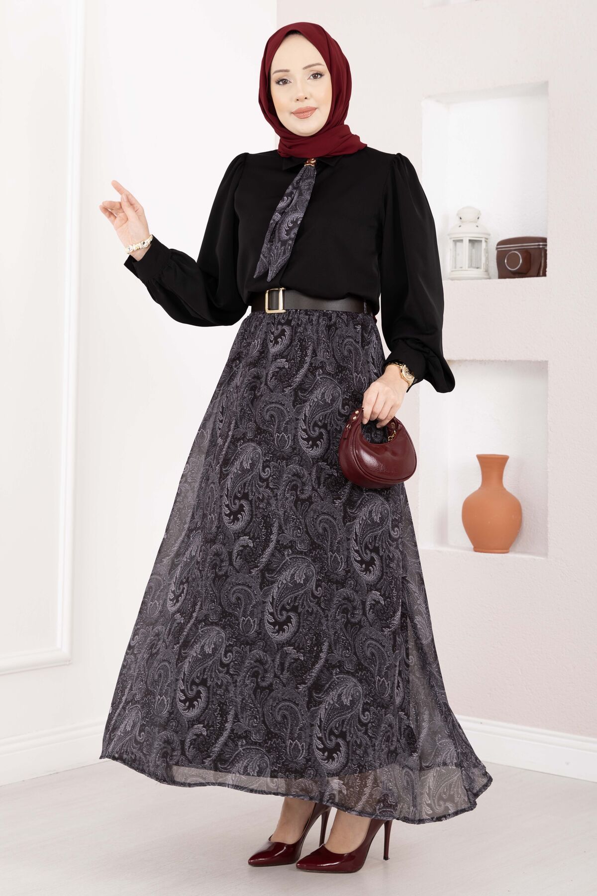 Şal Desen Fularlı Gömlek & Kemerli Etek Takım Siyah