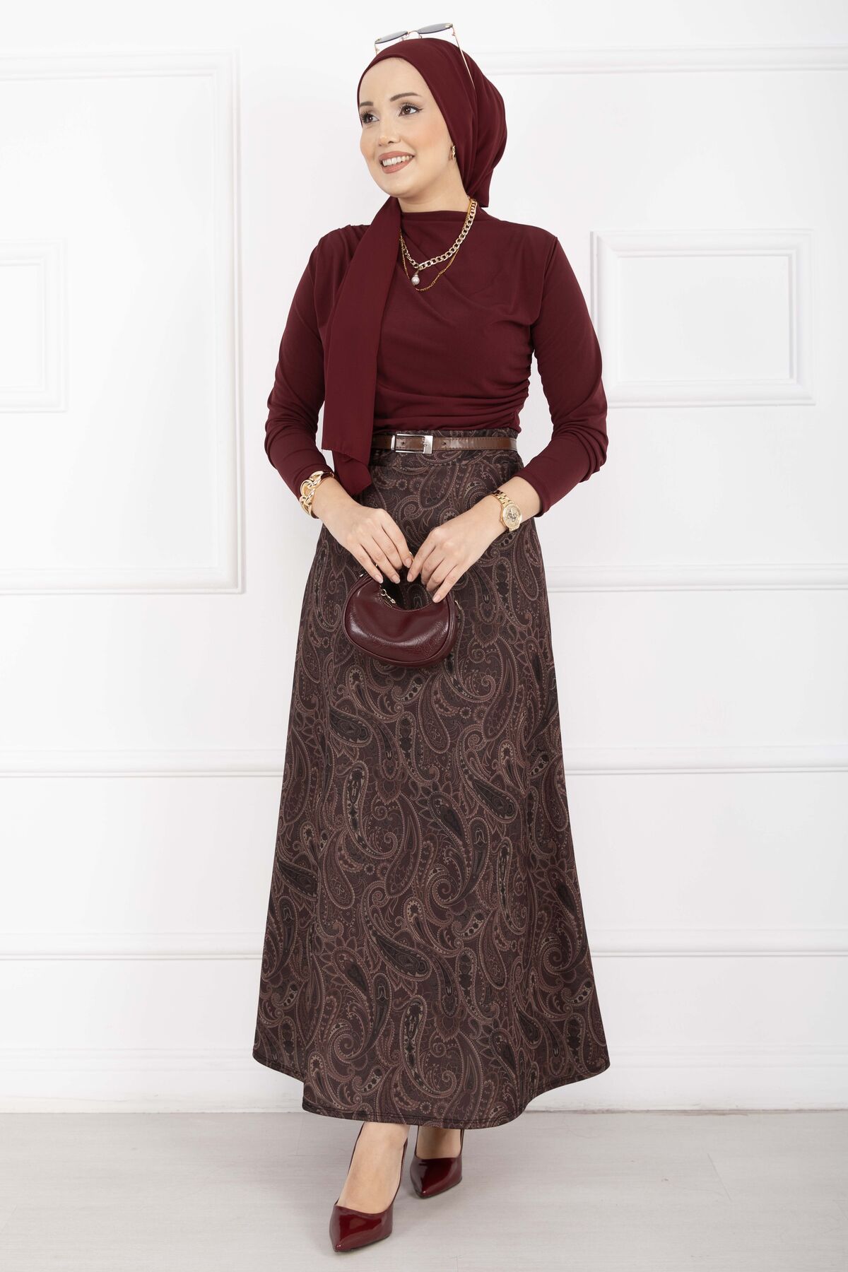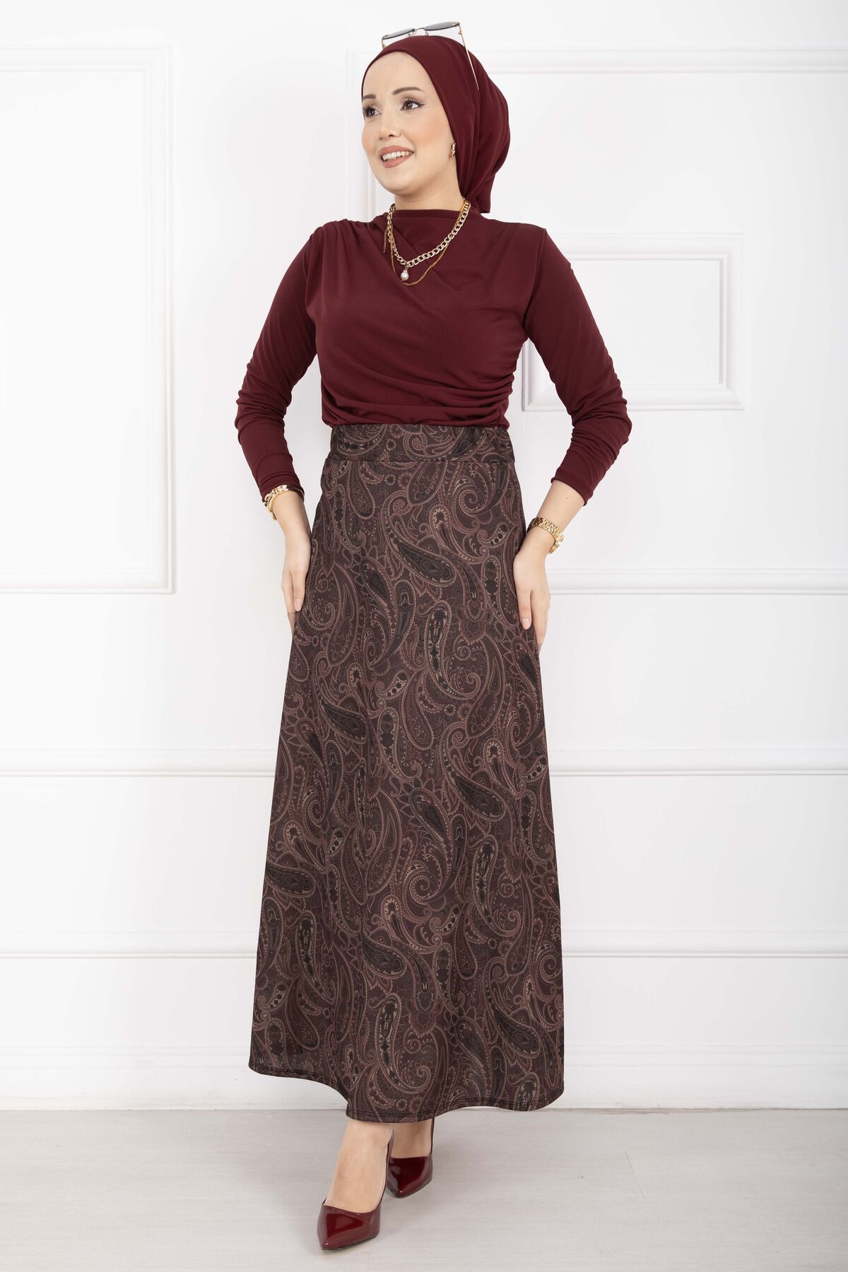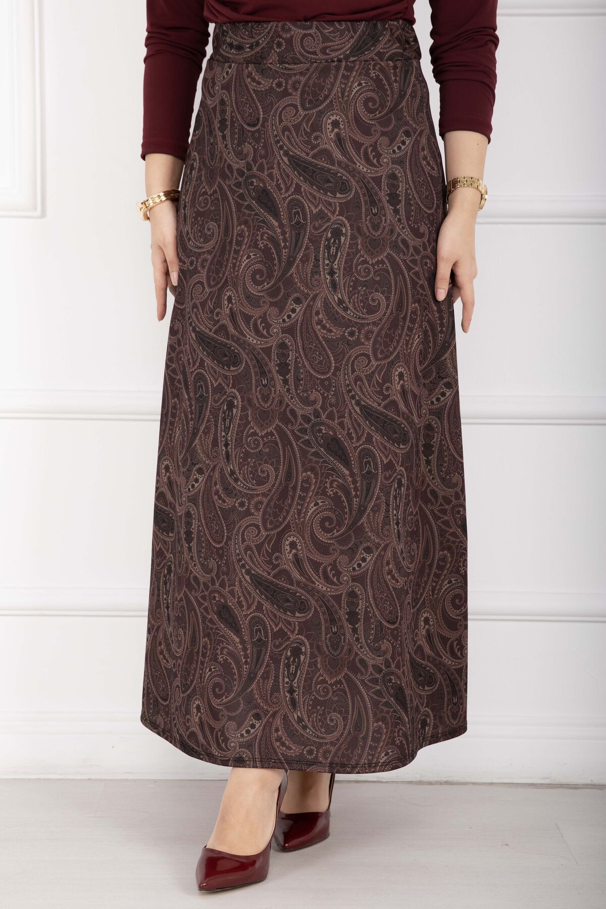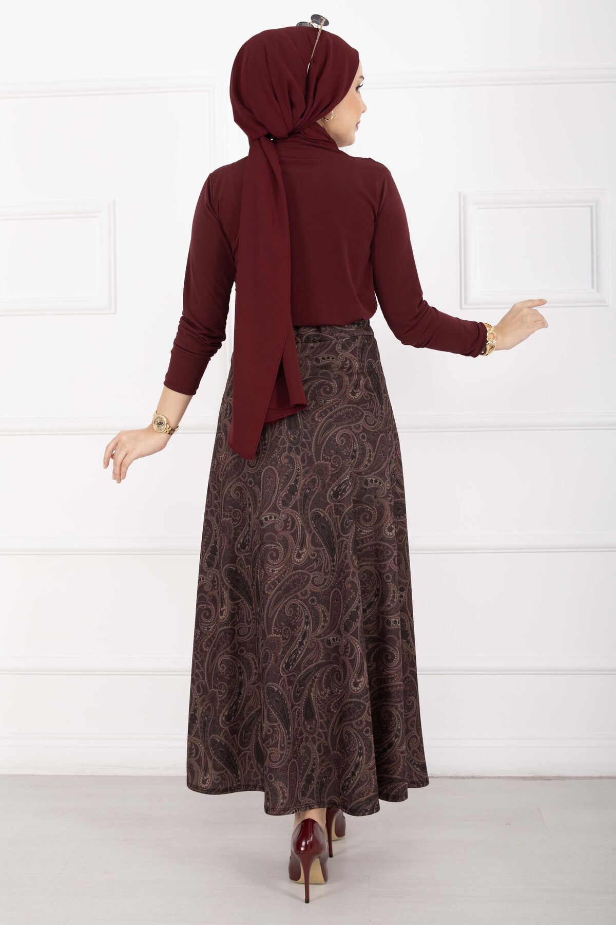 Şal Desen Scuba Etek Bordo
