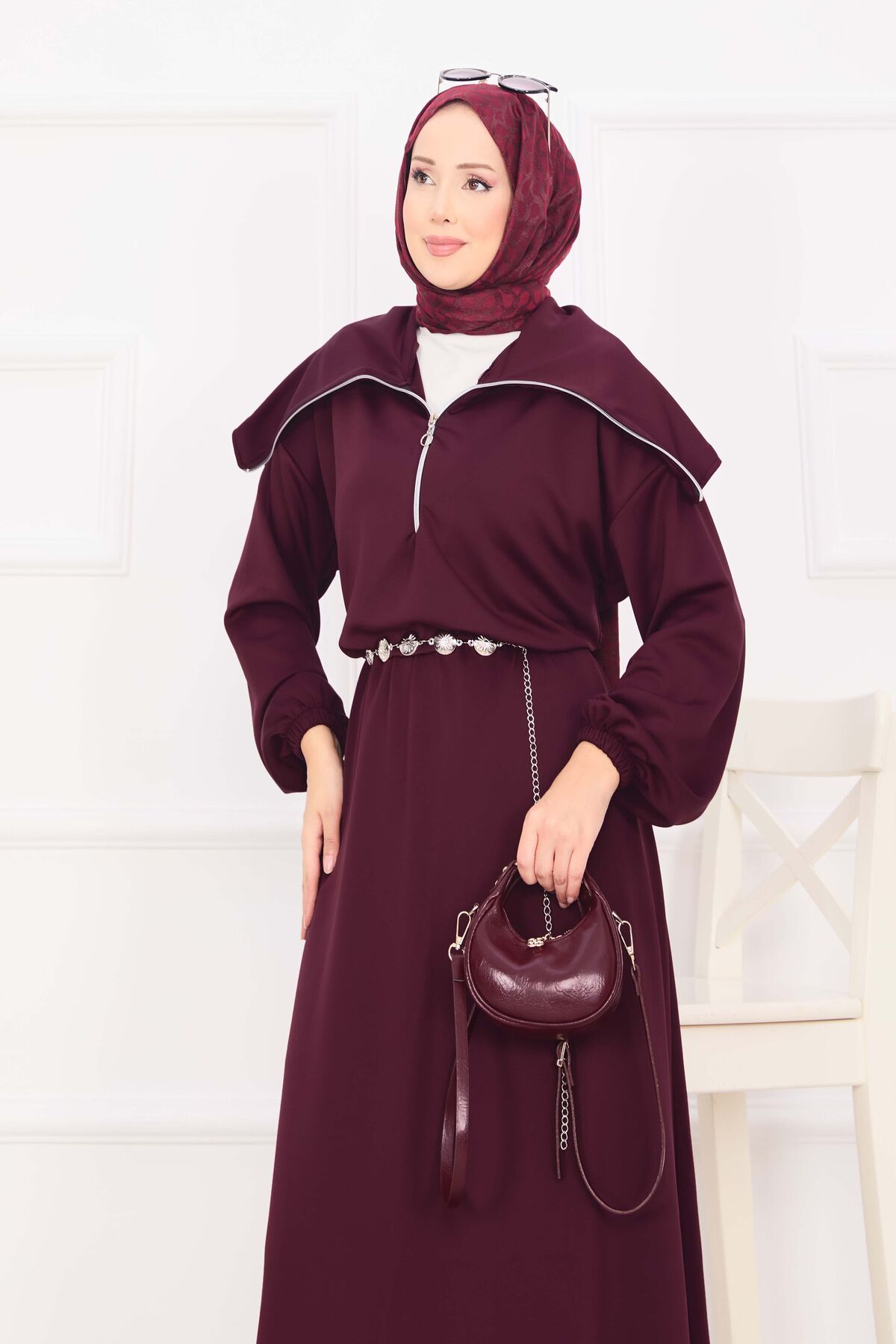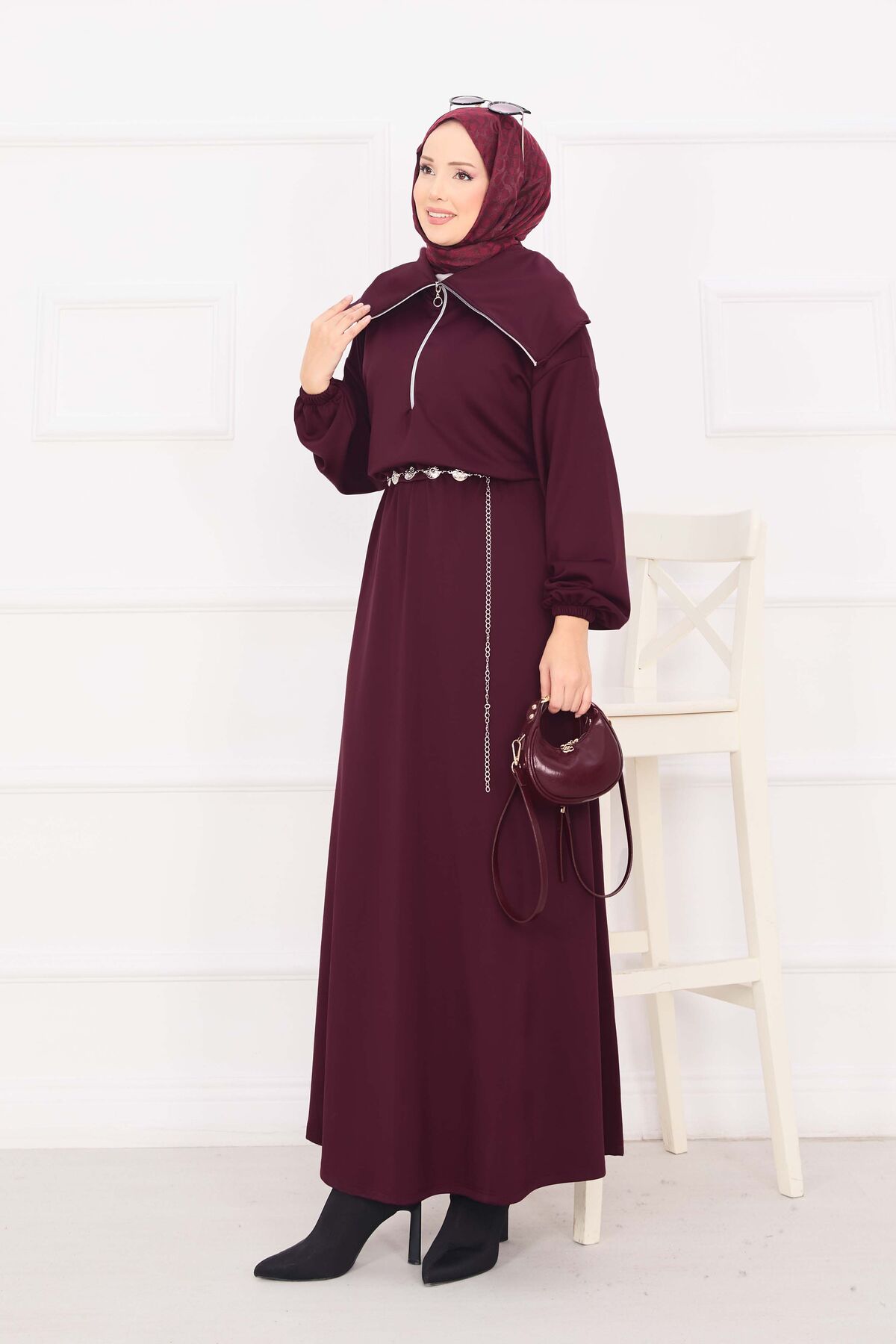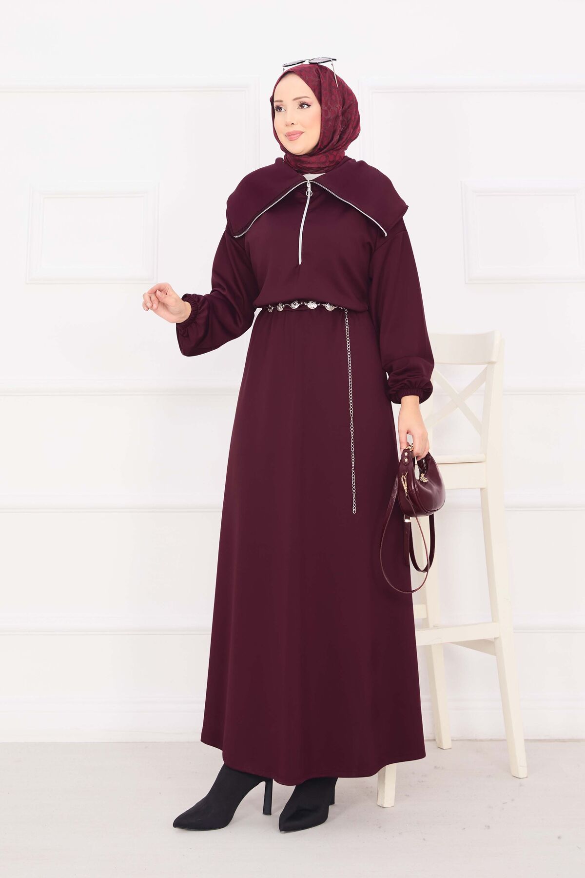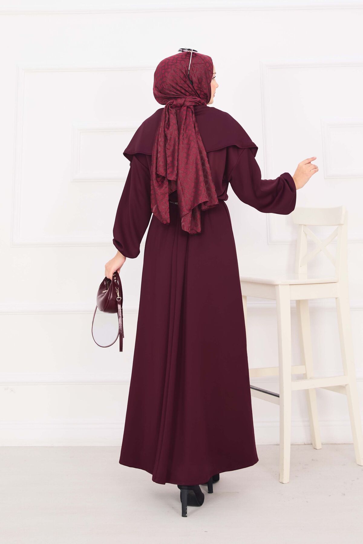 Şal Yaka Beli Büzgülü Zincir Kemerli Tesettür Elbise Bordo Yorumları