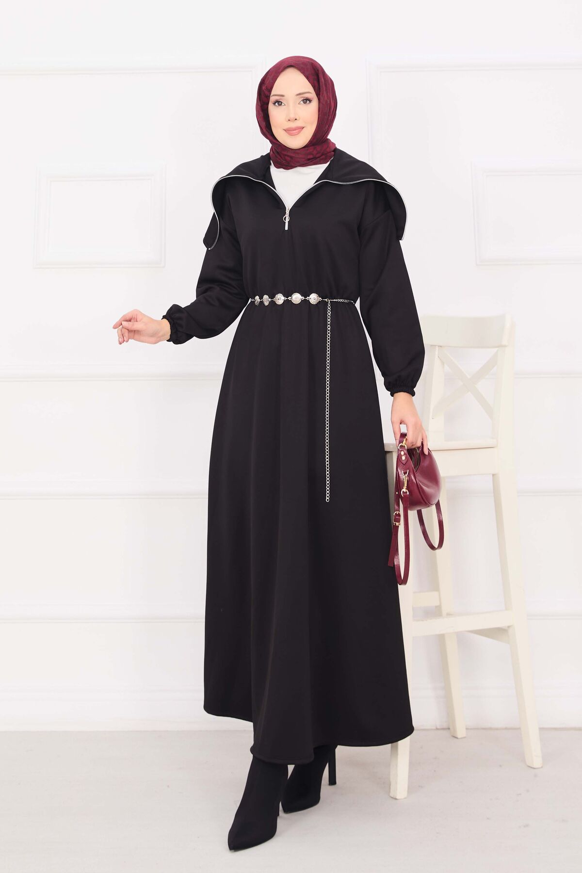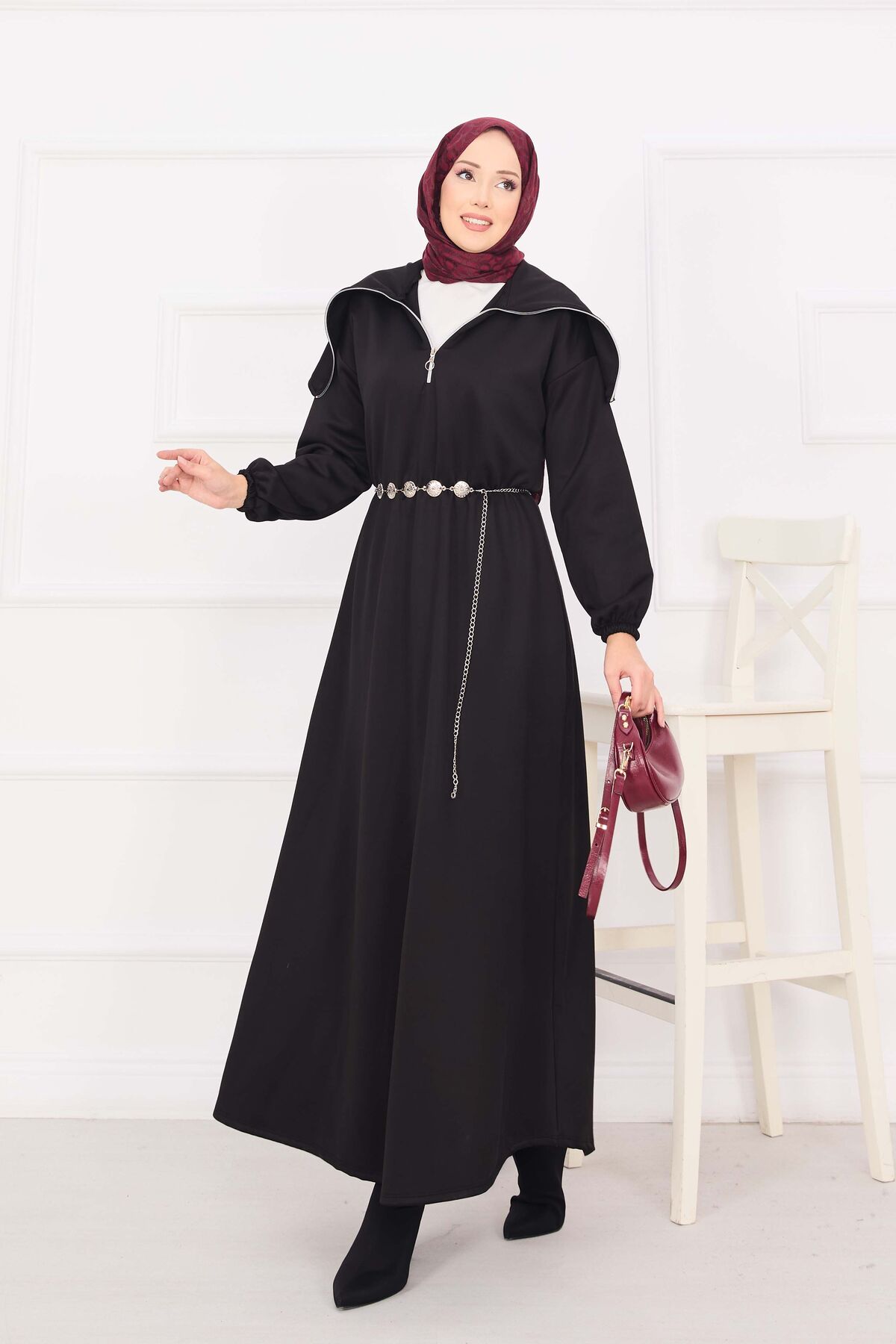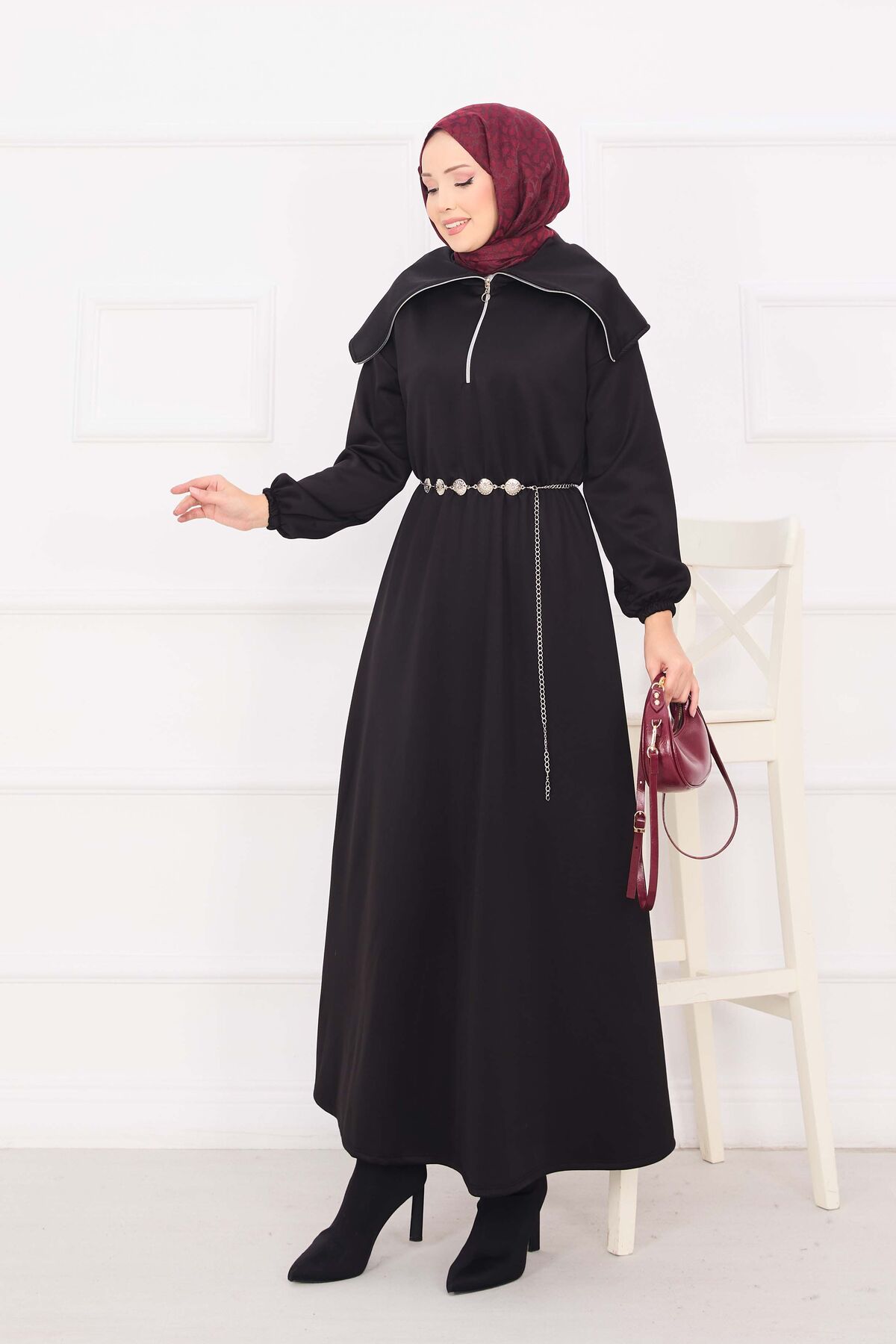 Şal Yaka Beli Büzgülü Zincir Kemerli Tesettür Elbise Siyah Yorumları