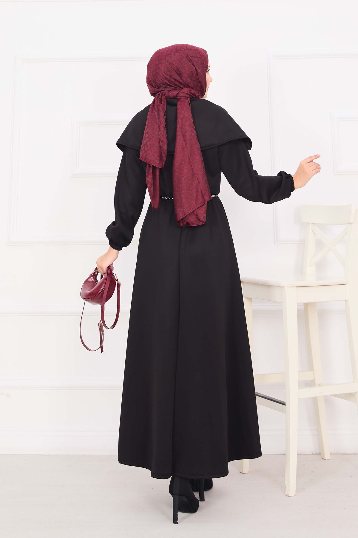 Şal Yaka Beli Büzgülü Zincir Kemerli Tesettür Elbise Siyah