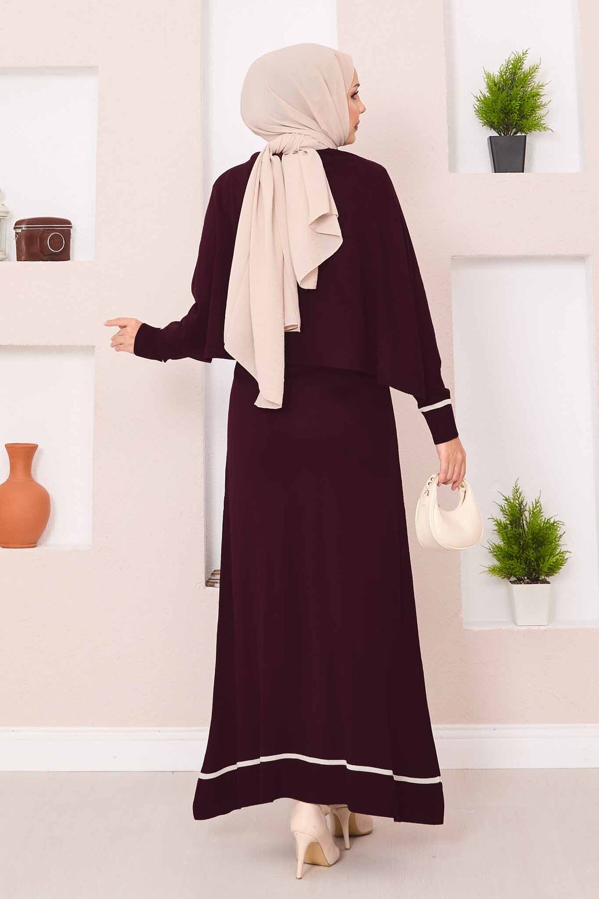 Şallı Çizgi Detaylı Tesettür Triko Elbise Bordo
