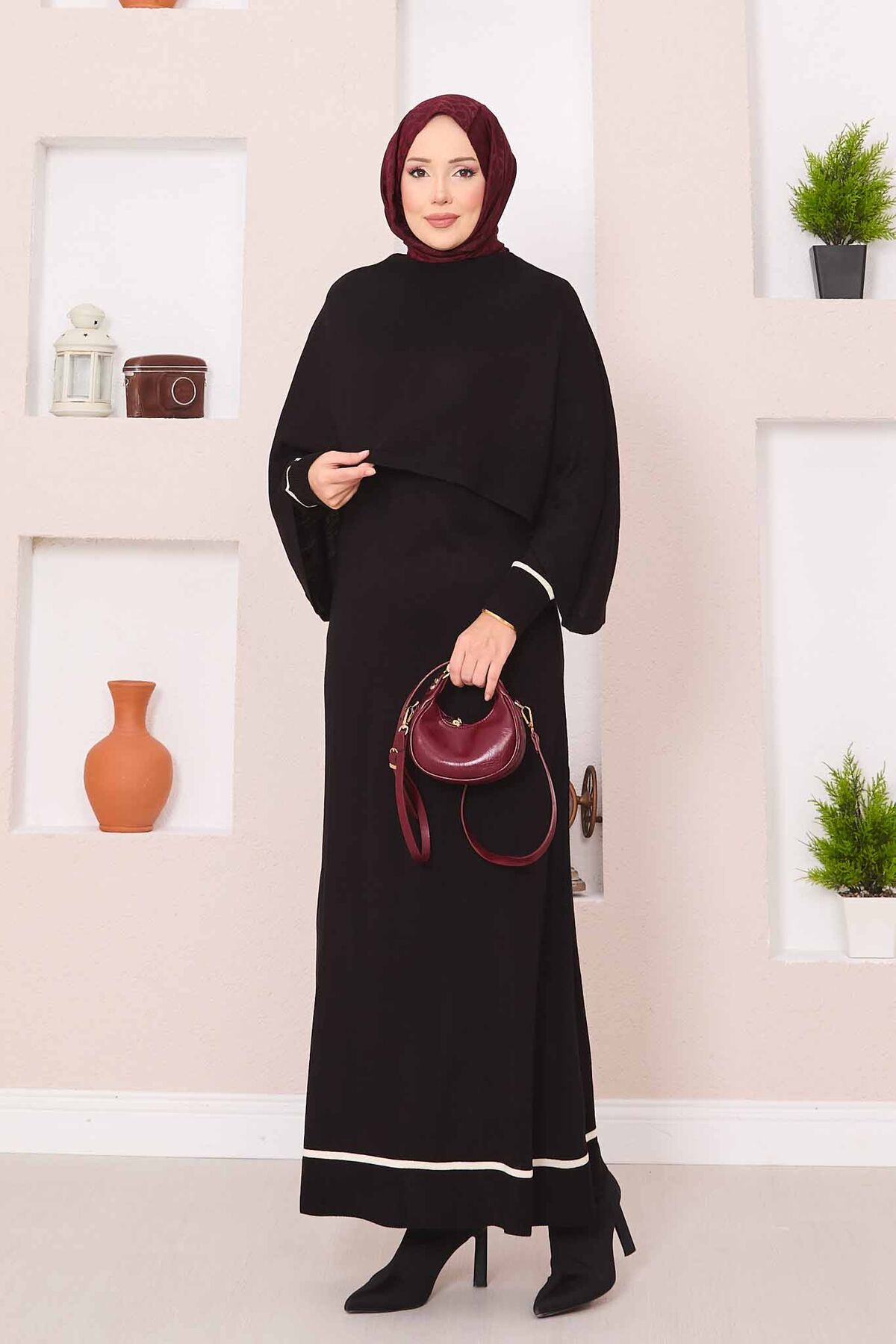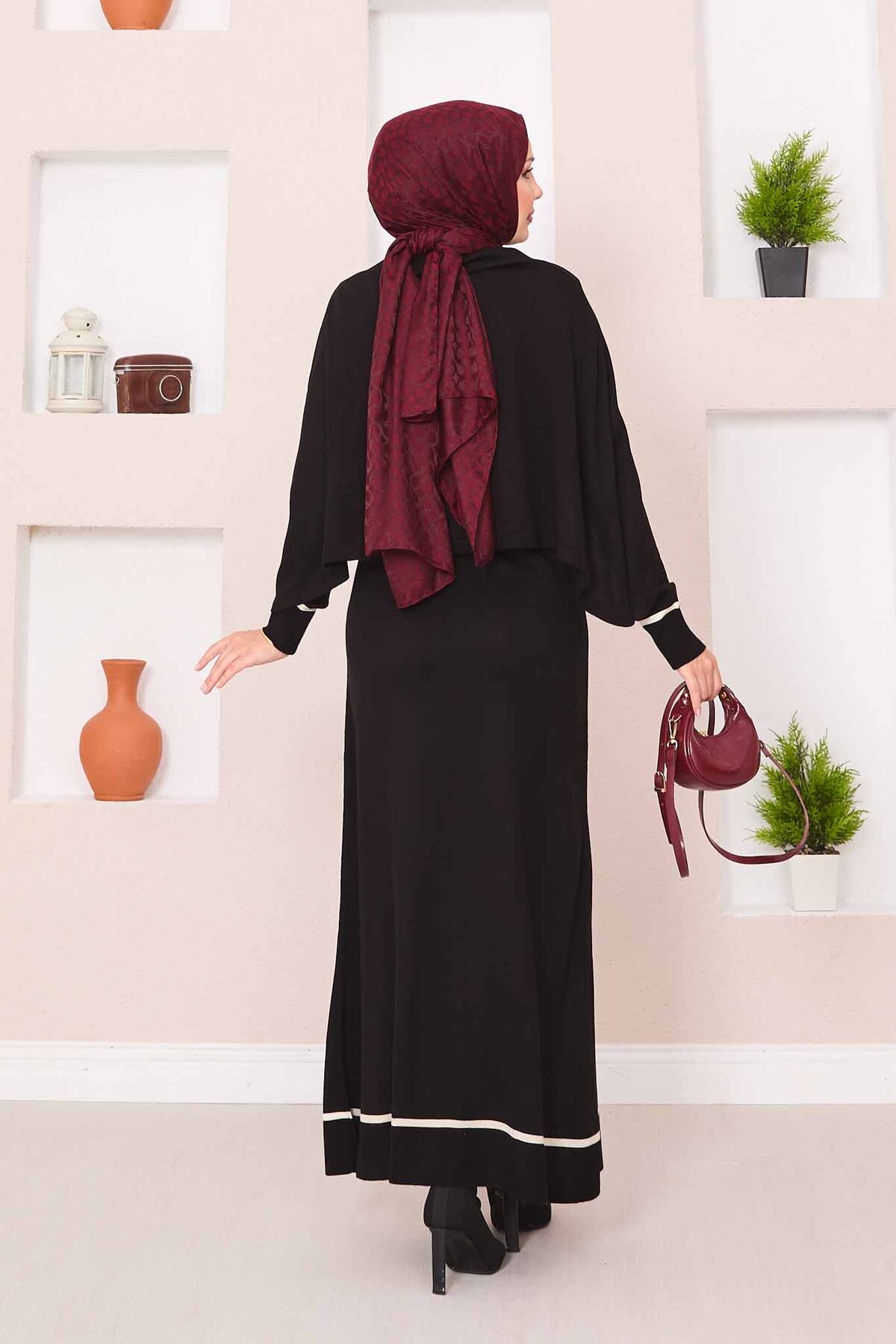 Şallı Çizgi Detaylı Tesettür Triko Elbise Siyah