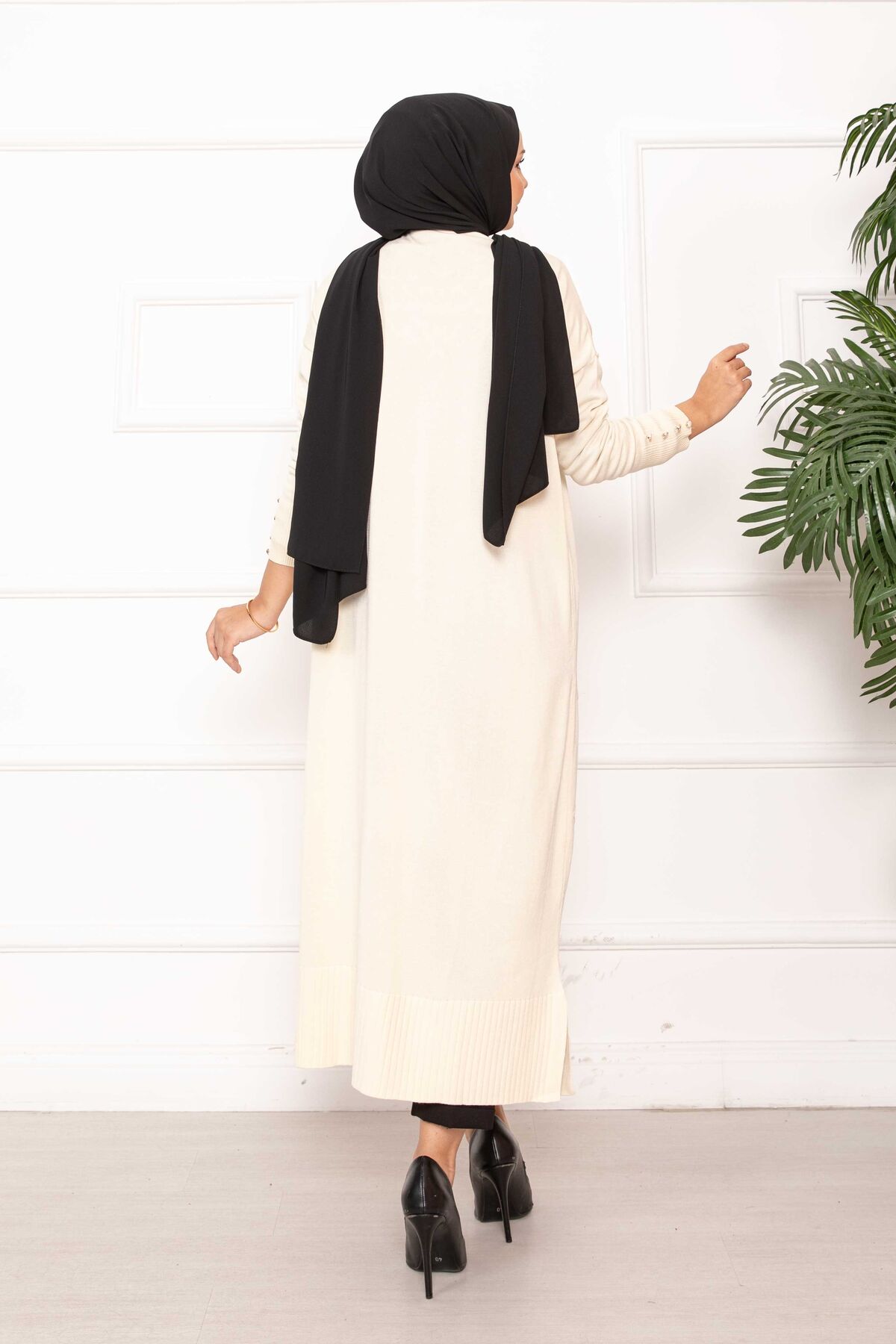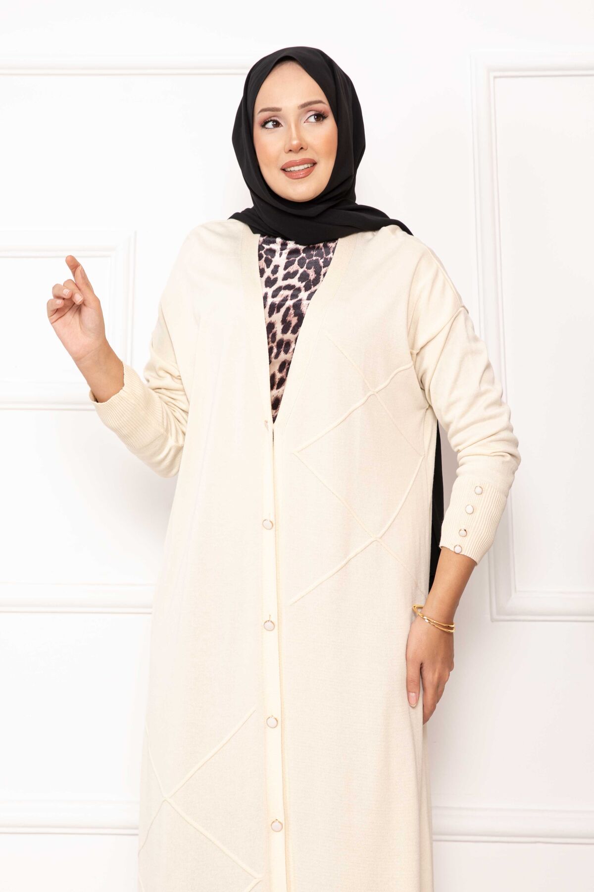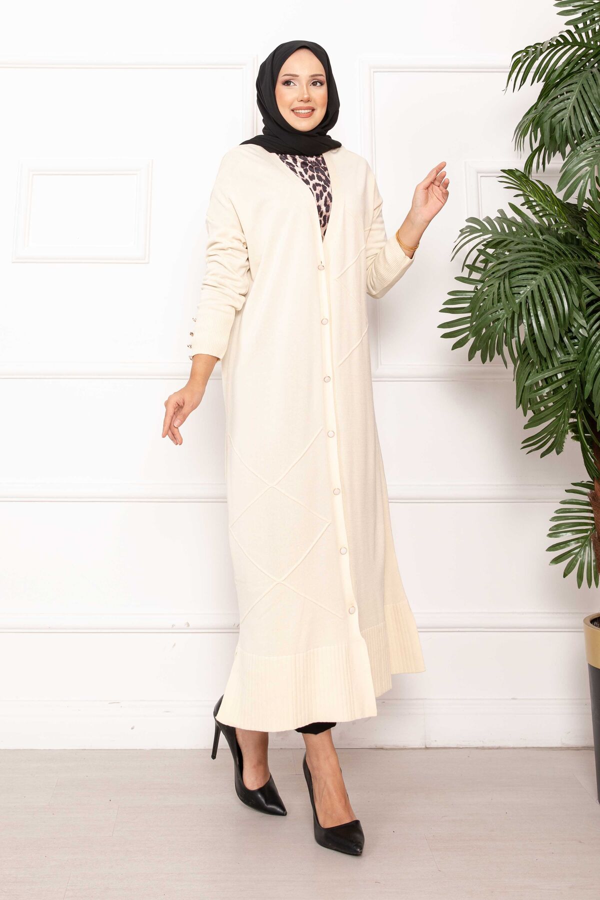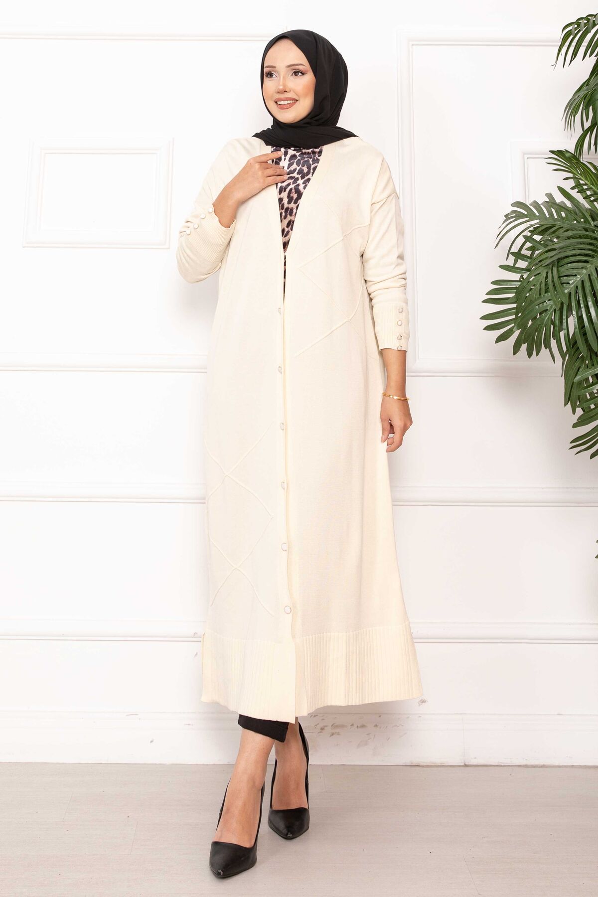 Sedef Düğmeli Uzun Triko Hırka Ekru