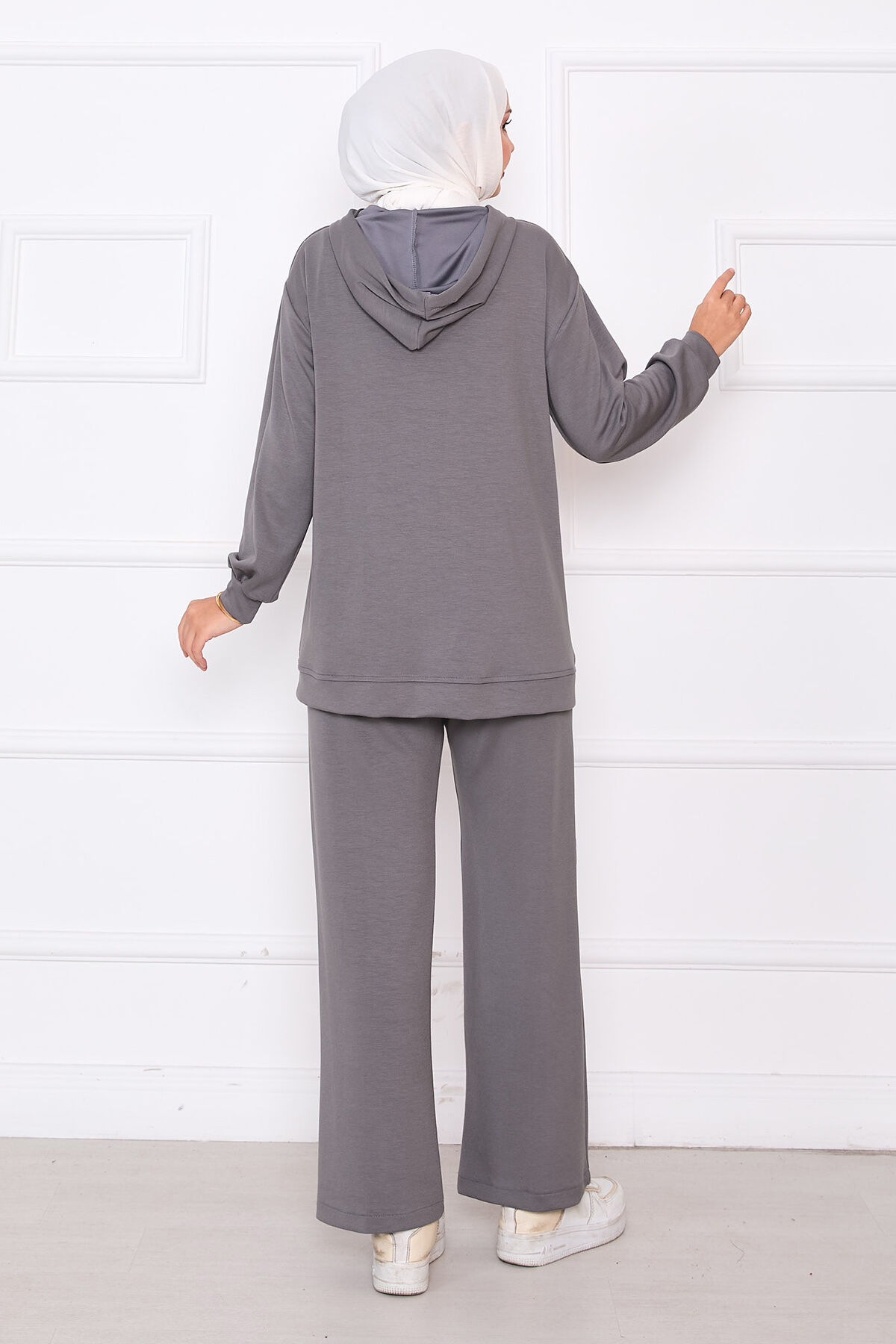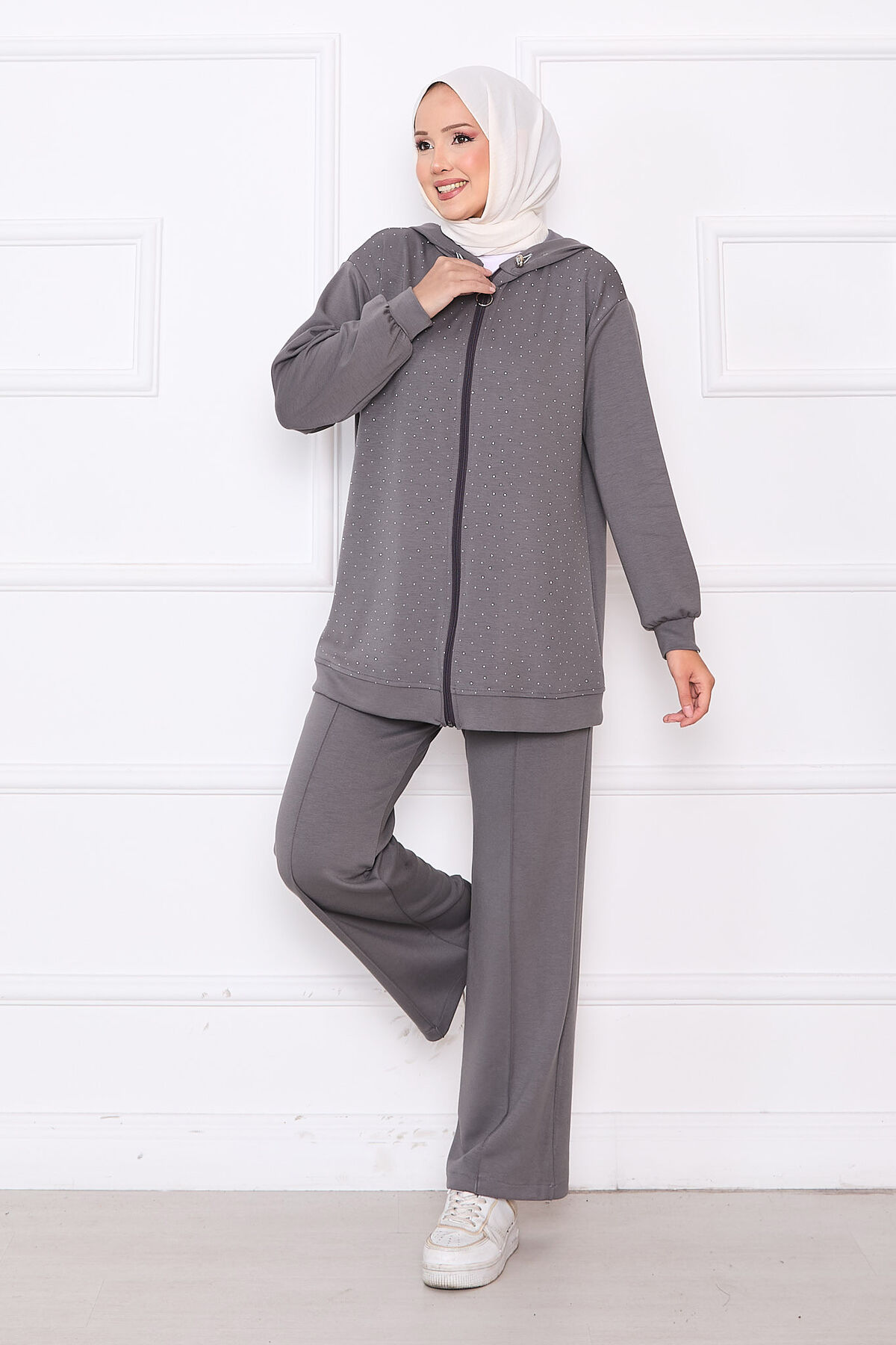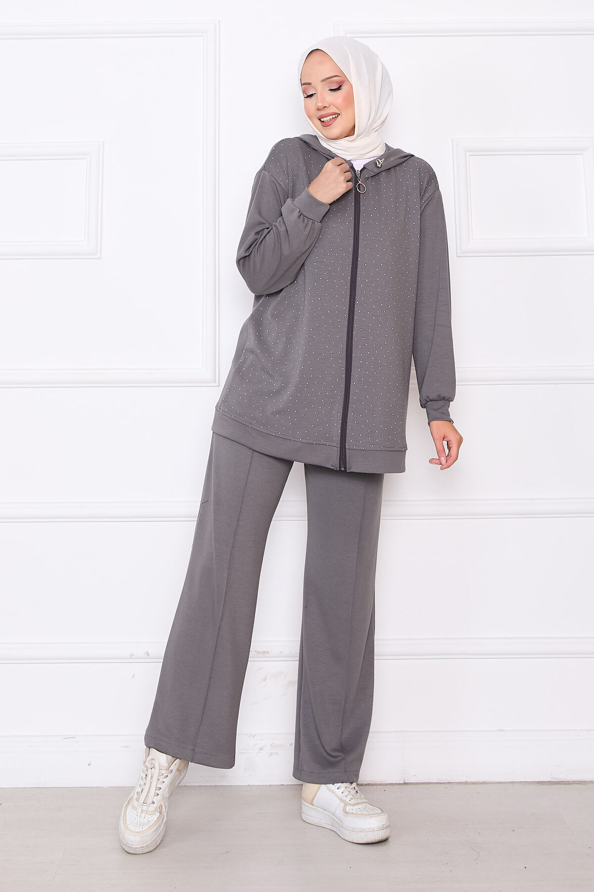 Serpme Taşlı Fermuarlı Oyşo İkili Takım Gri