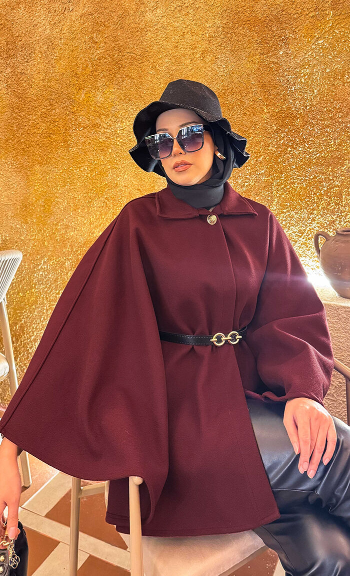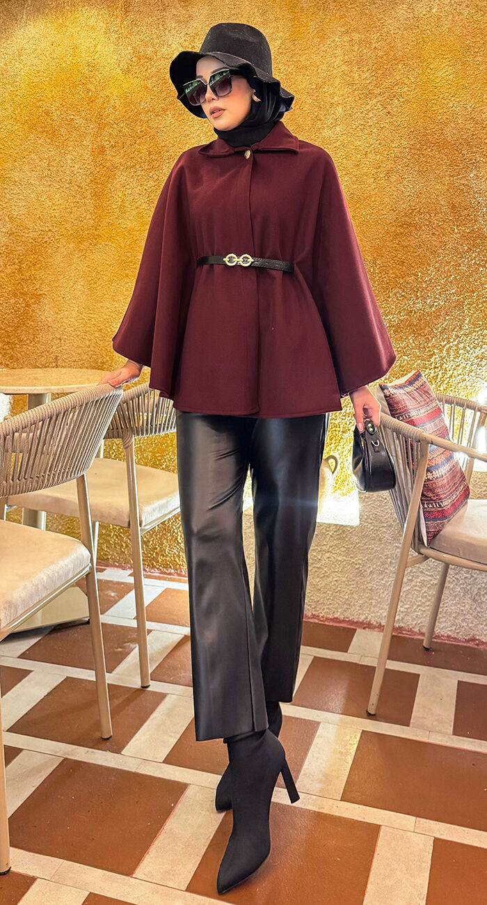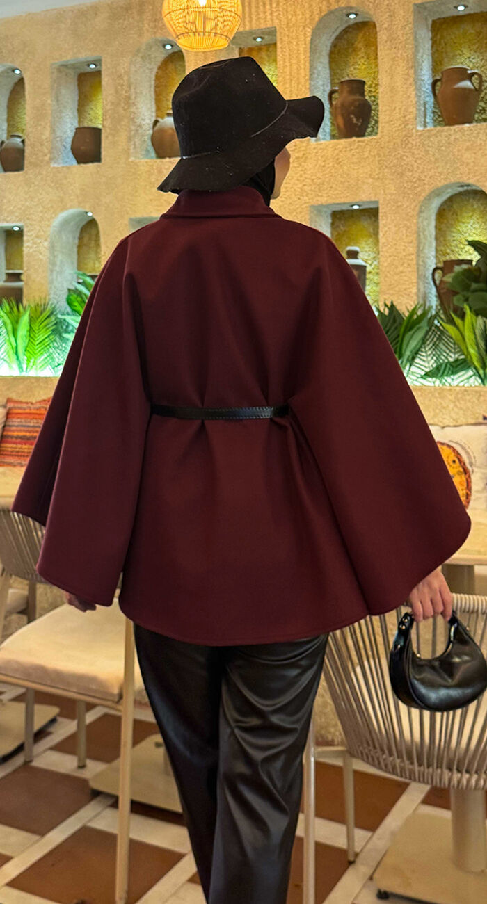 Seyyar Kemerli Düğme Detaylı Tesettür Kaşe Panço Bordo
