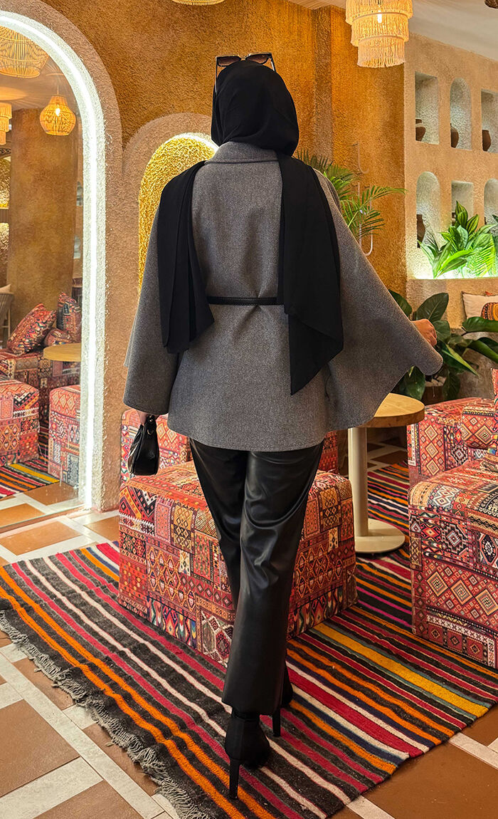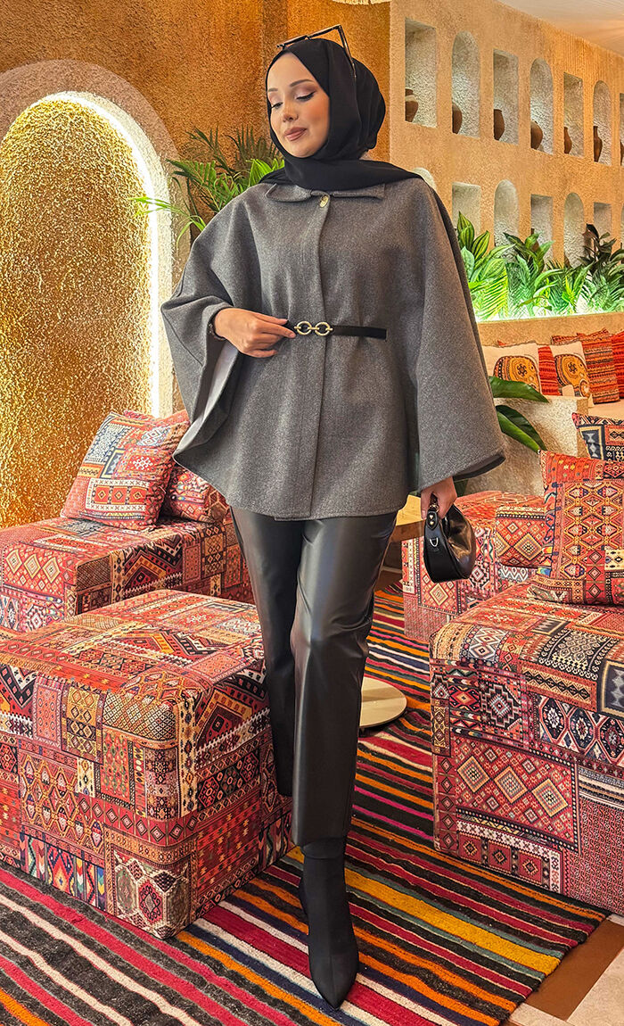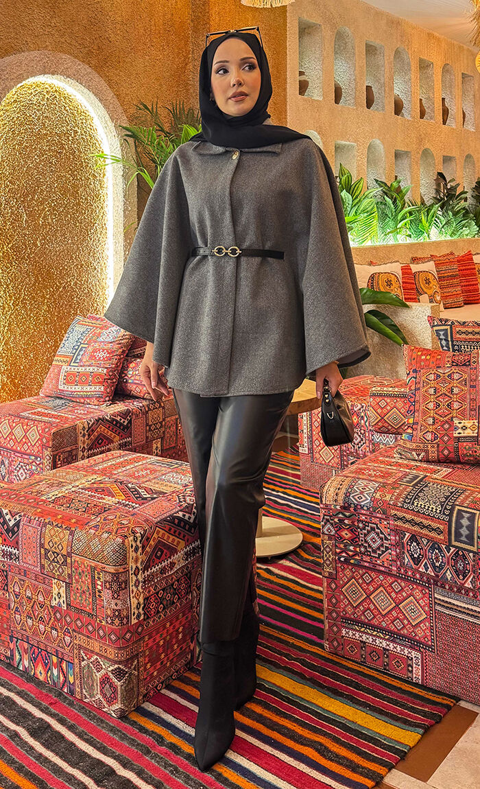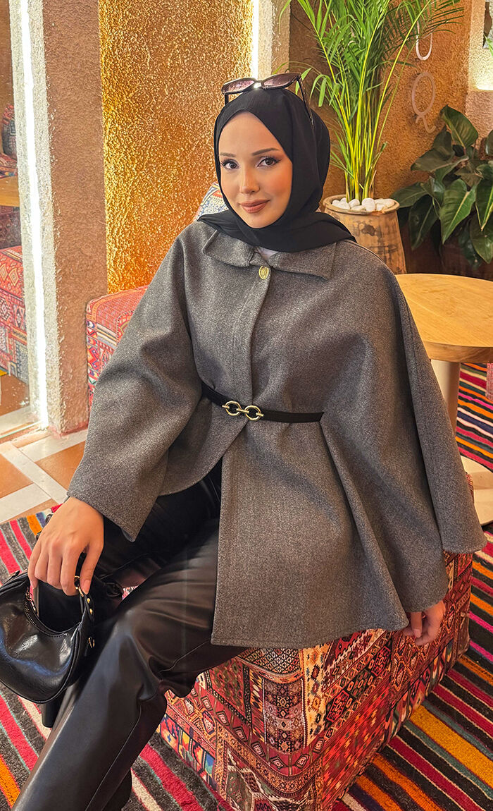 Seyyar Kemerli Düğme Detaylı Tesettür Kaşe Panço Gri