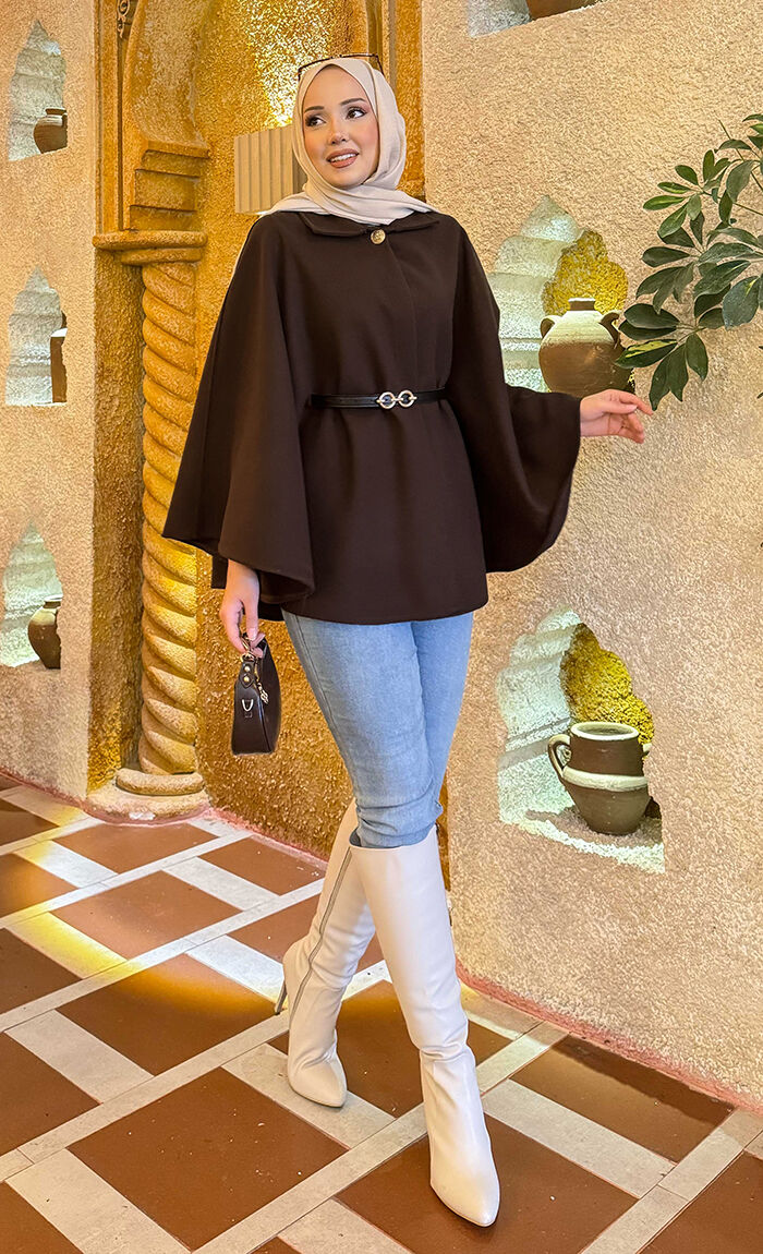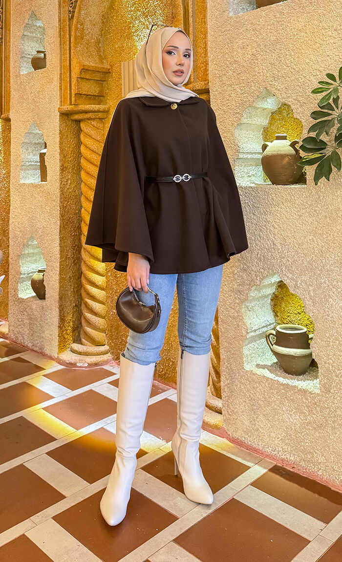 Seyyar Kemerli Düğme Detaylı Tesettür Kaşe Panço Kahve