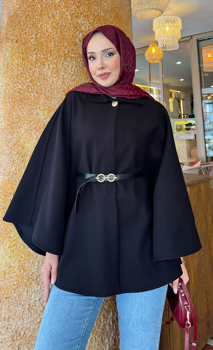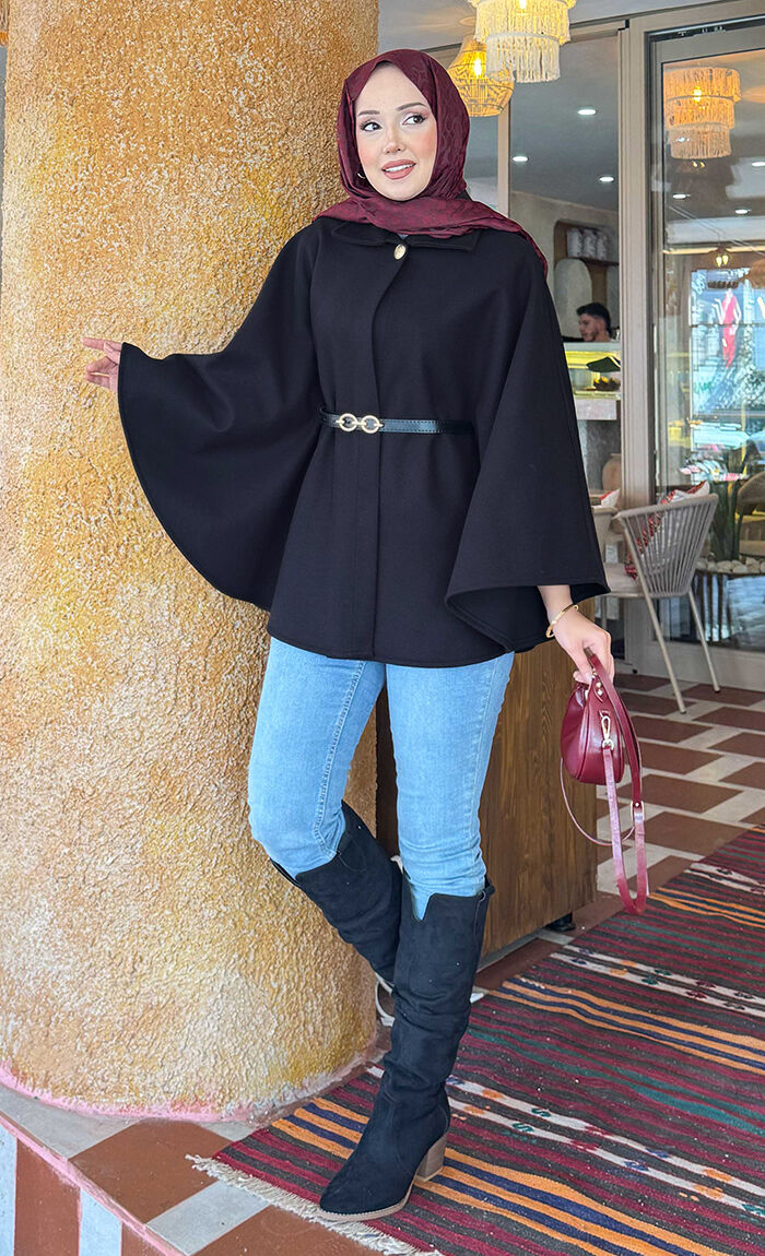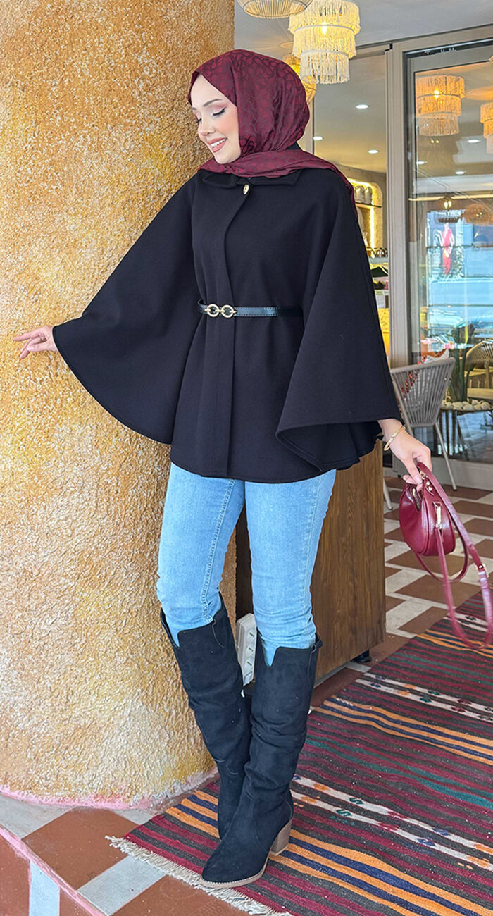 Seyyar Kemerli Düğme Detaylı Tesettür Kaşe Panço Siyah