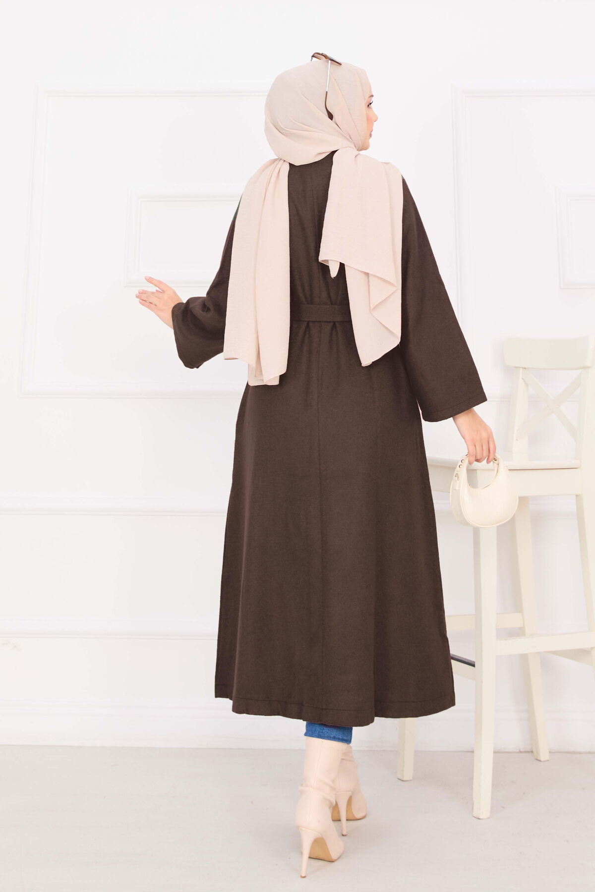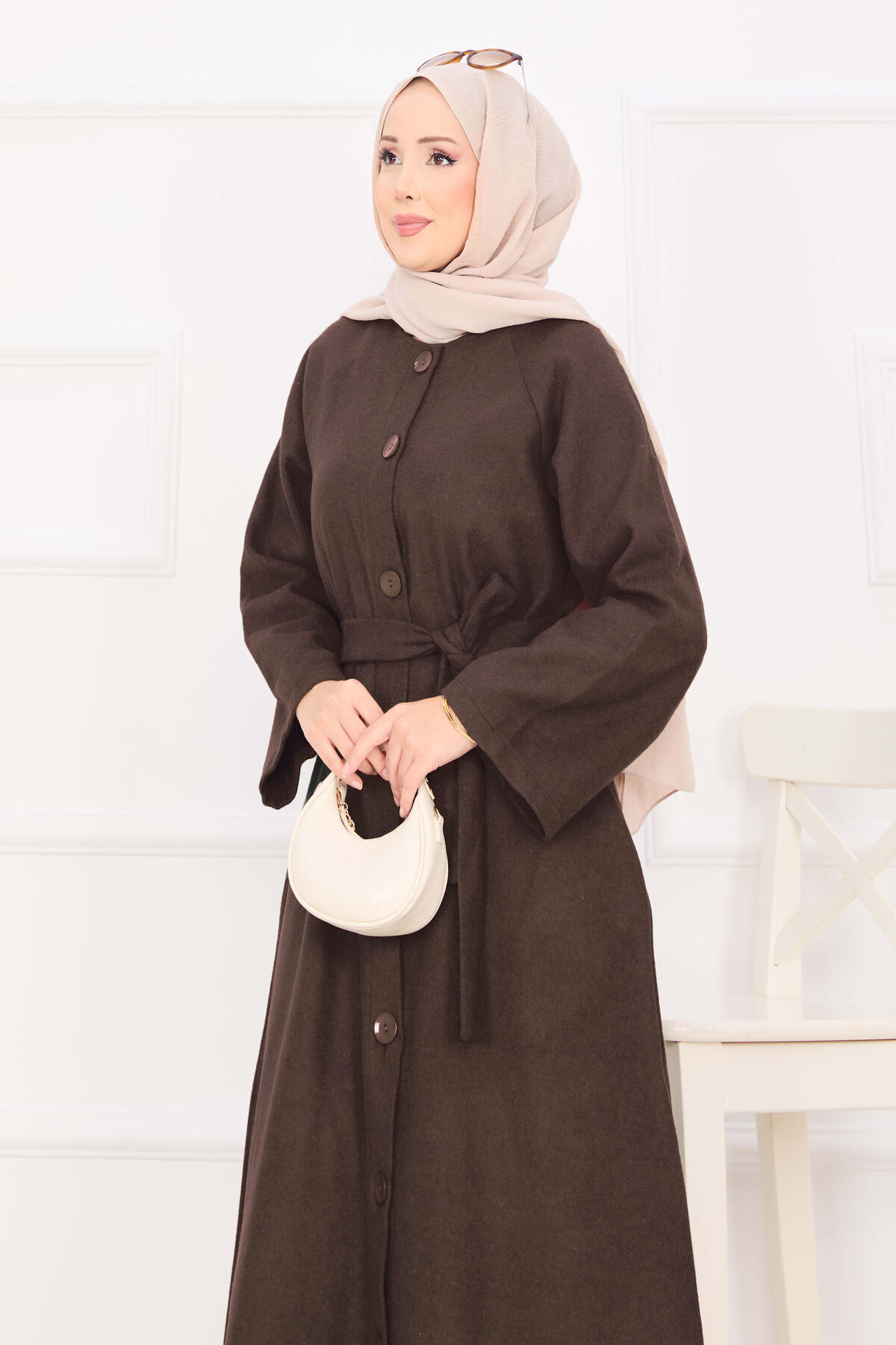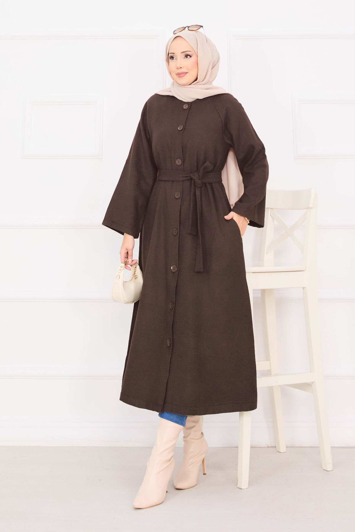 Seyyar Kuşaklı Düğmeli Kaşe Kaban Kahve