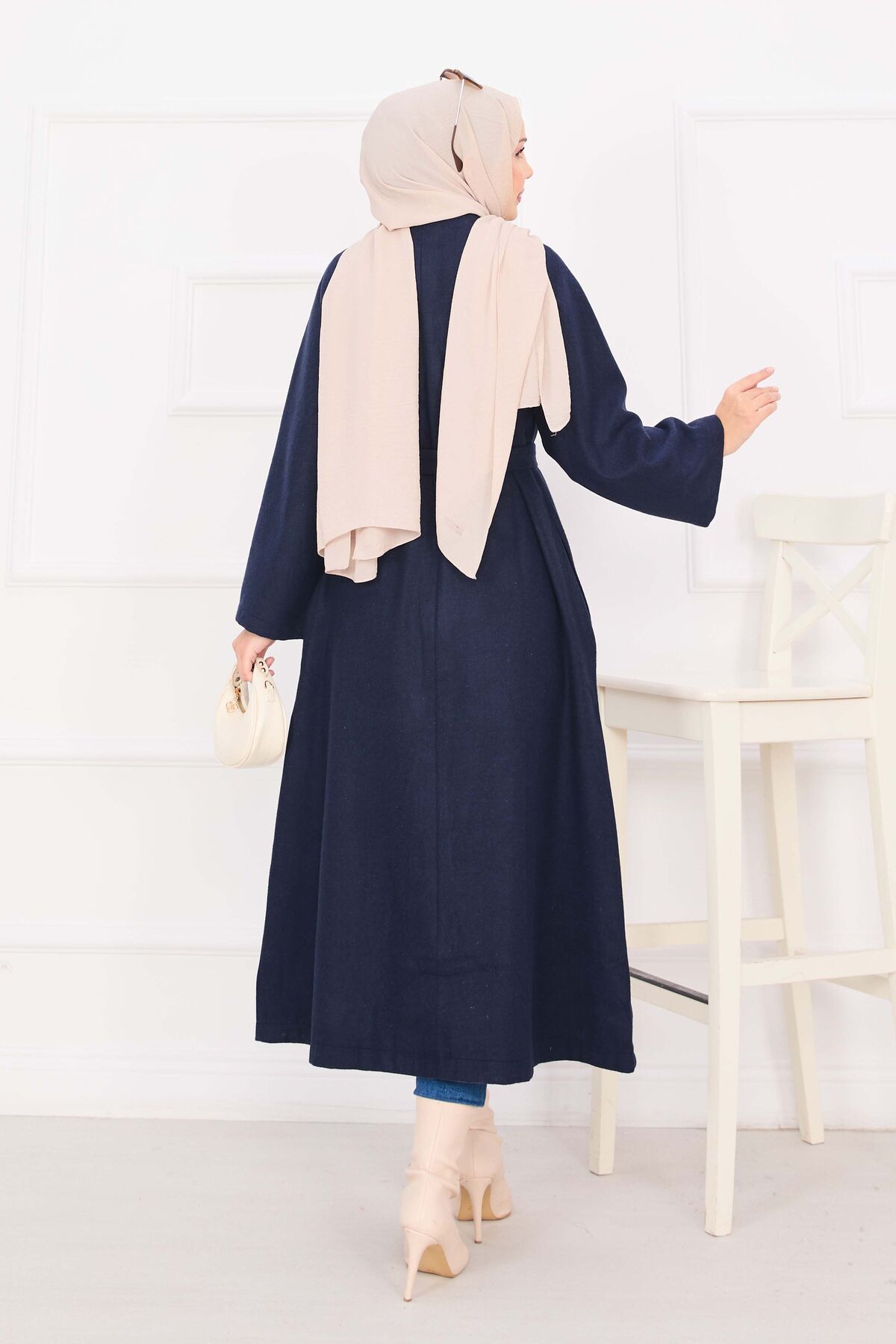 Seyyar Kuşaklı Düğmeli Kaşe Kaban Lacivert