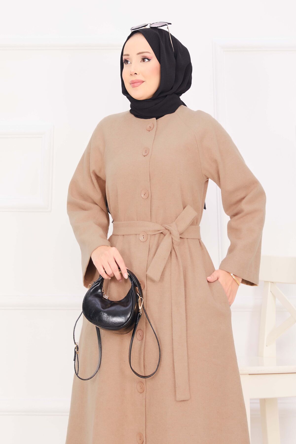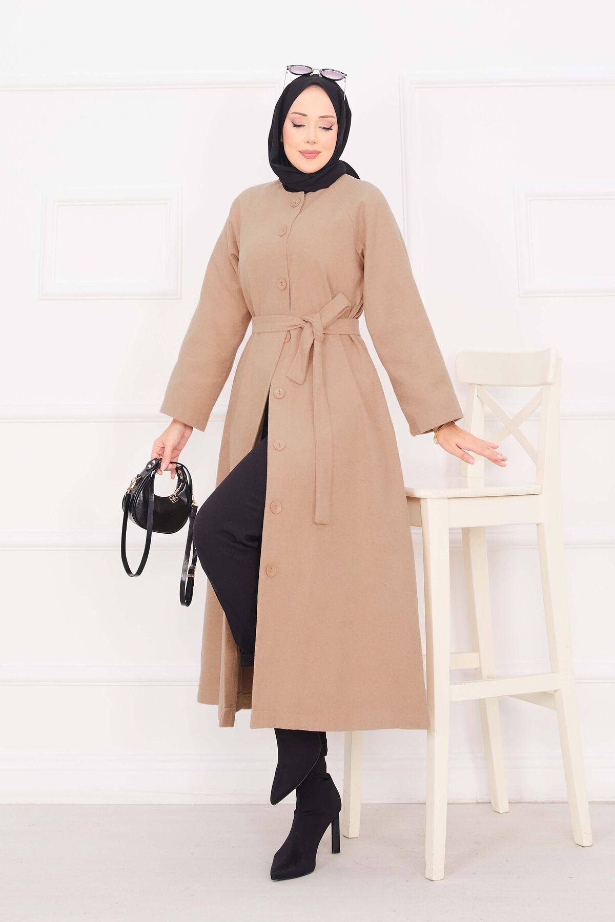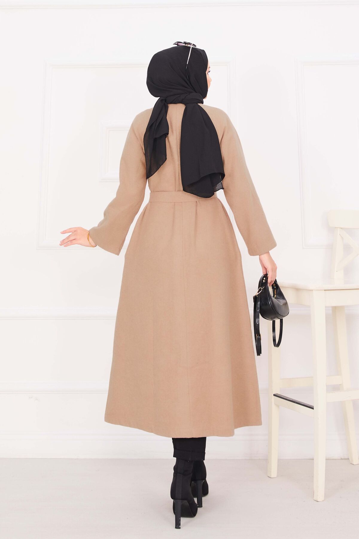 Seyyar Kuşaklı Düğmeli Kaşe Kaban Vizon