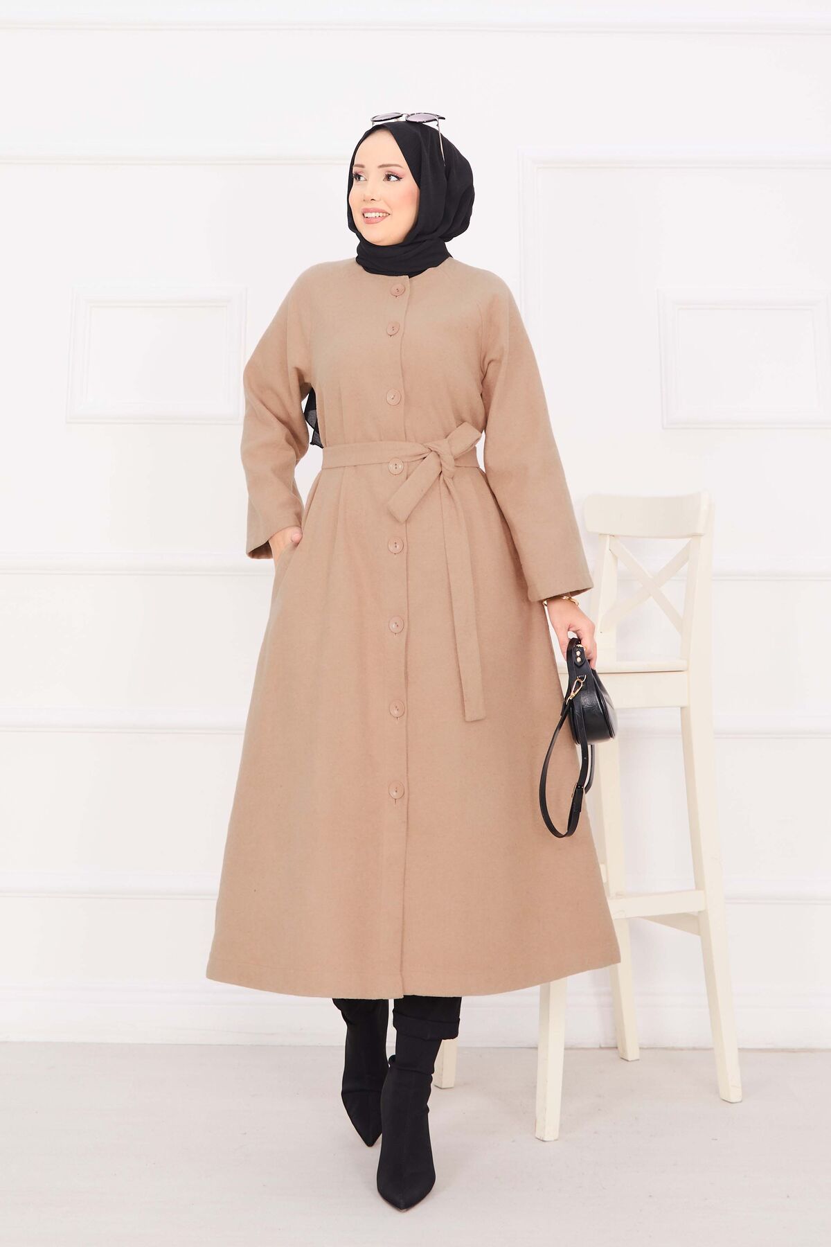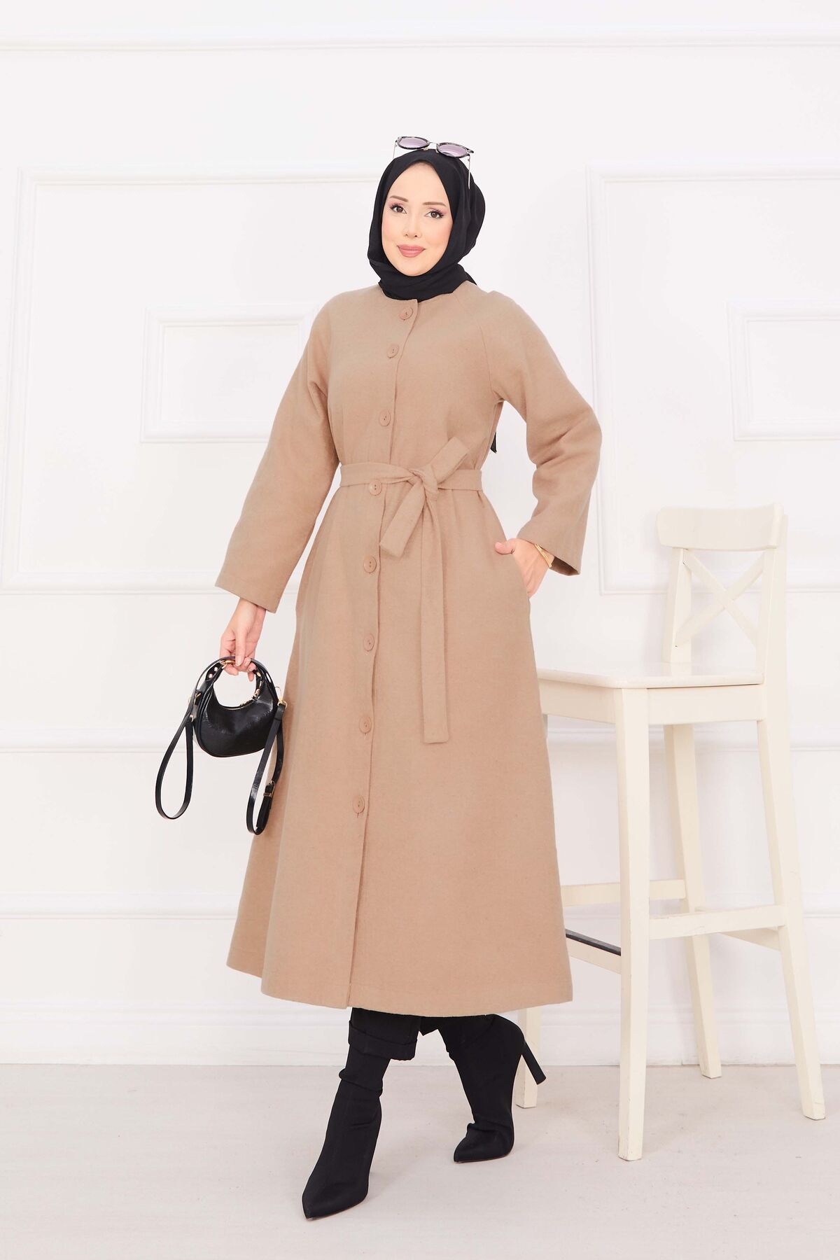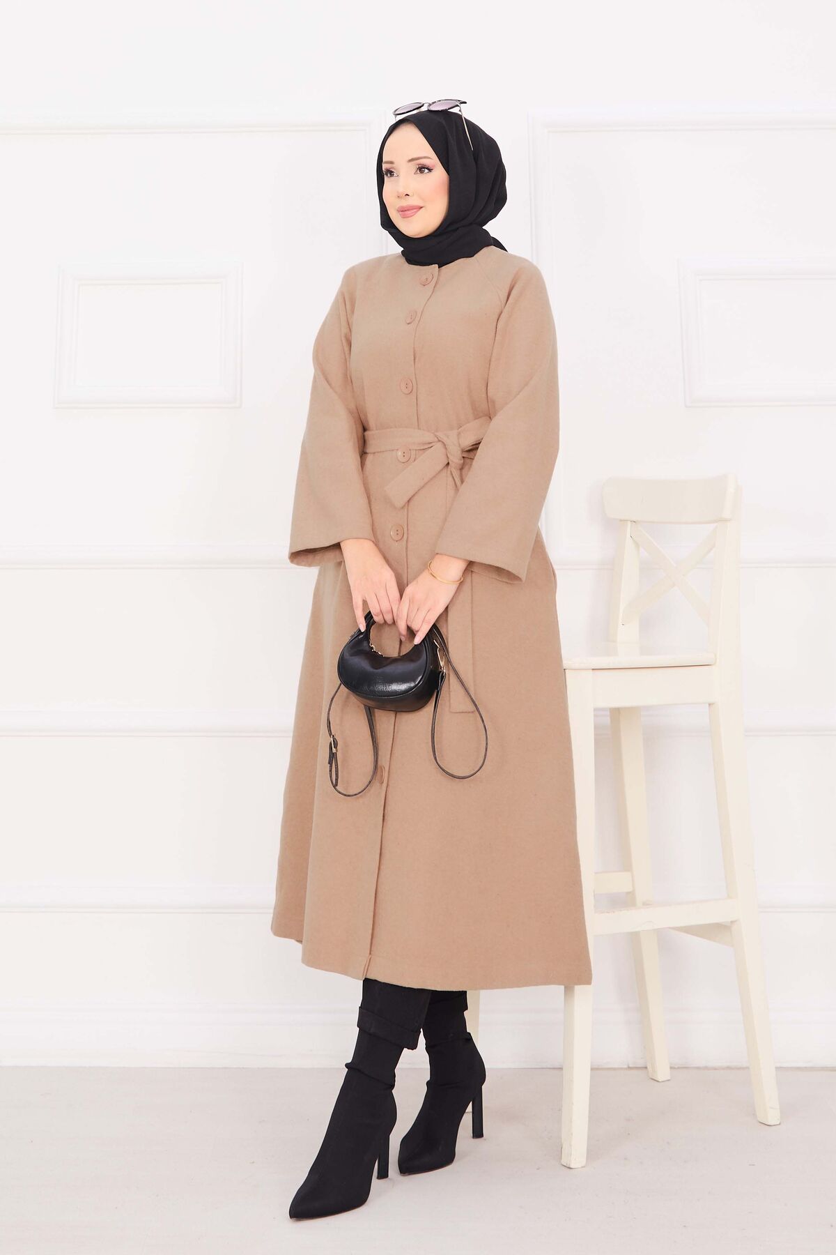 Seyyar Kuşaklı Düğmeli Kaşe Kaban Vizon