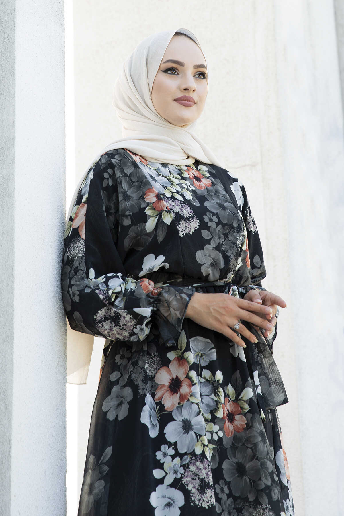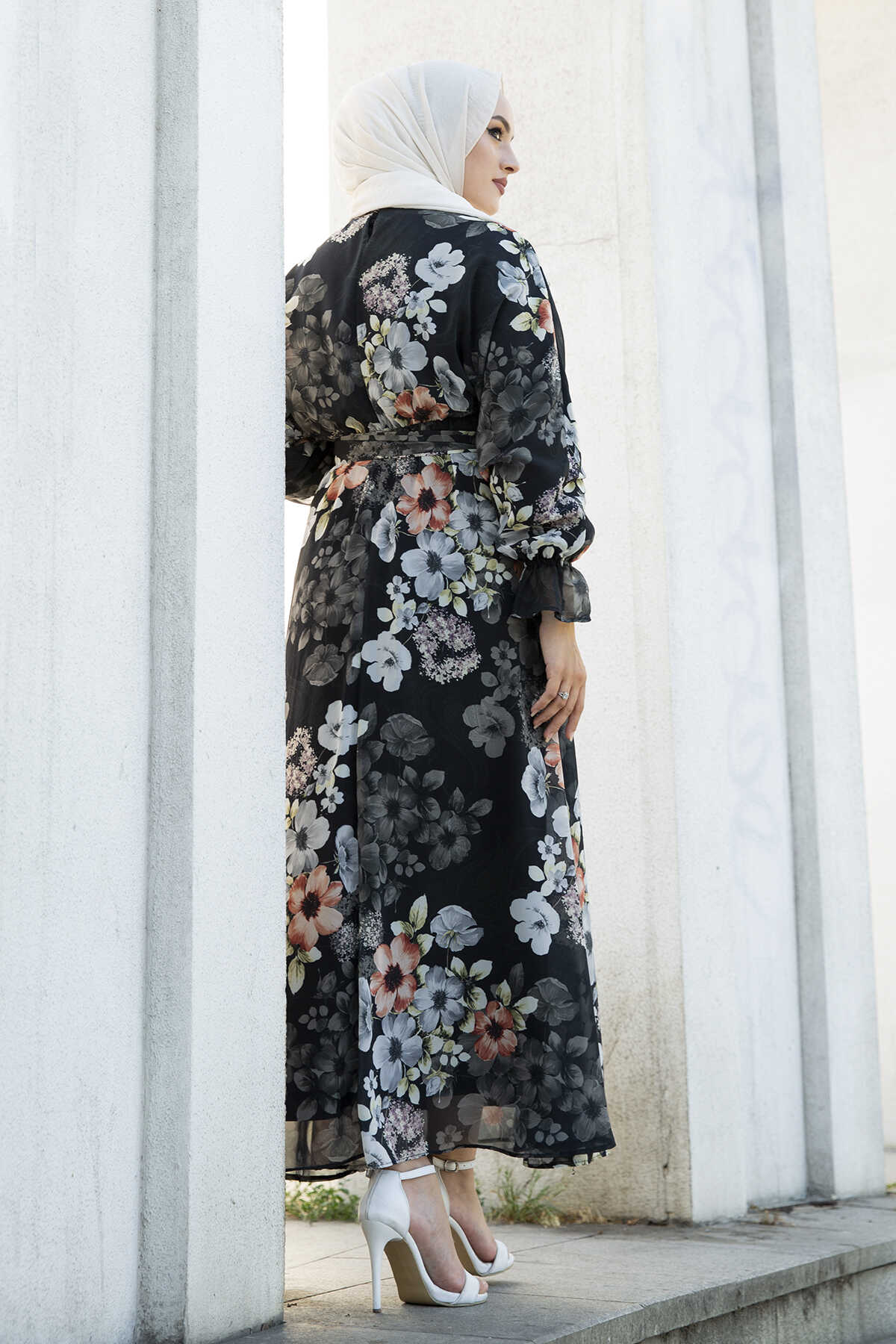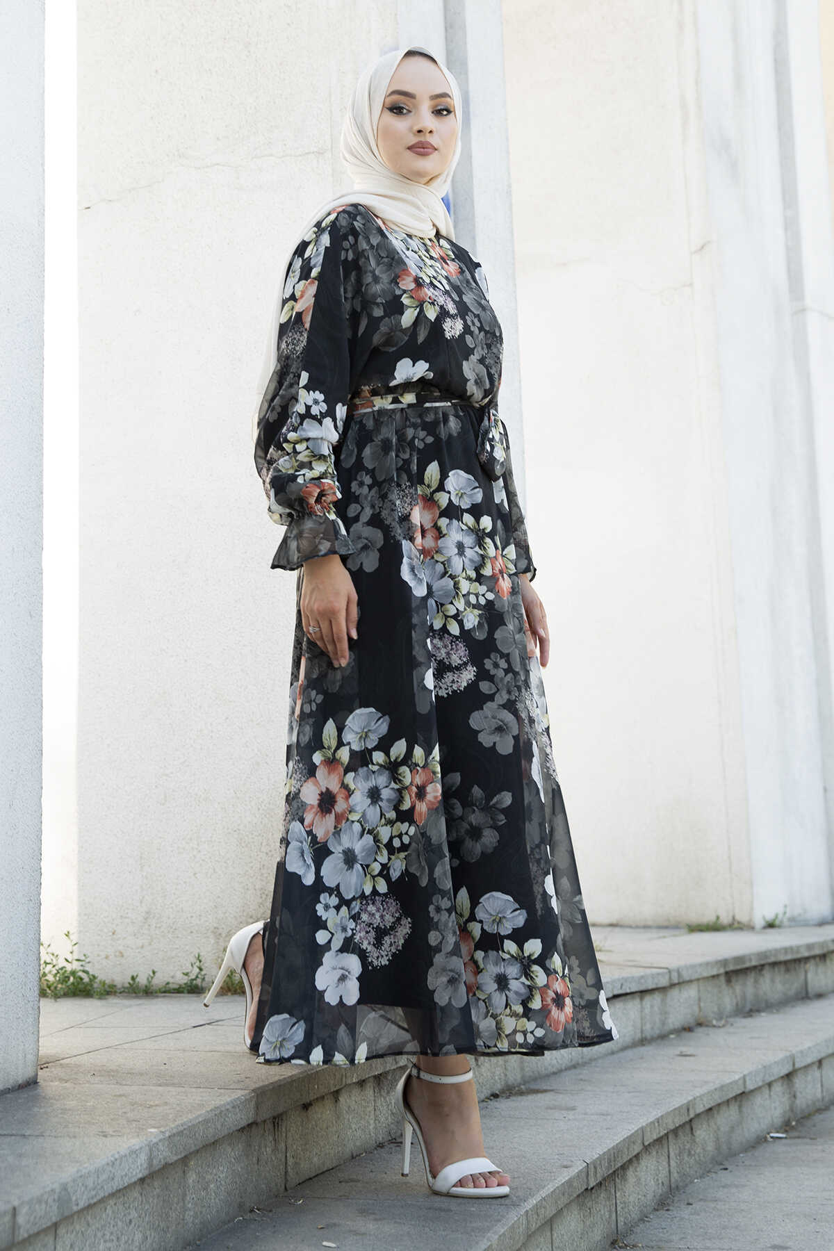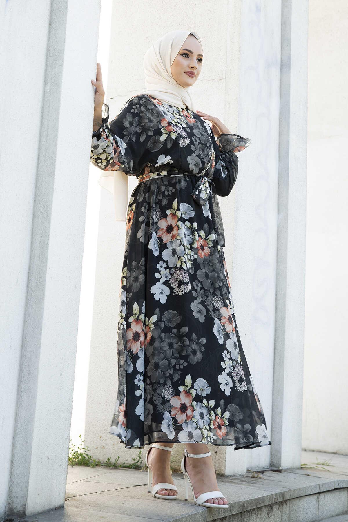 Çiçekli Şifon Tesettür Elbise 100MD11498-1
