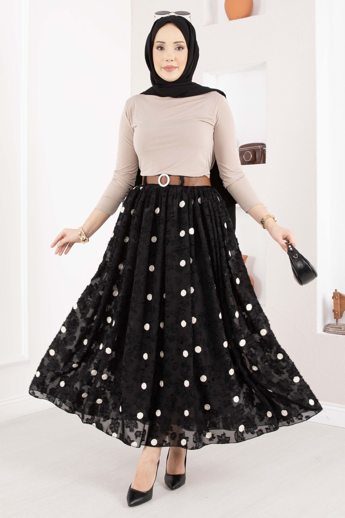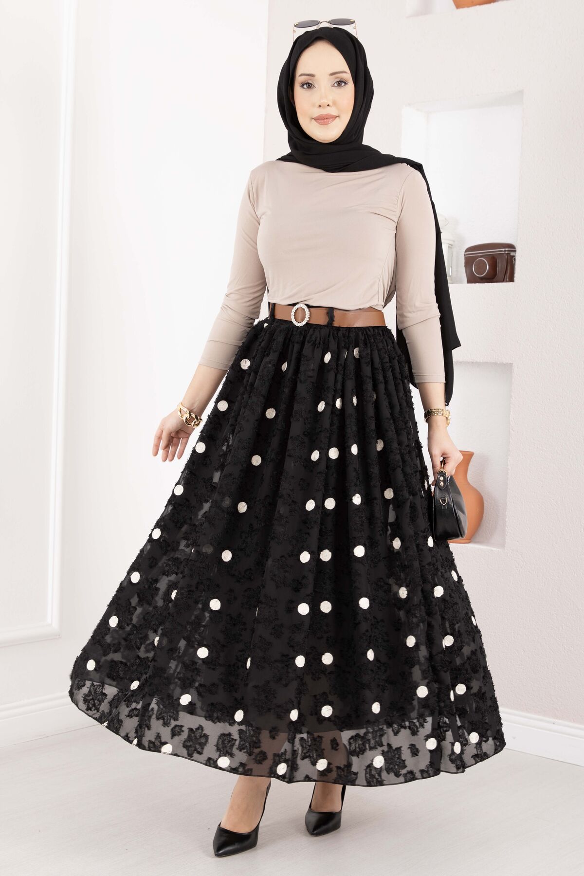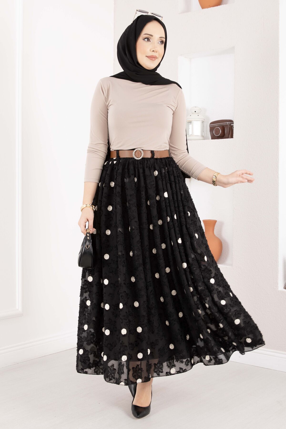 Şifon Puantiyeli Balon Etek Siyah