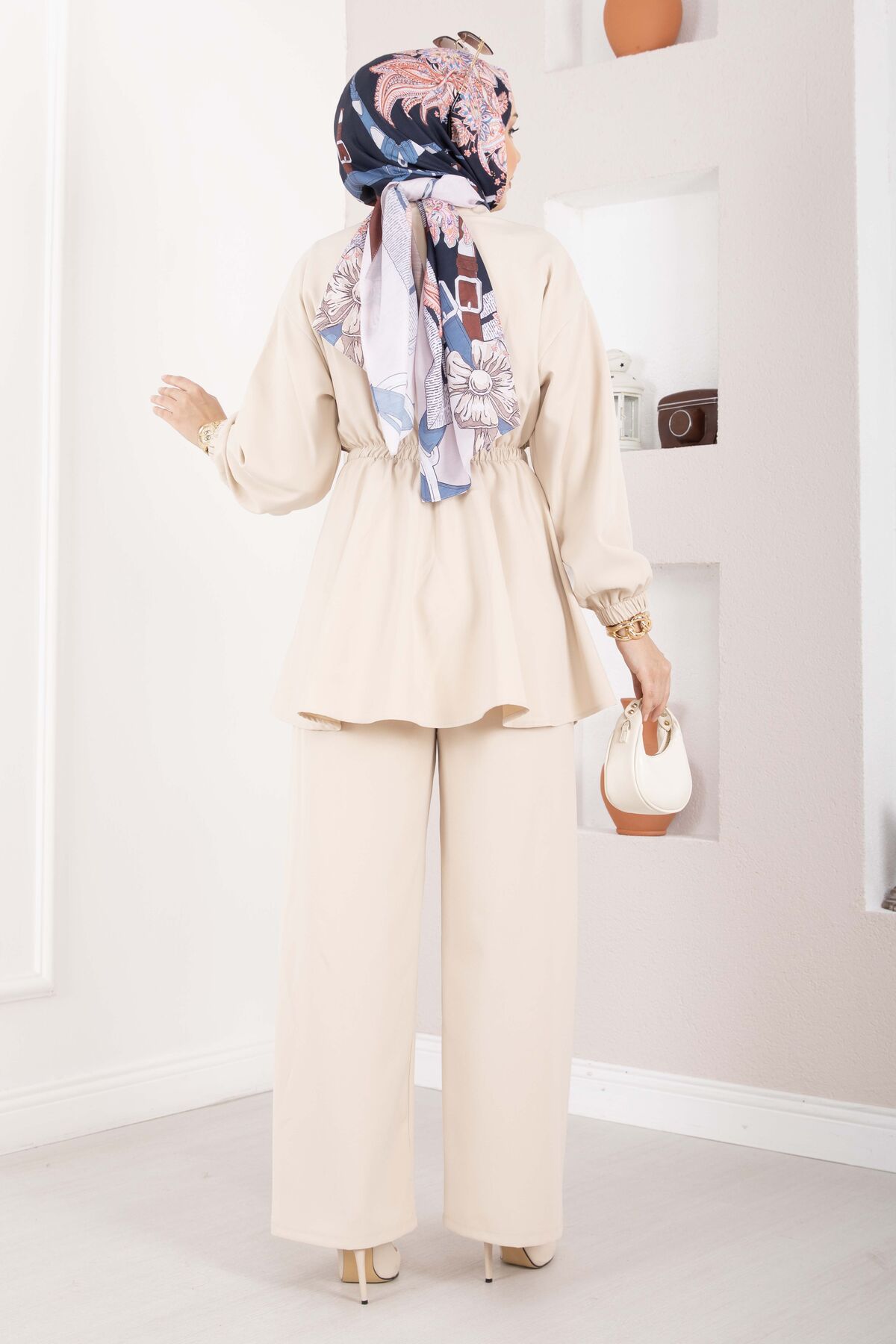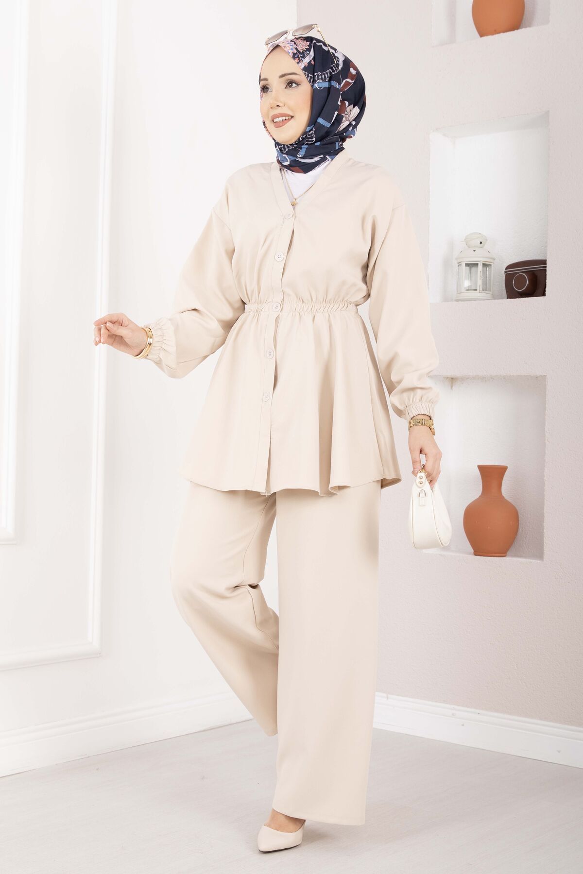 Tunik ve pantolon olmak üzere iki parçadan oluşur