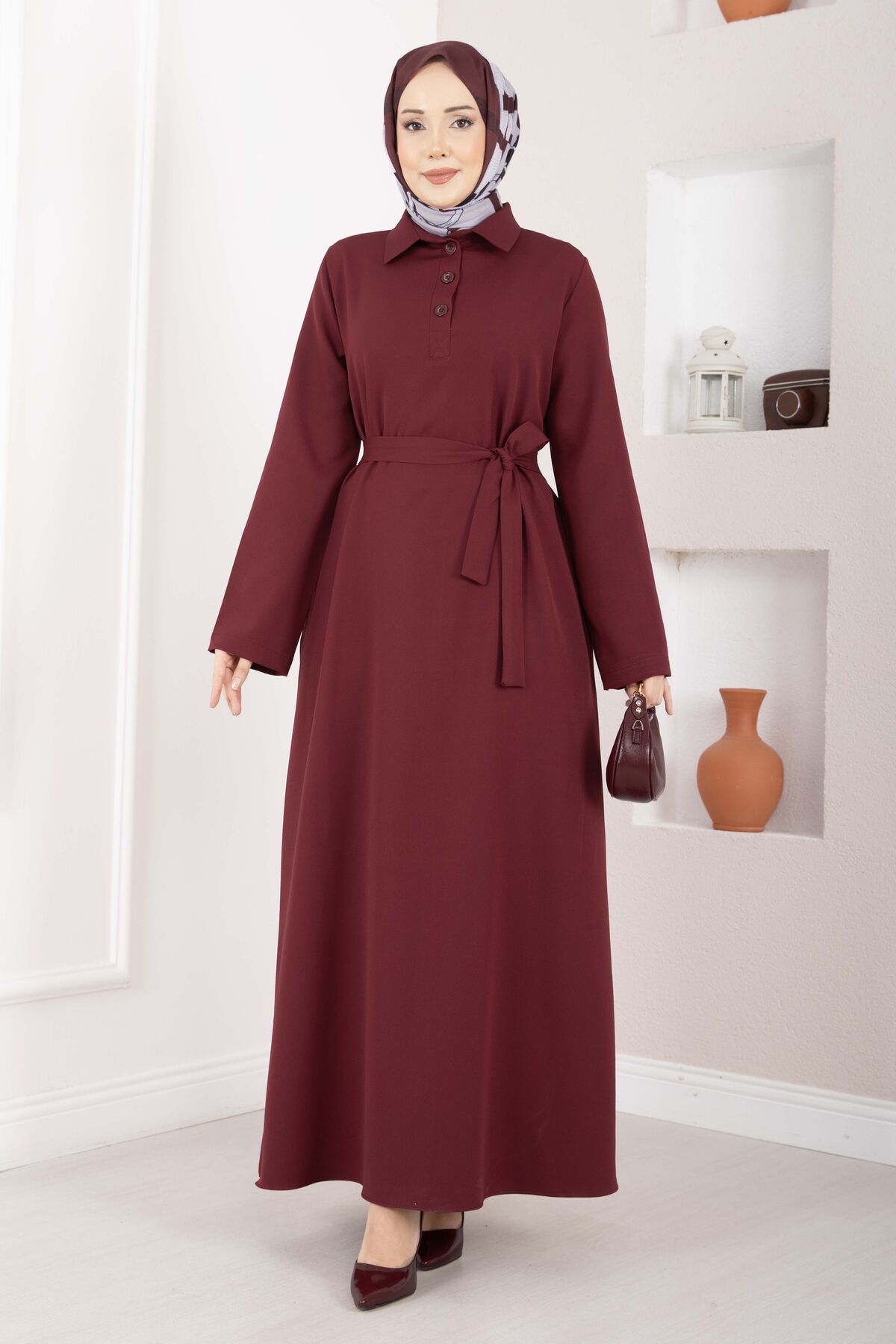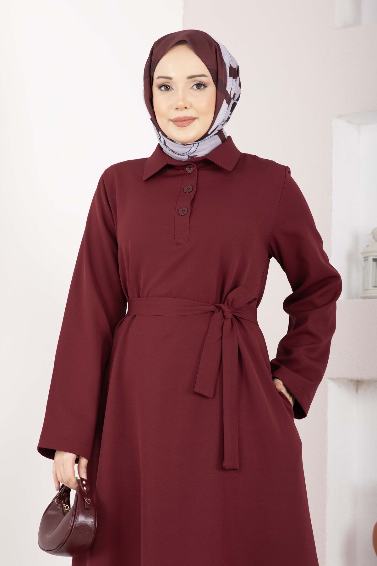 Softline Yarım Düğmeli Kuşaklı Tesettür Elbise Bordo