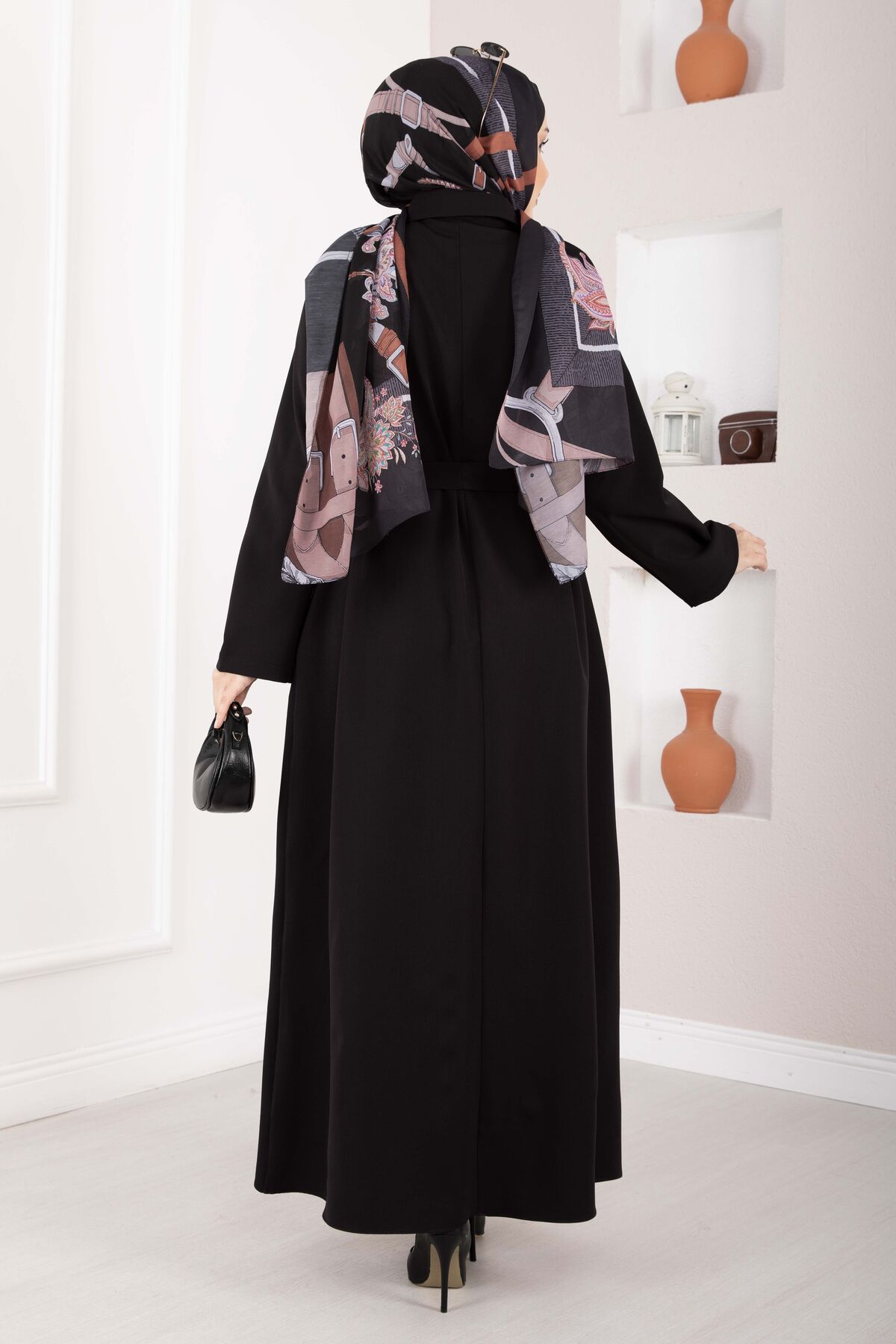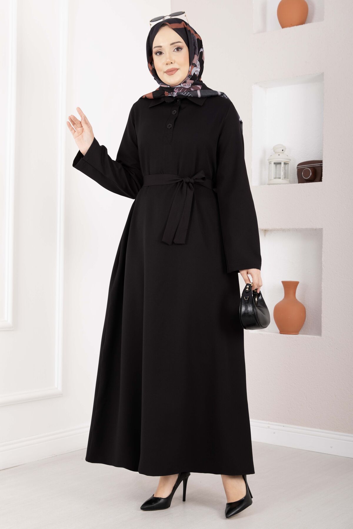 Softline Yarım Düğmeli Kuşaklı Tesettür Elbise Siyah