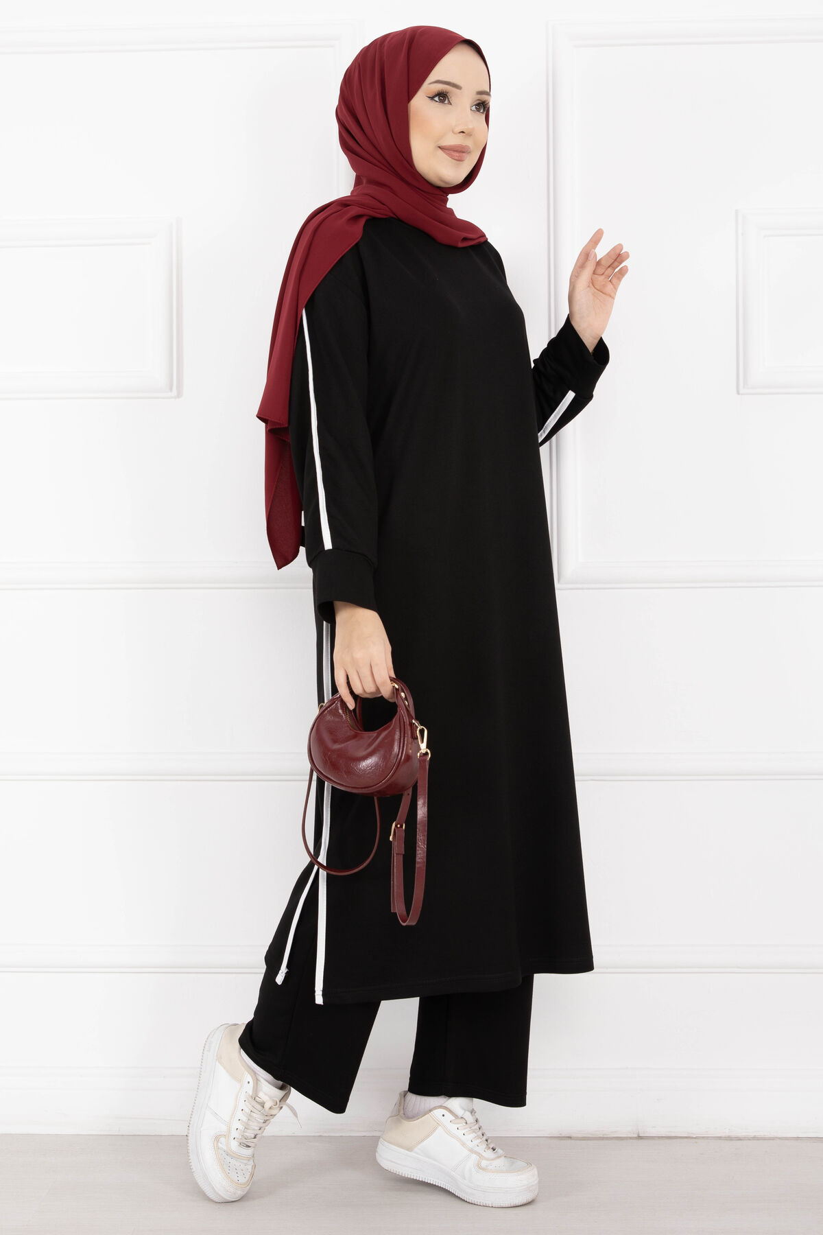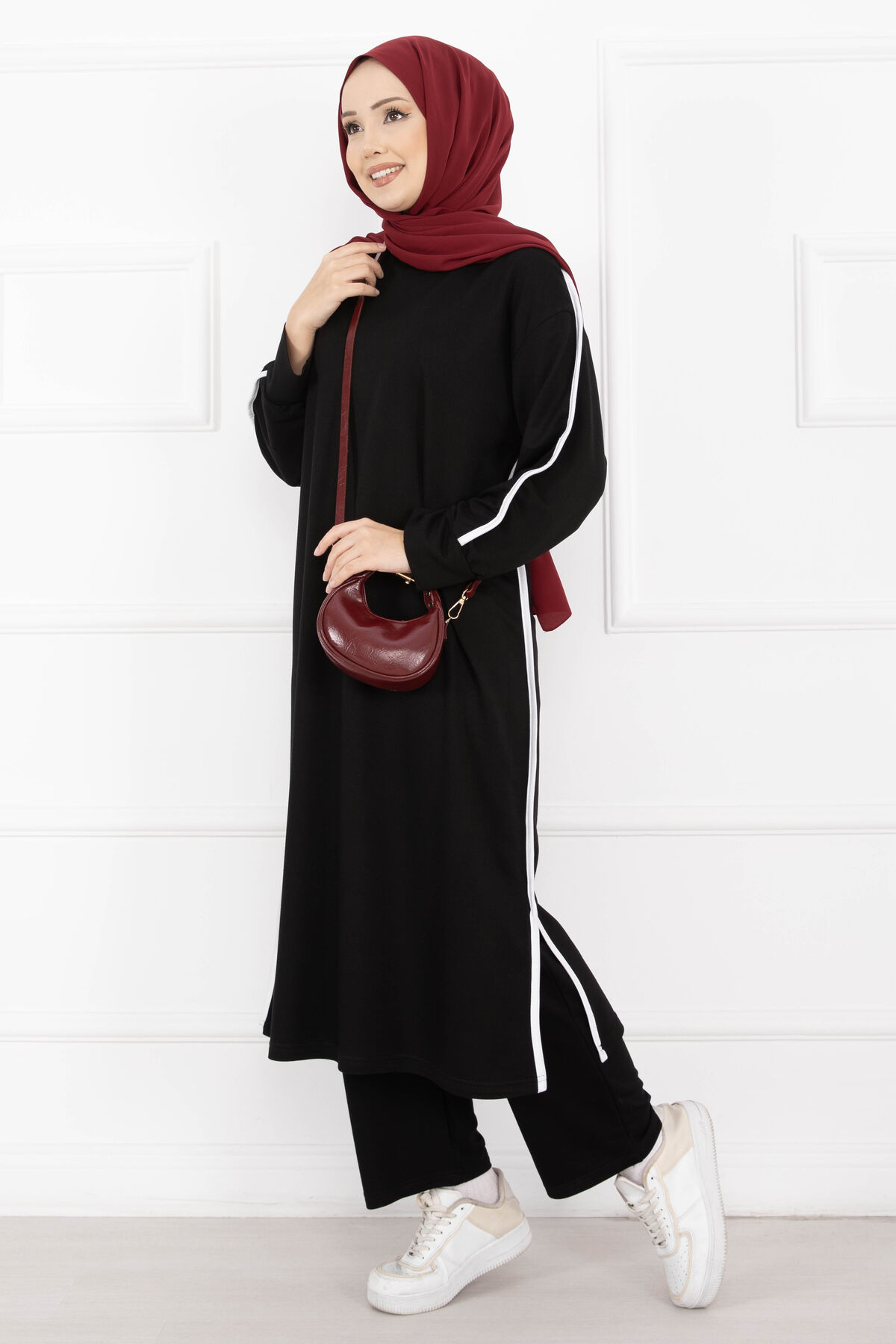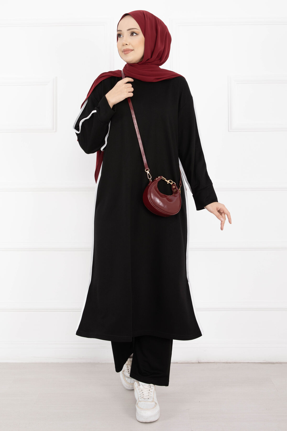 Sportif Biye Detaylı Uzun Tesettür Takım Siyah