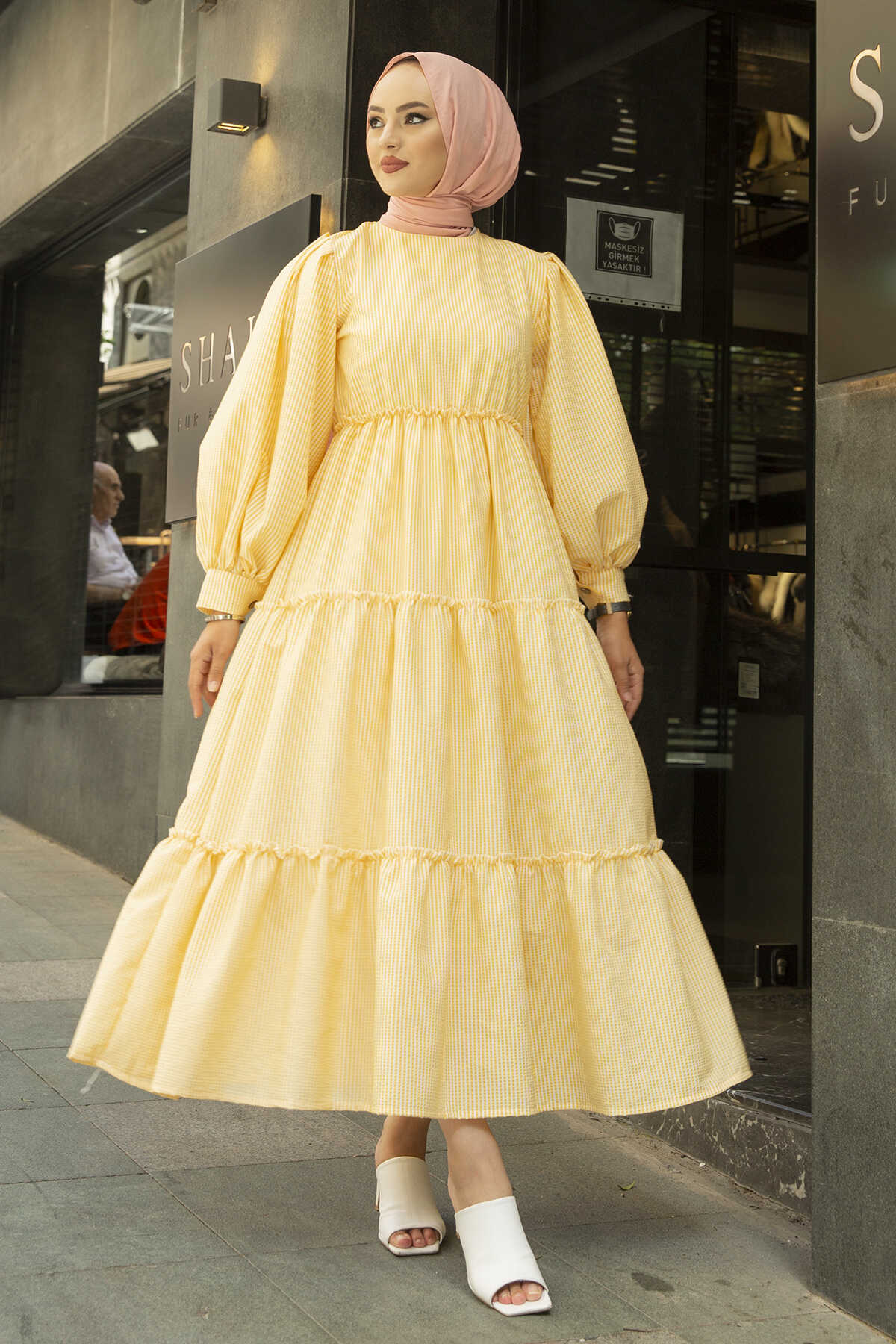 Bisiklet yaka sırttan tek düğmeli elbise.