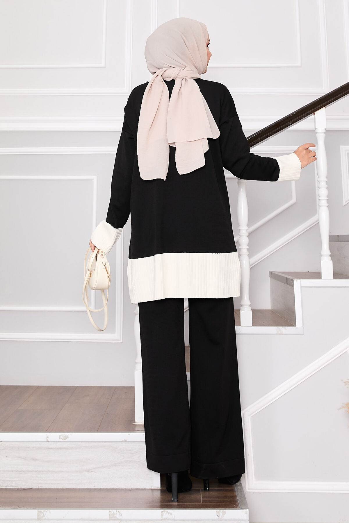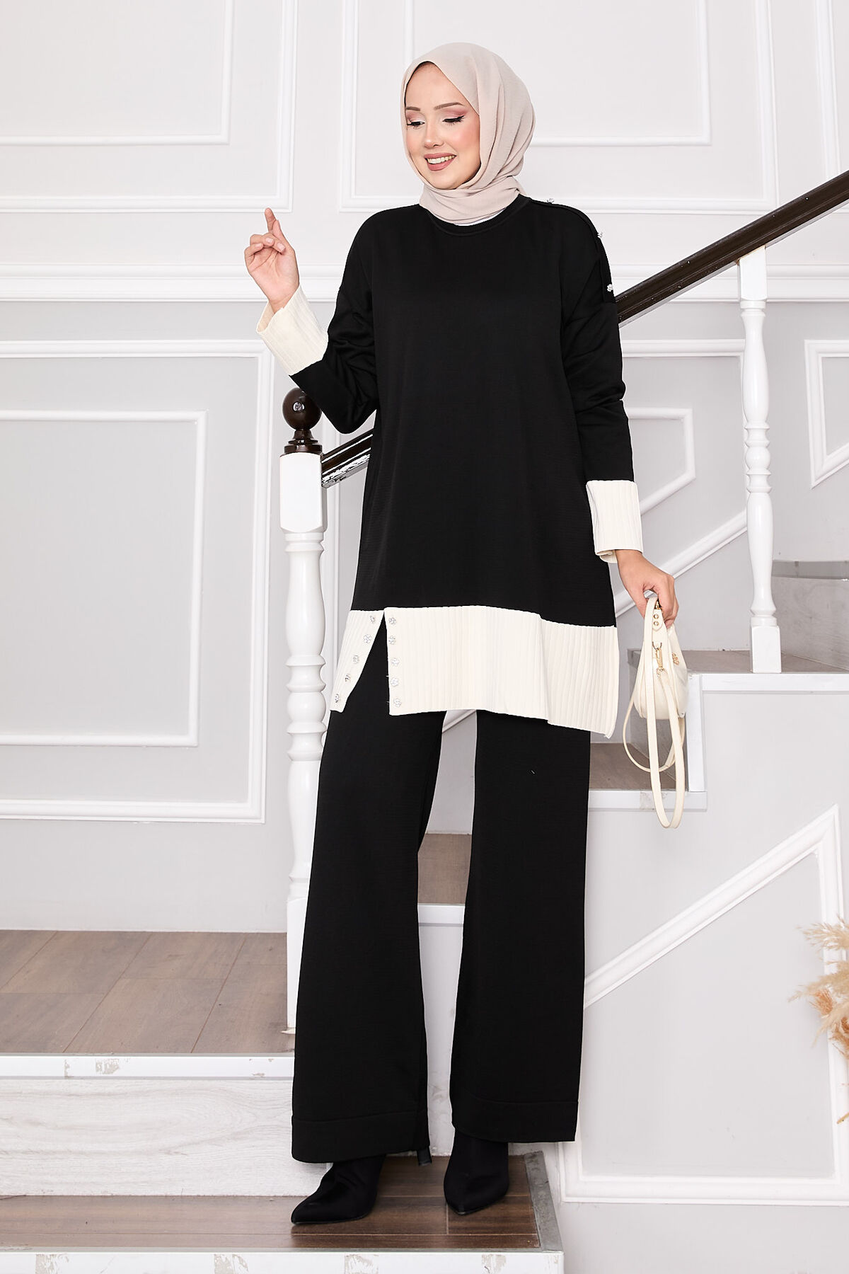 - Ürün mevsimliktir. Yeni sezon taş düğmeli iki renk triko takım tunik önden ve omuzdan taşlı pantolon belden lastikli.