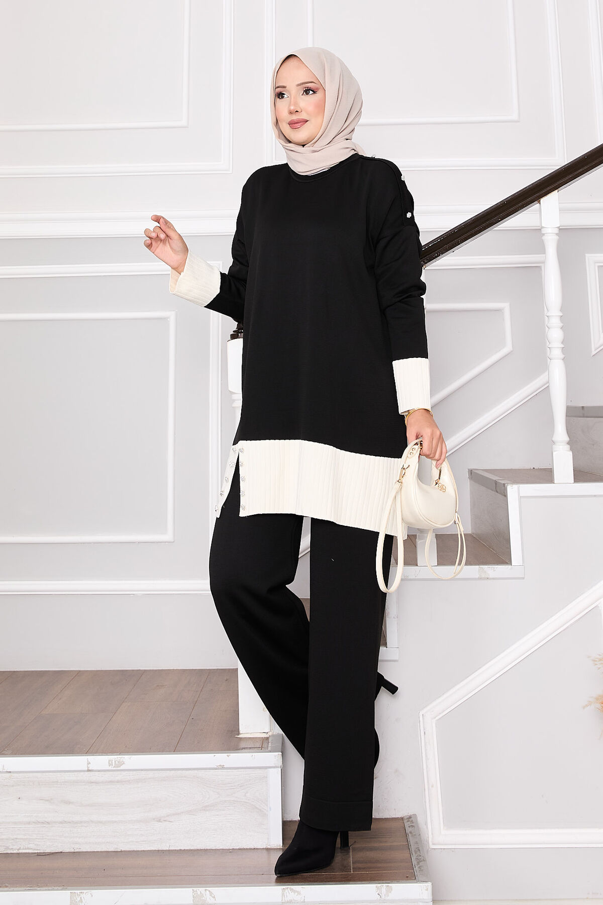 Taş Düğmeli İki Renk Triko Takım Siyah