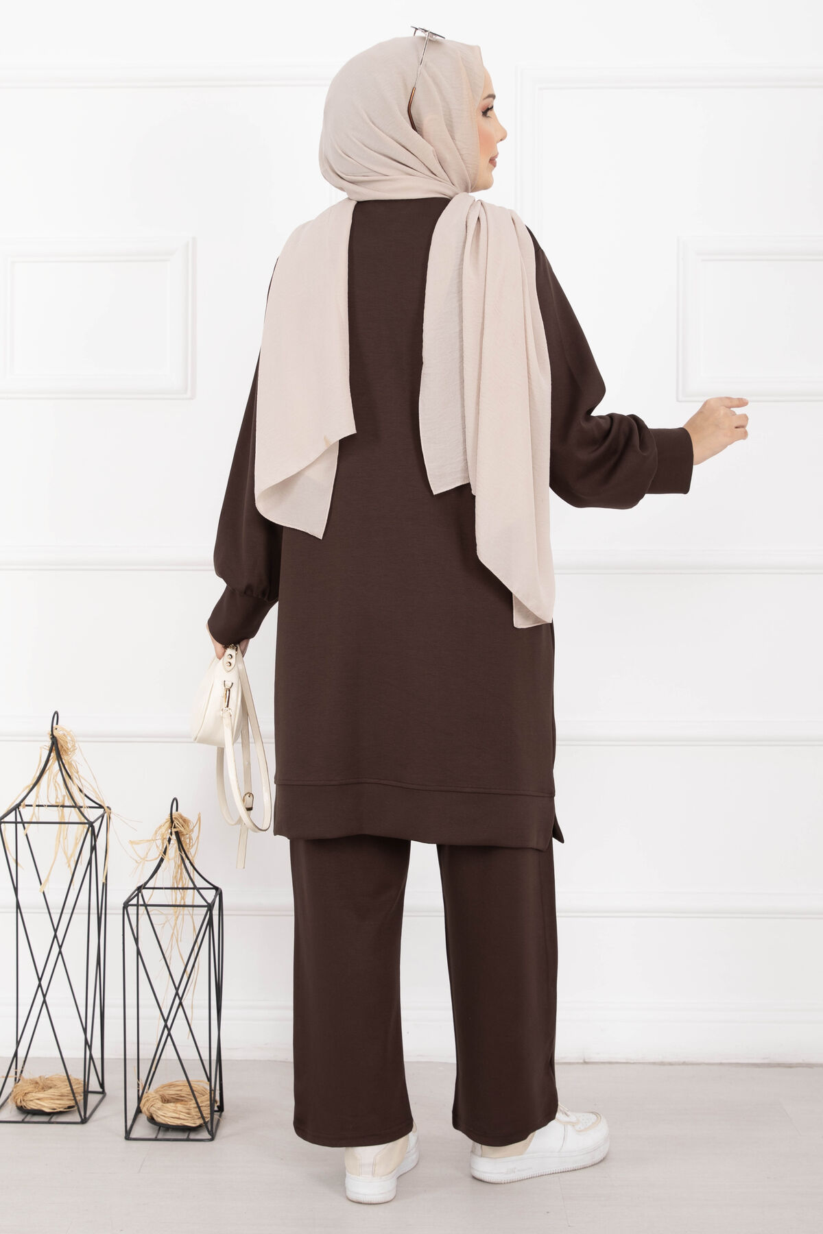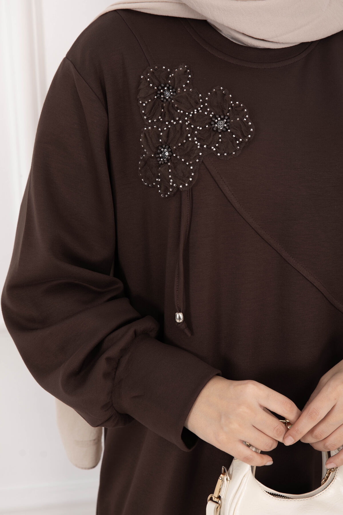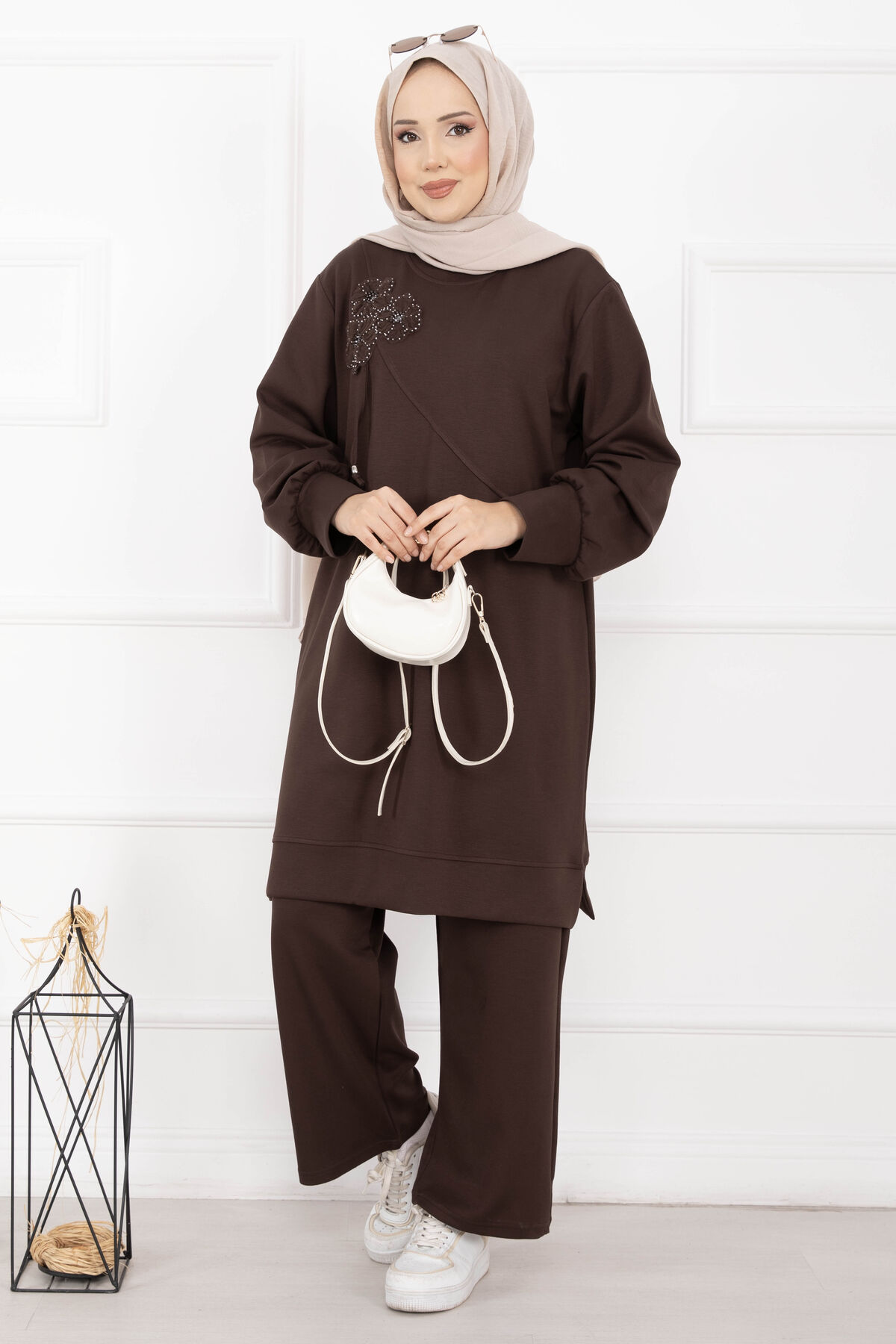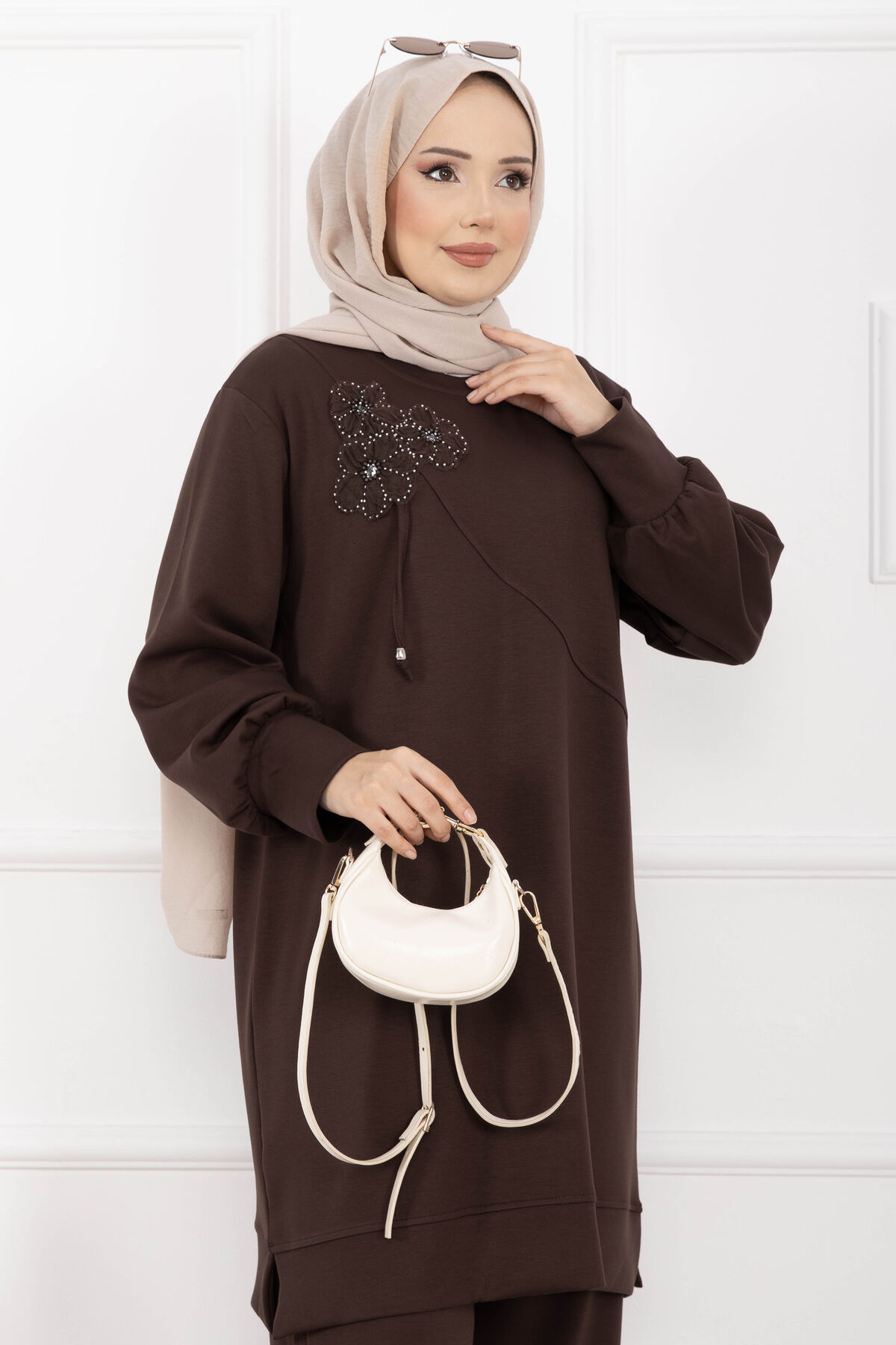 Taş İşleme Çiçek Detaylı Tesettür İkili Takım Kahve