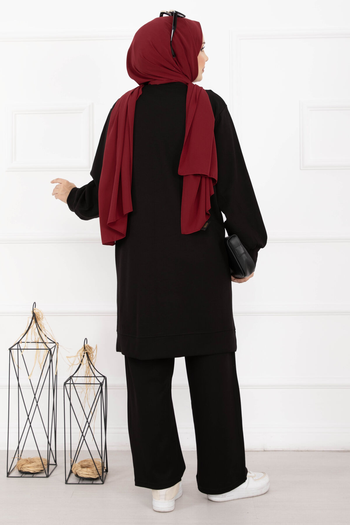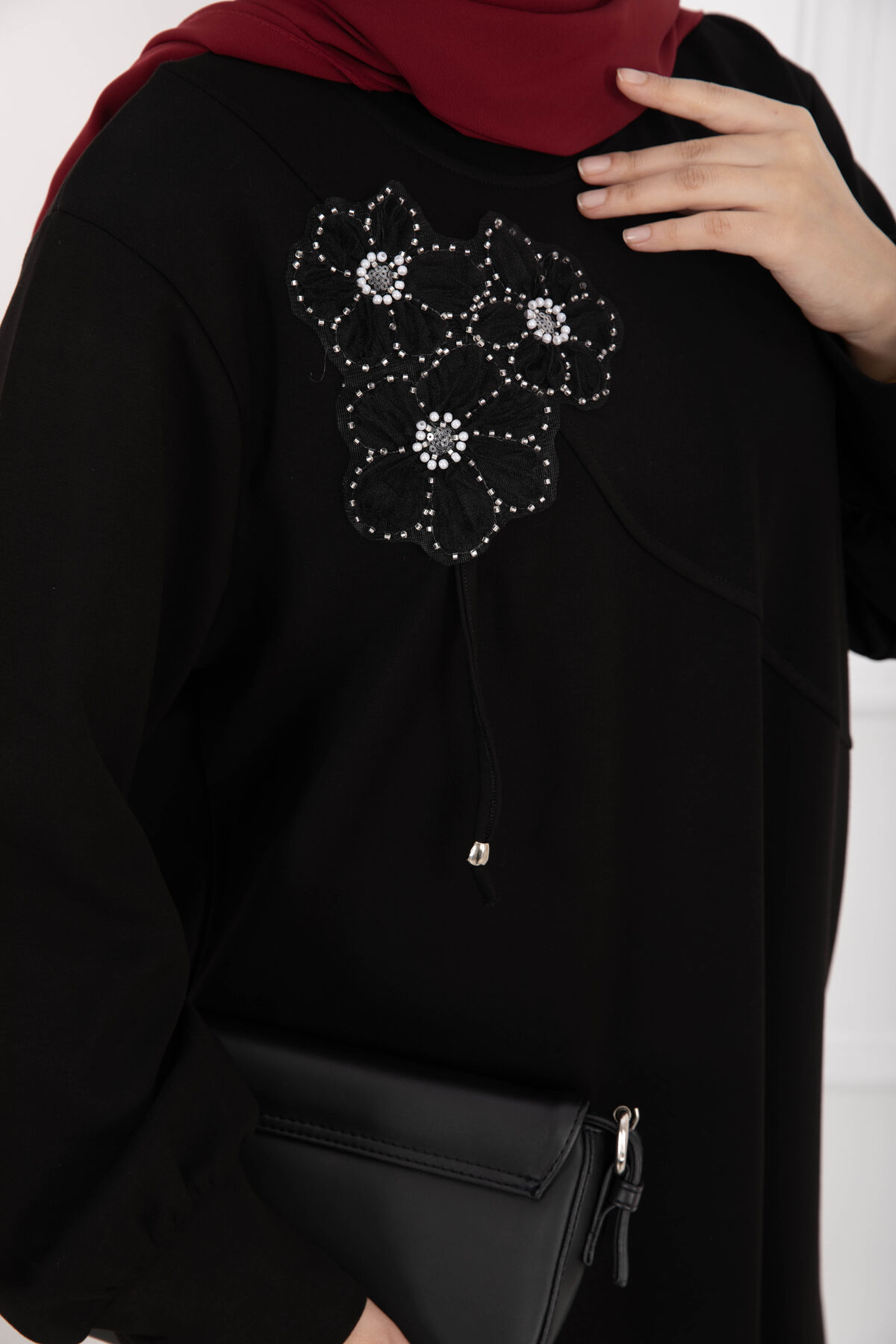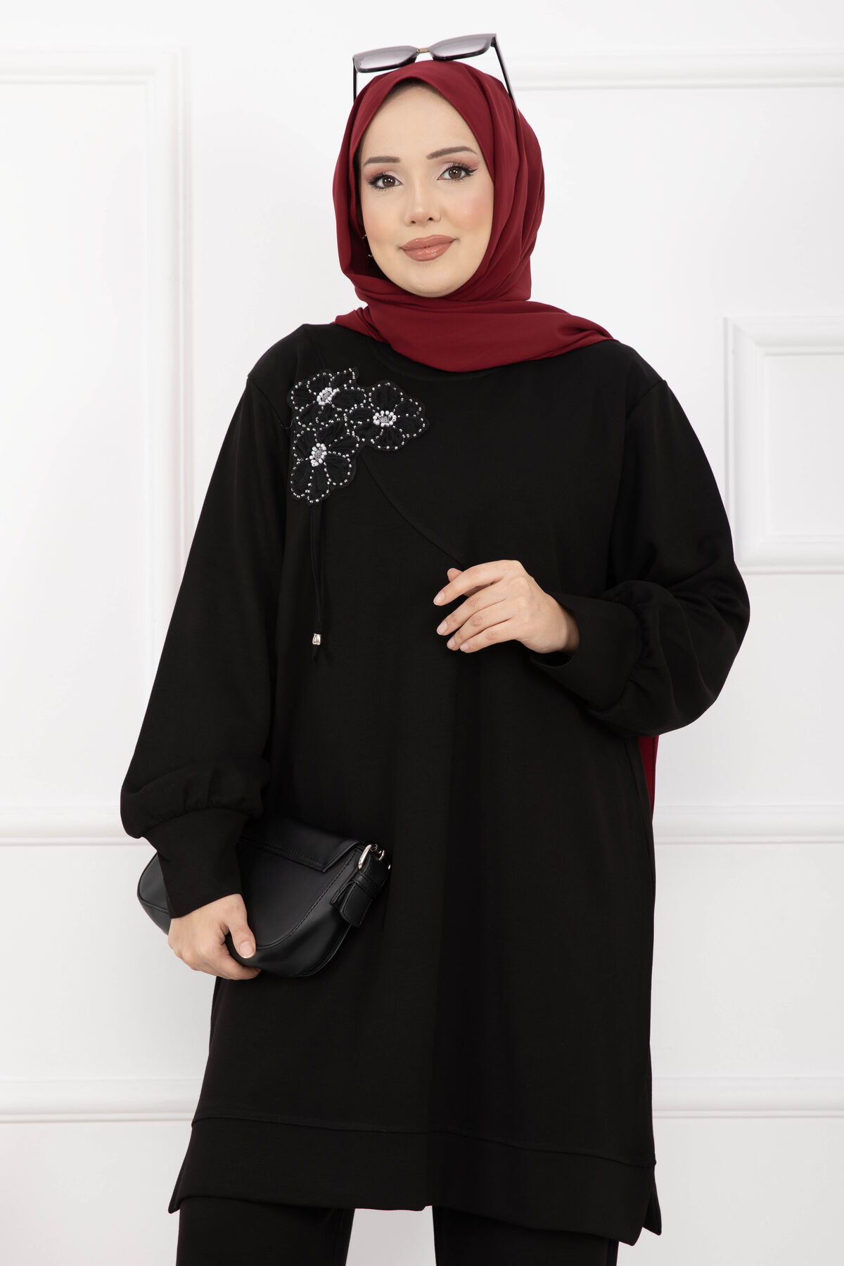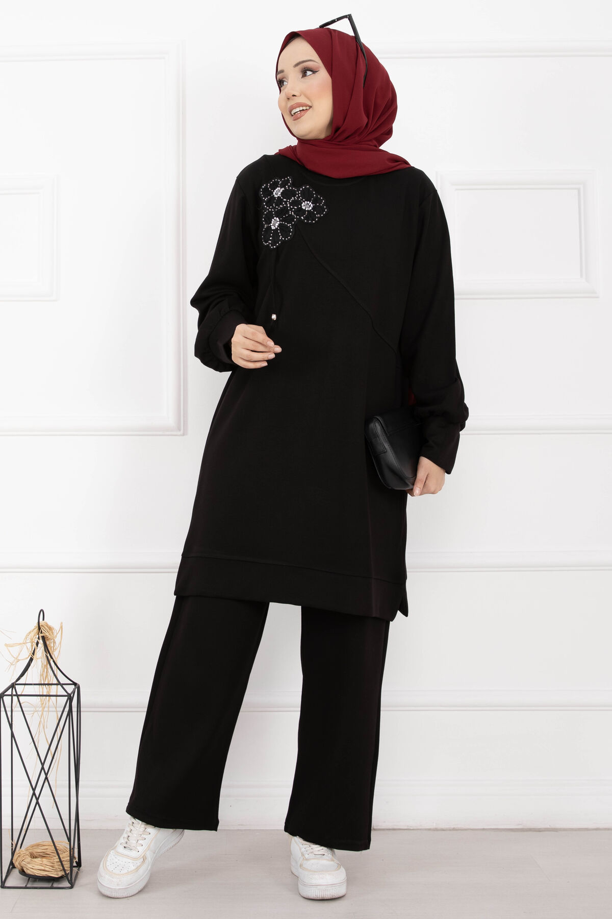 Taş İşleme Çiçek Detaylı Tesettür İkili Takım Siyah
