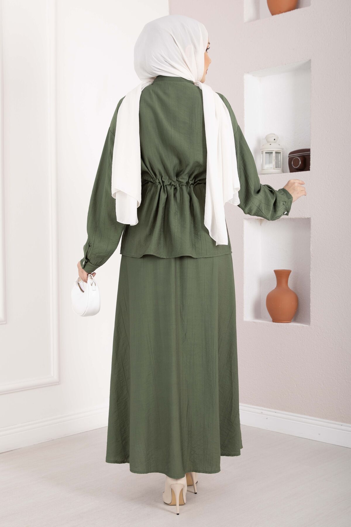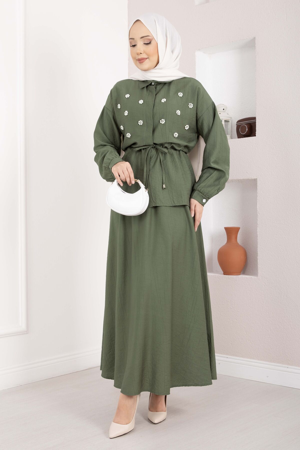 Taş İşlemeli Beli Tünelli Etekli Takım Haki