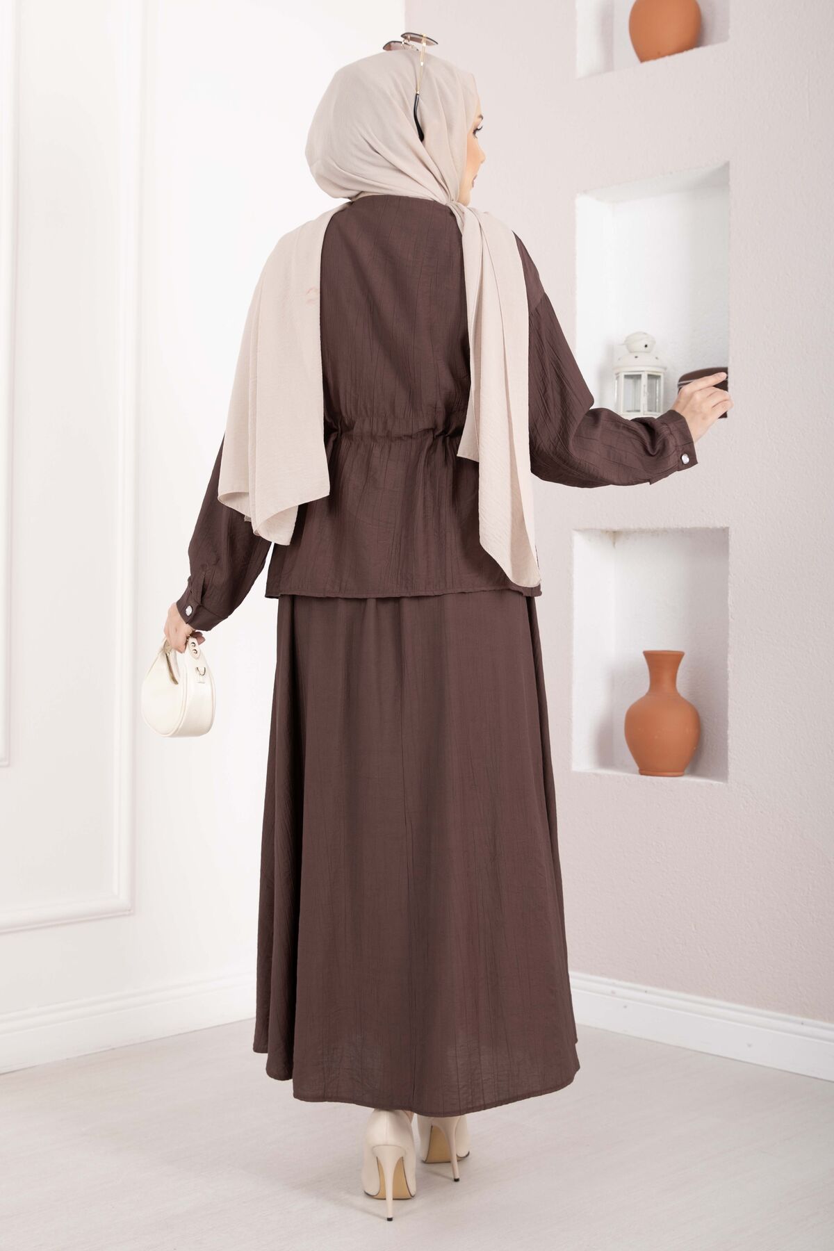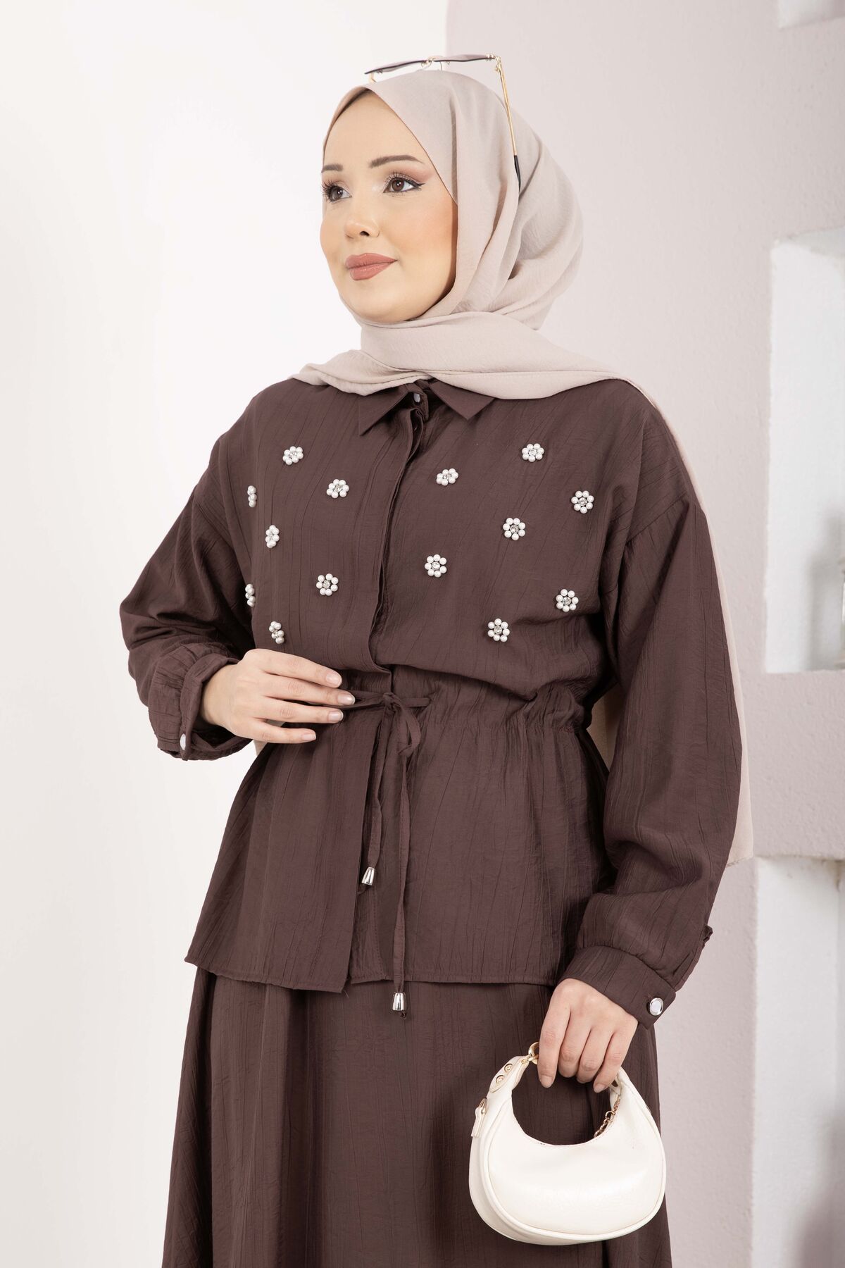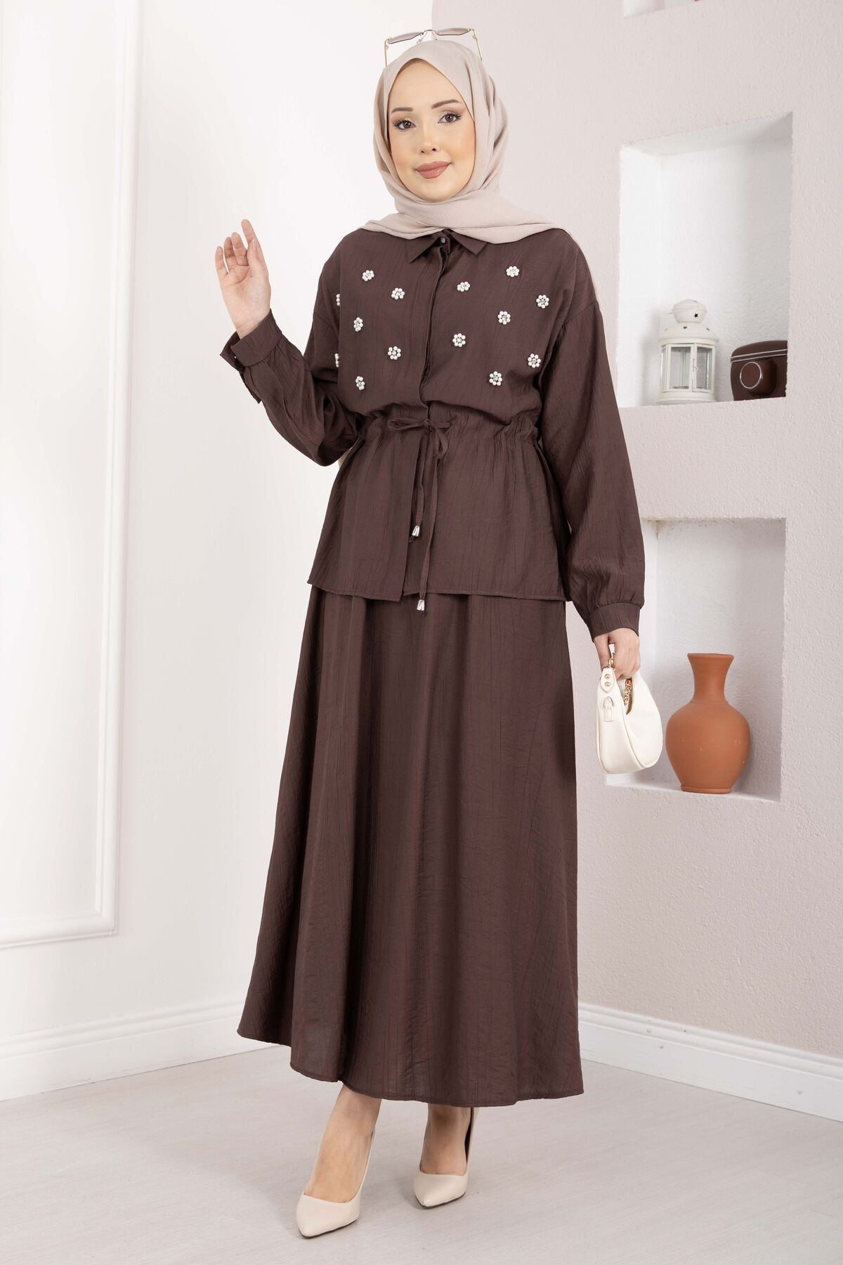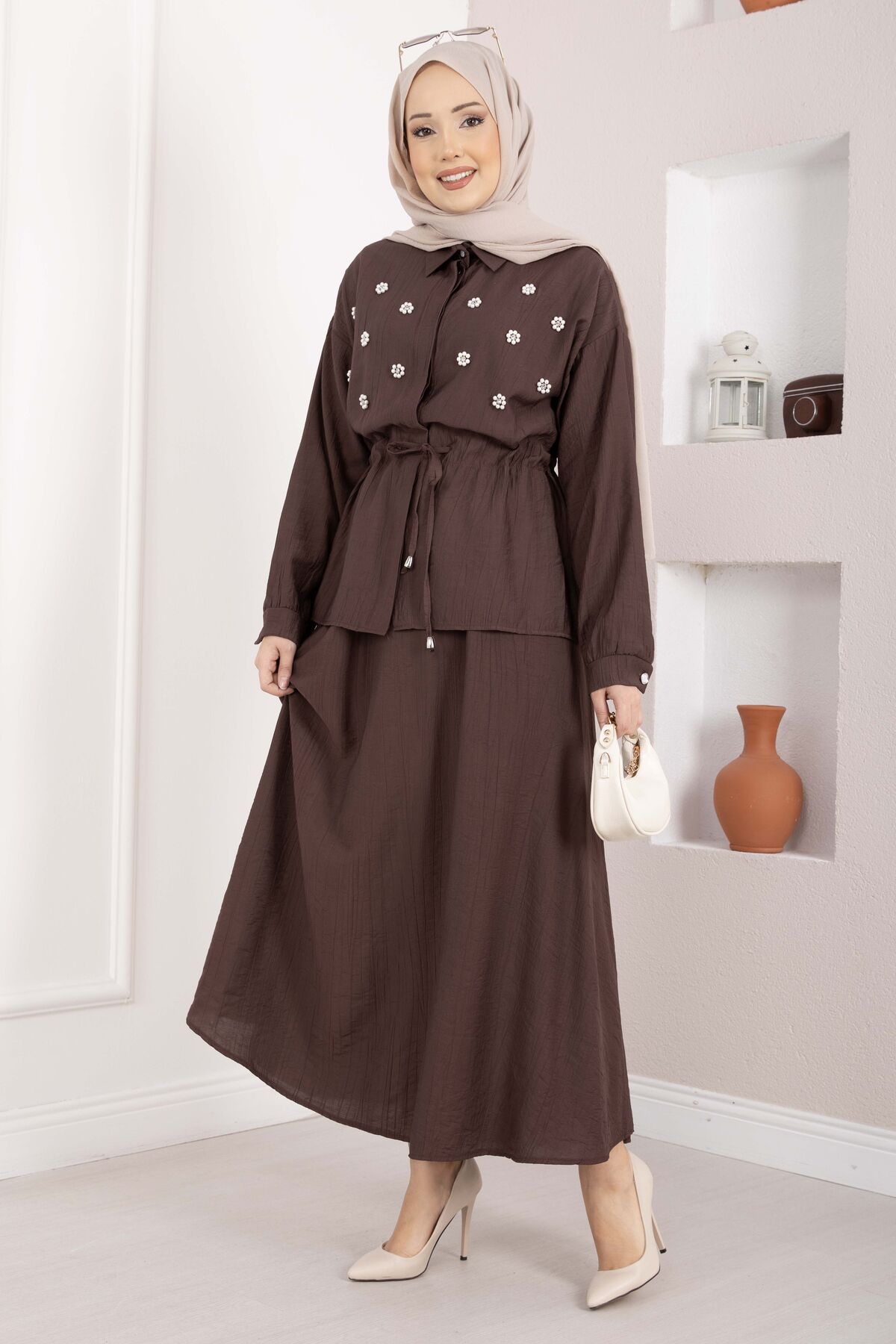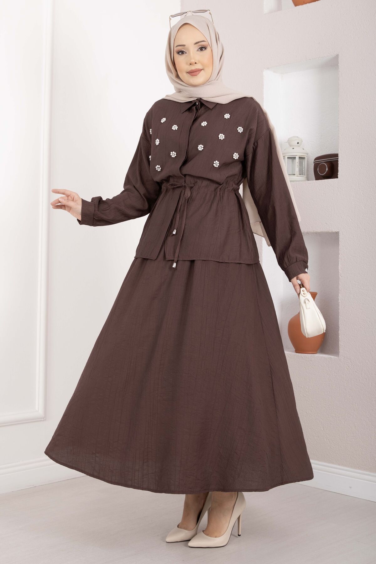 Taş İşlemeli Beli Tünelli Etekli Takım Kahve