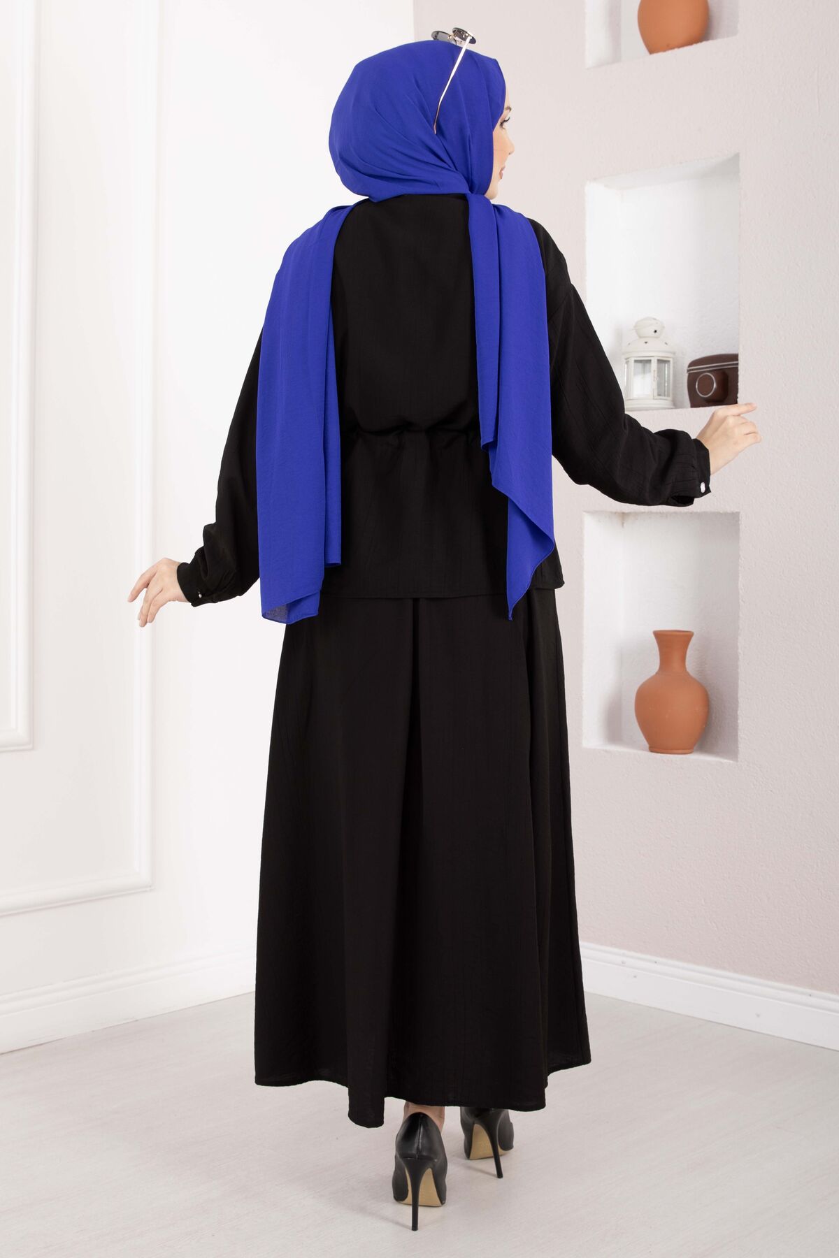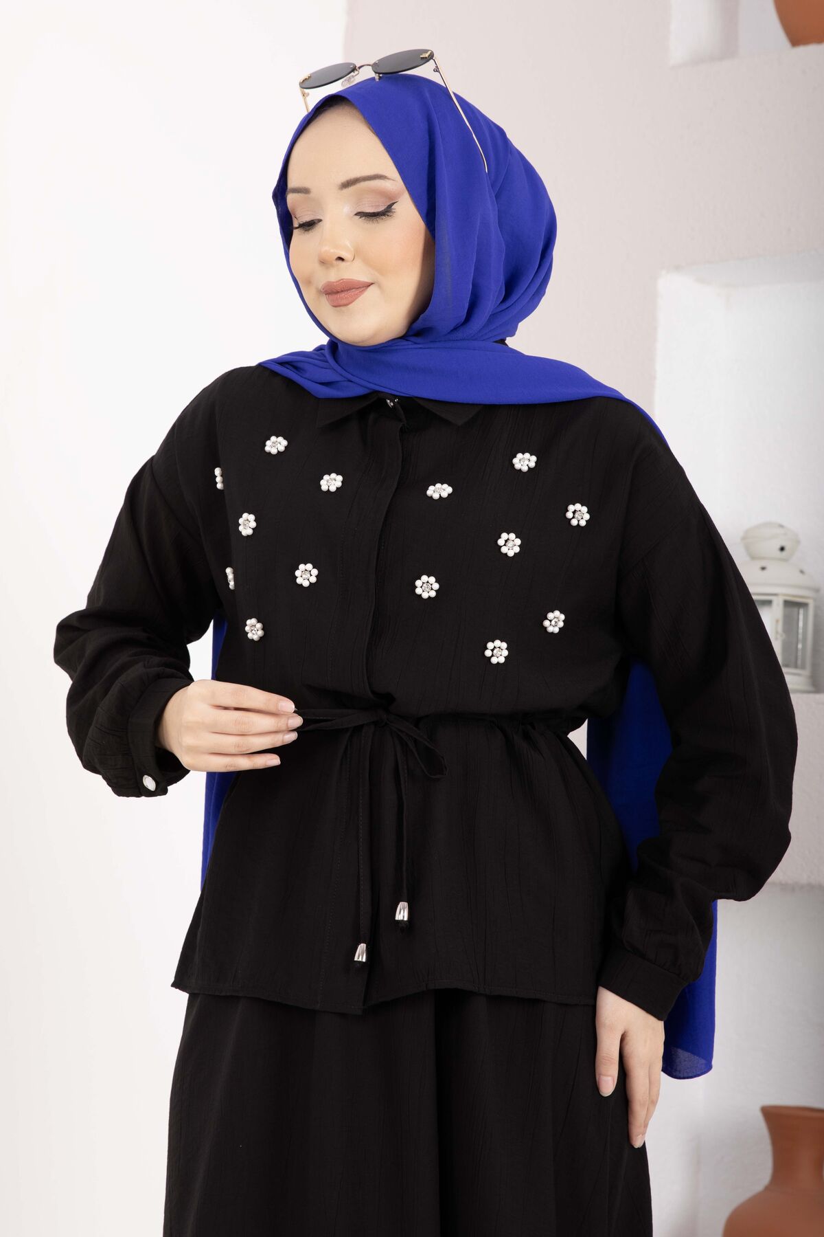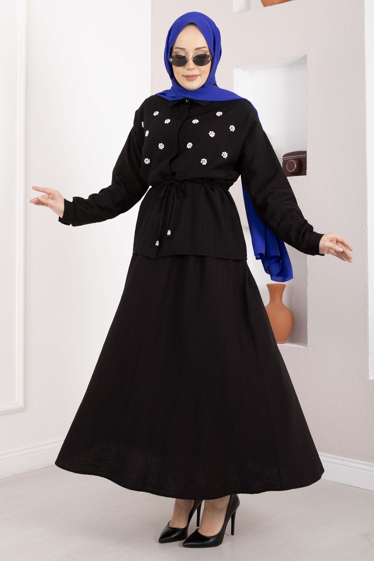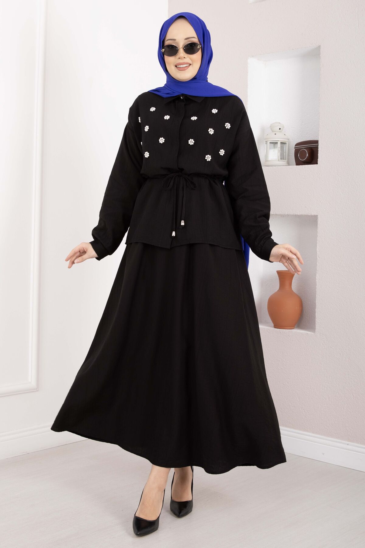 Zarif detayları ve modern kesimiyle öne çıkan Taş İşlemeli Beli Tünelli Etekli Takım, hem şık hem konforlu bir kullanım sunar. Bel kısmındaki tünel detayı sayesinde isteğe göre ayarlanabilir form sağlar. Üzerindeki inci ve taş işlemeler kombinlere zarif bir ışıltı katar.