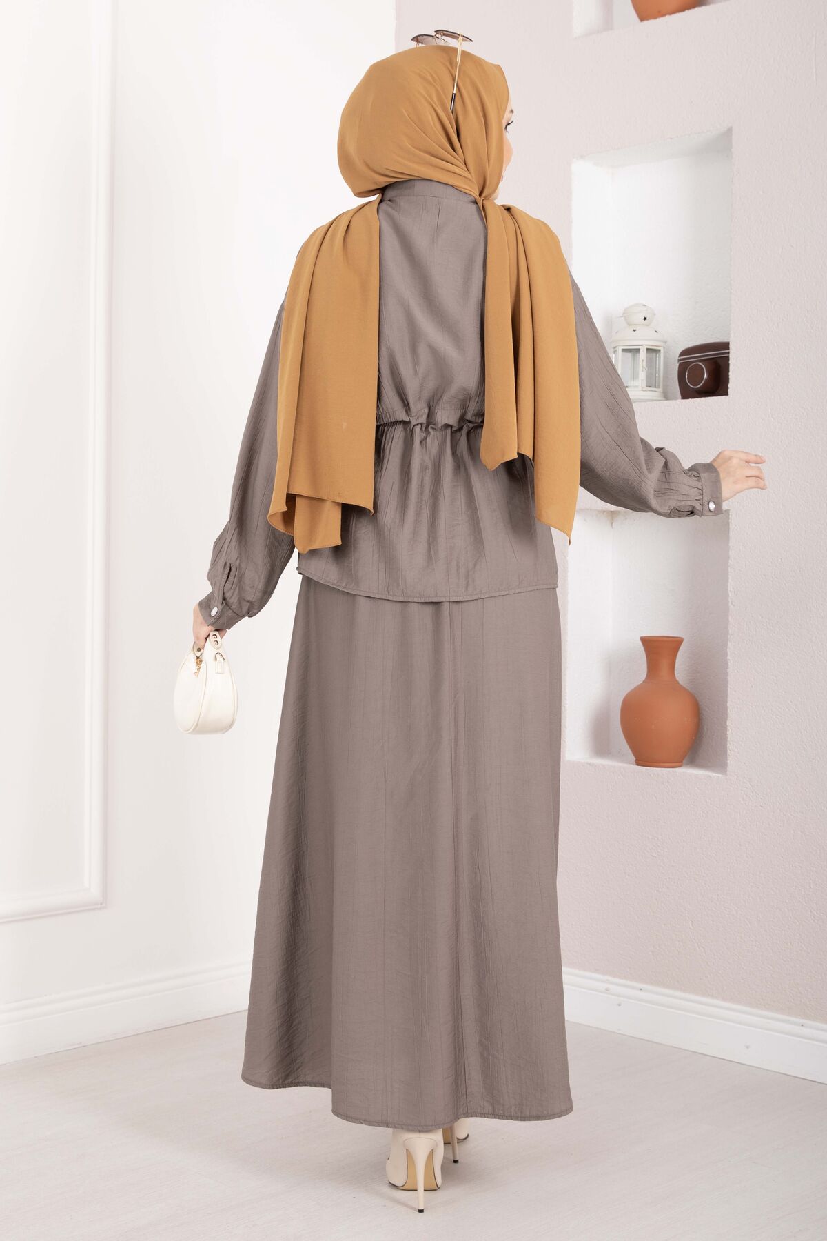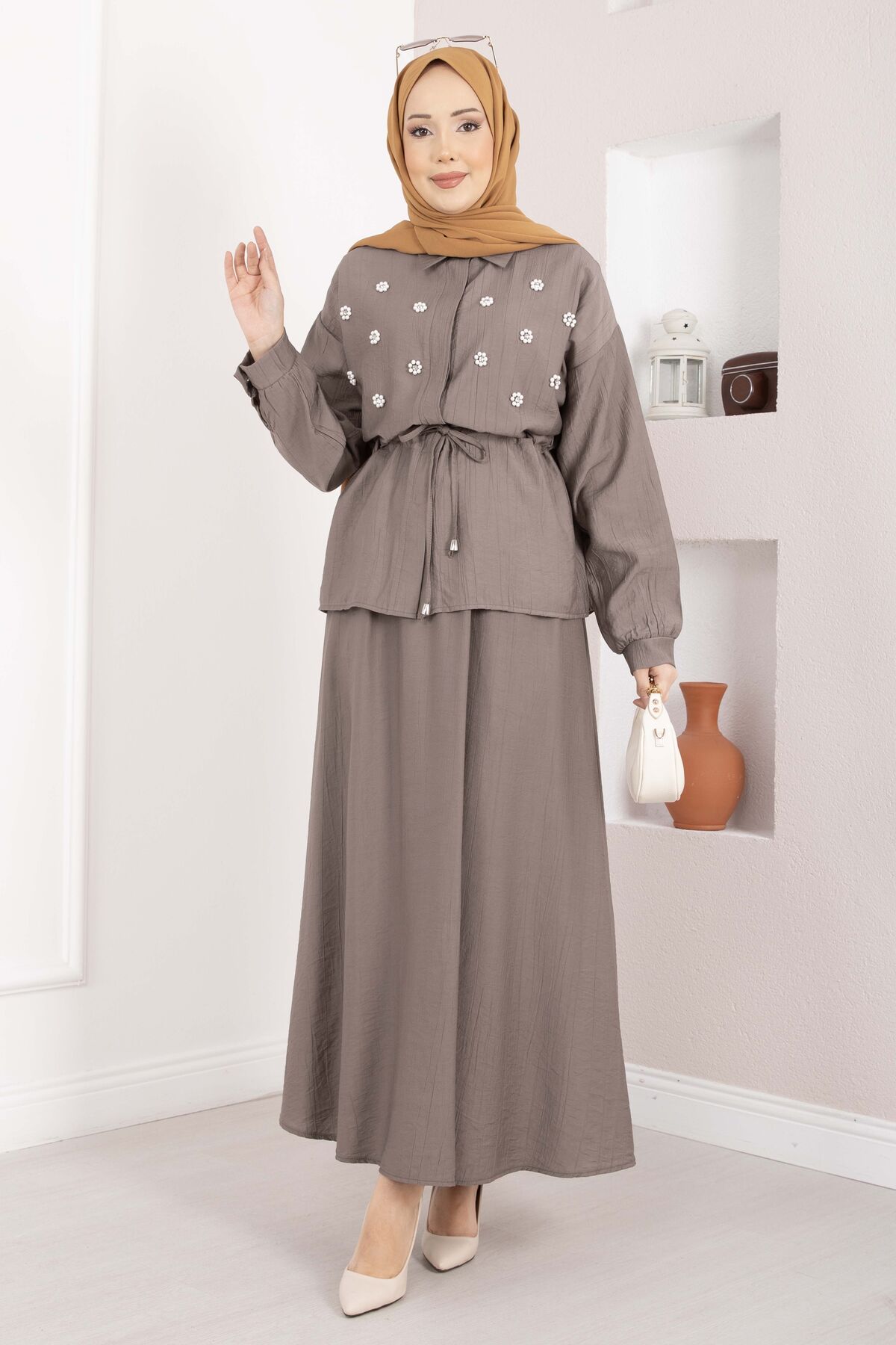 Zarif detayları ve modern kesimiyle öne çıkan Taş İşlemeli Beli Tünelli Etekli Takım, hem şık hem konforlu bir kullanım sunar. Bel kısmındaki tünel detayı sayesinde isteğe göre ayarlanabilir form sağlar. Üzerindeki inci ve taş işlemeler kombinlere zarif bir ışıltı katar.