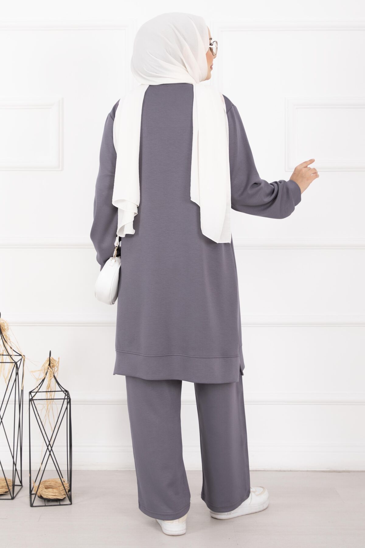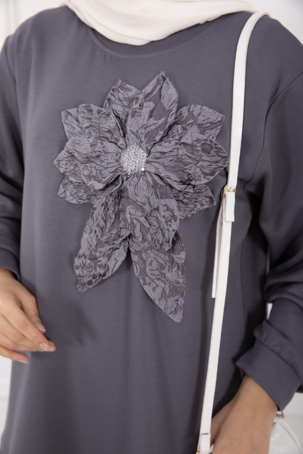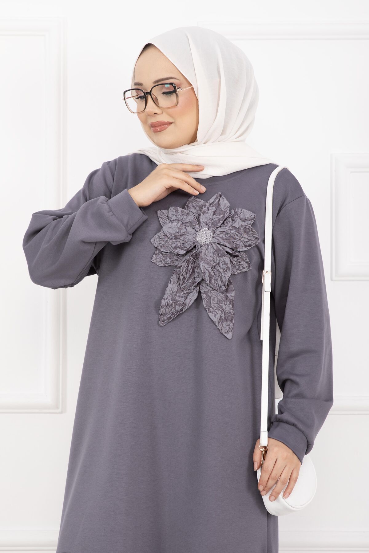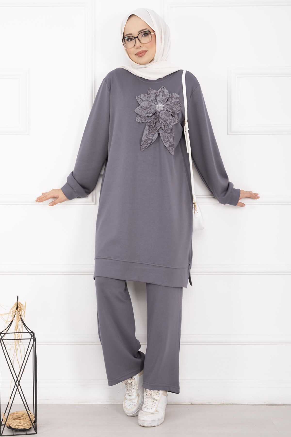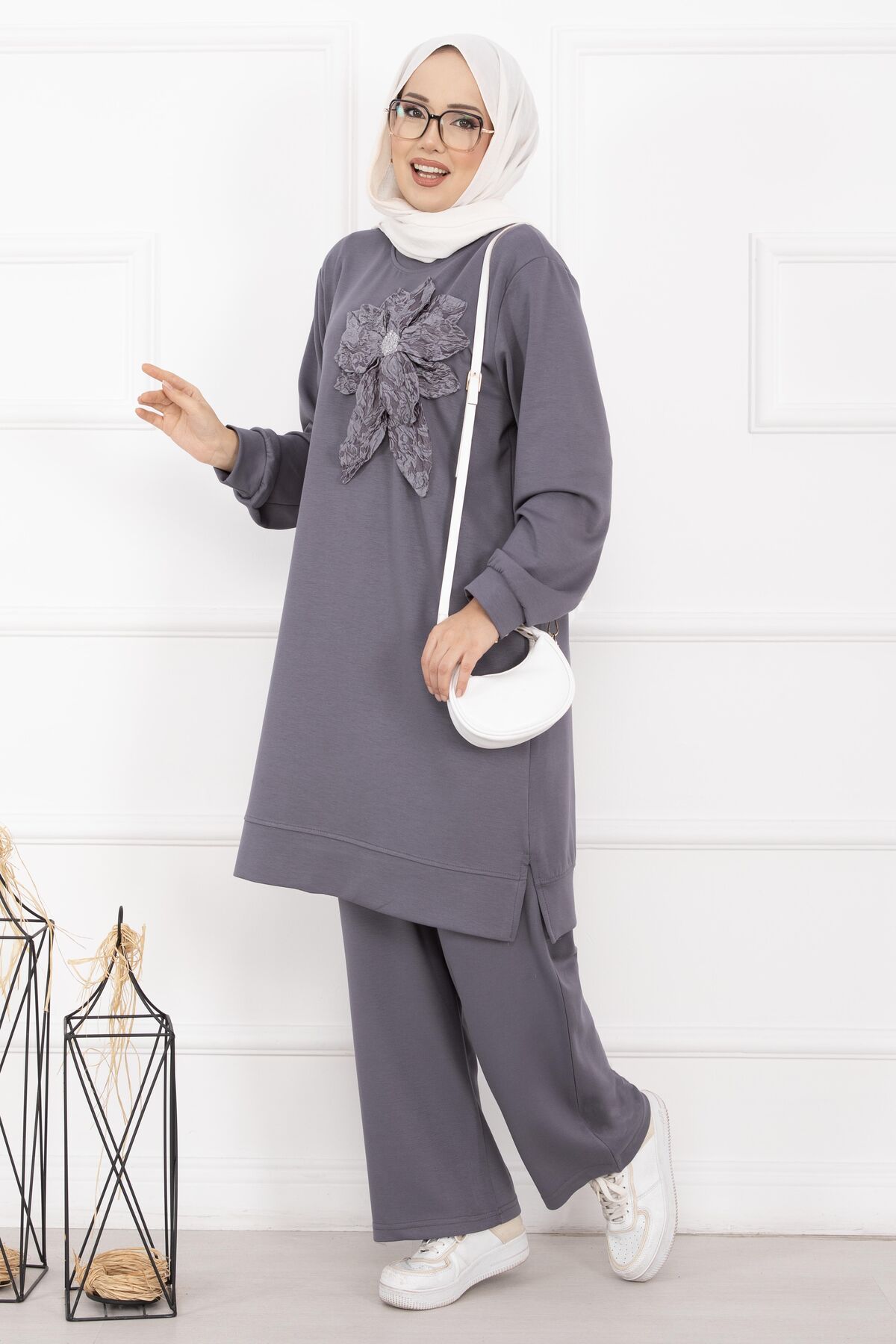 Taş İşlemeli Kabartma Çiçekli Tesettür Takım Gri