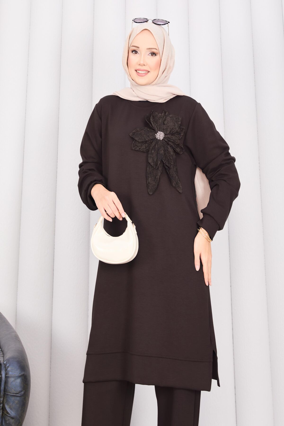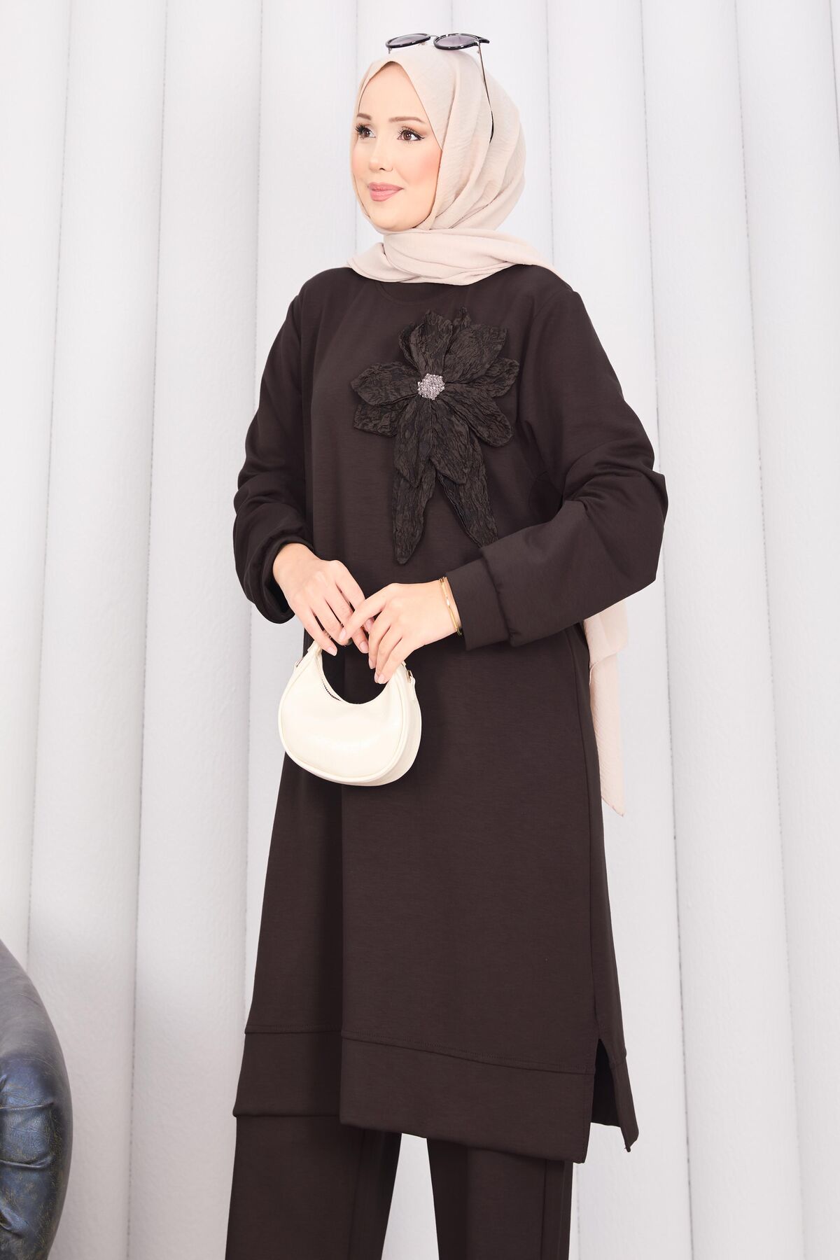 Taş İşlemeli Kabartma Çiçekli Tesettür Takım Kahve