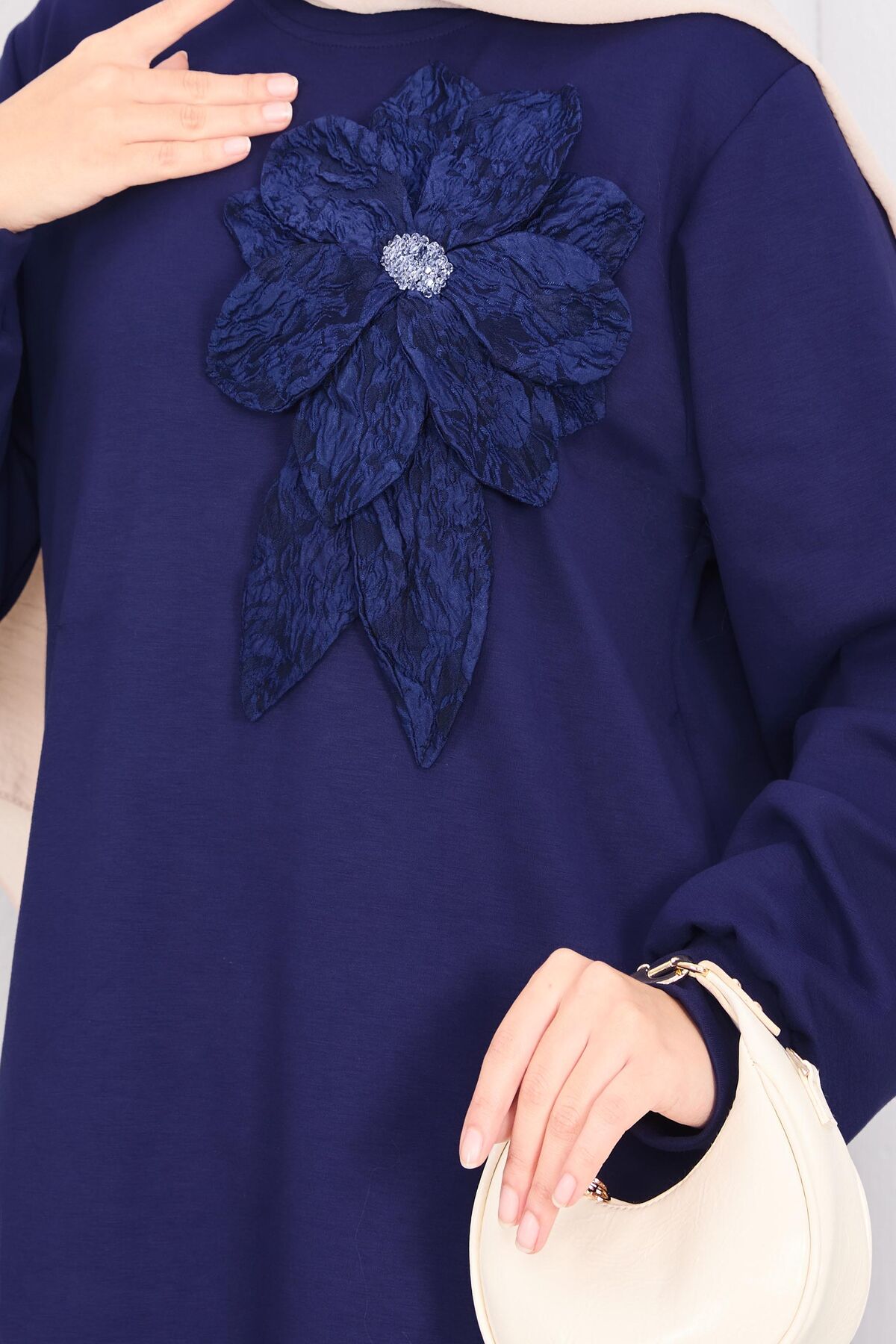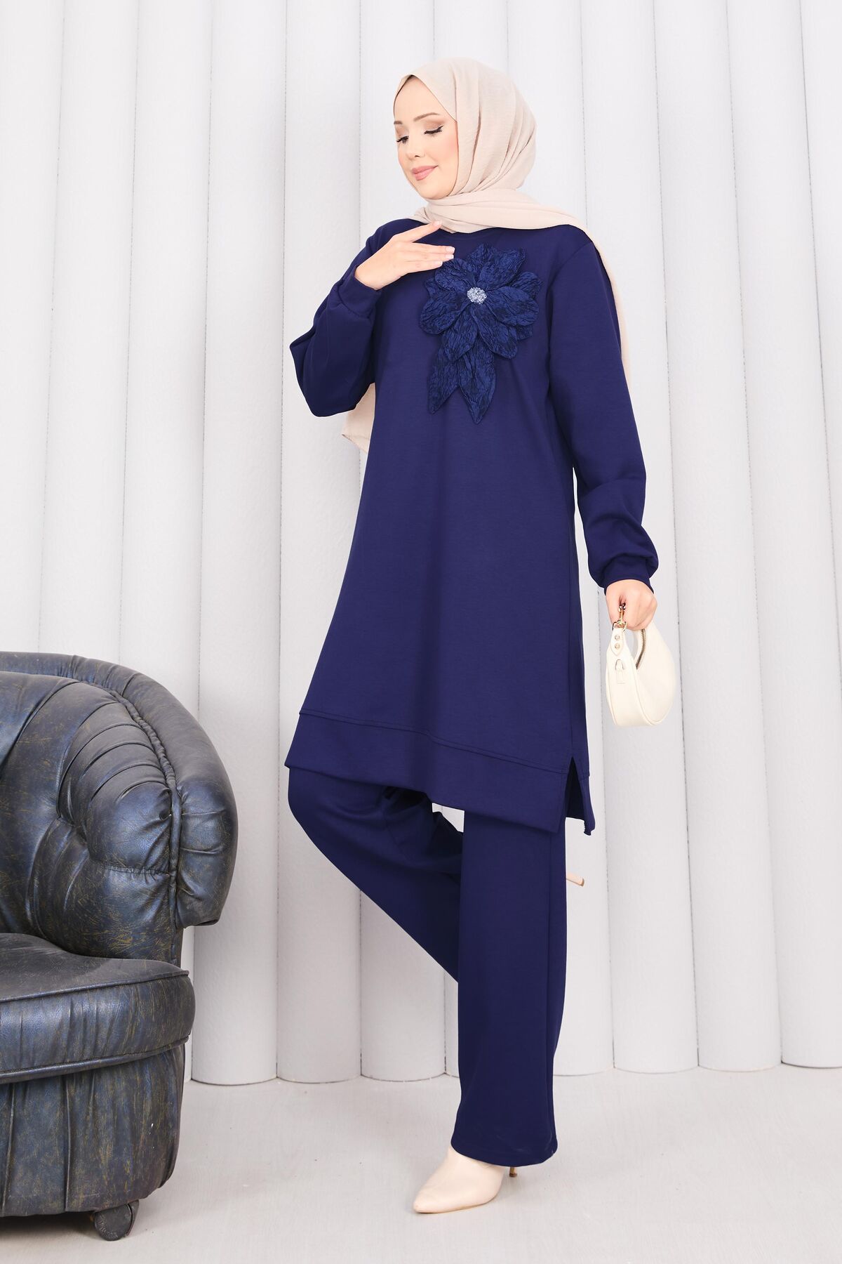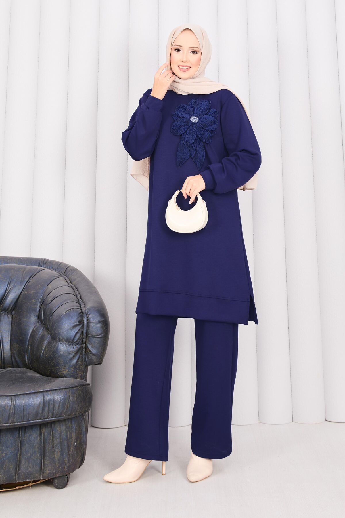 Taş İşlemeli Kabartma Çiçekli Tesettür Takım Lacivert