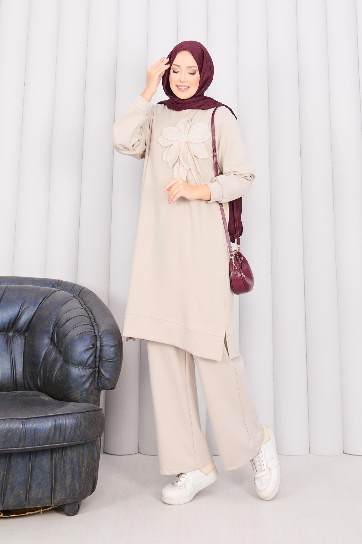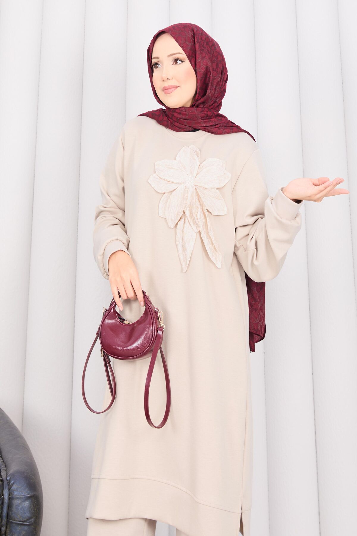 Taş İşlemeli Kabartma Çiçekli Tesettür Takım Taş
