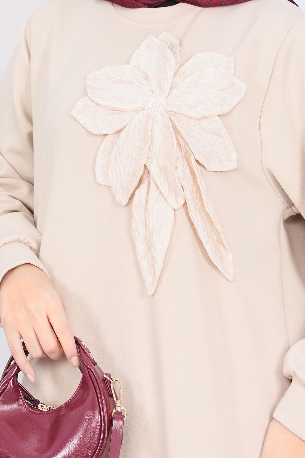 - Ürün mevsimliktir. Ürün tunik ve pantalon olmak üzere iki parçadan oluşmaktadır. Tuniğimizin göğüs kısmında taş işlemeli kabartma çiçek bulunmakta ve etek uçalarında yırtmaç detayı vardır.Pantalonumuzun beli lastiklidir.