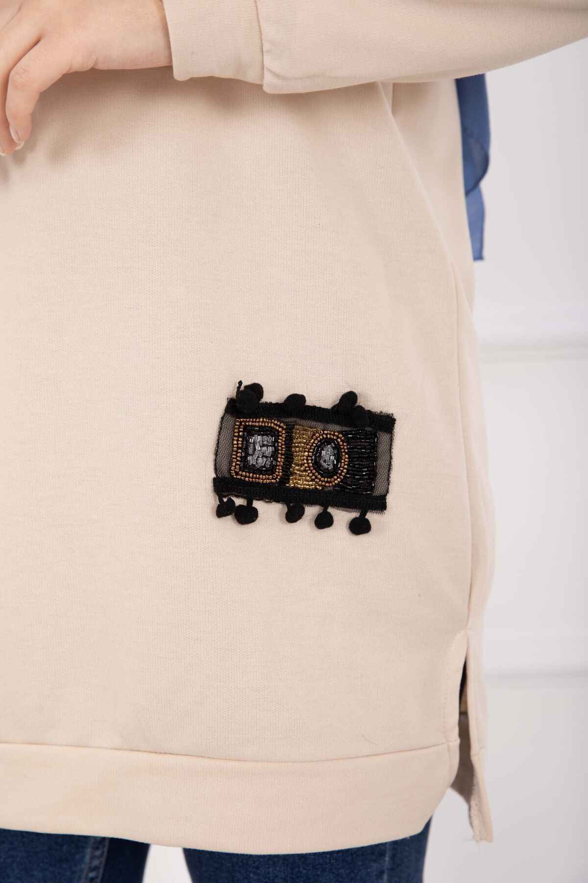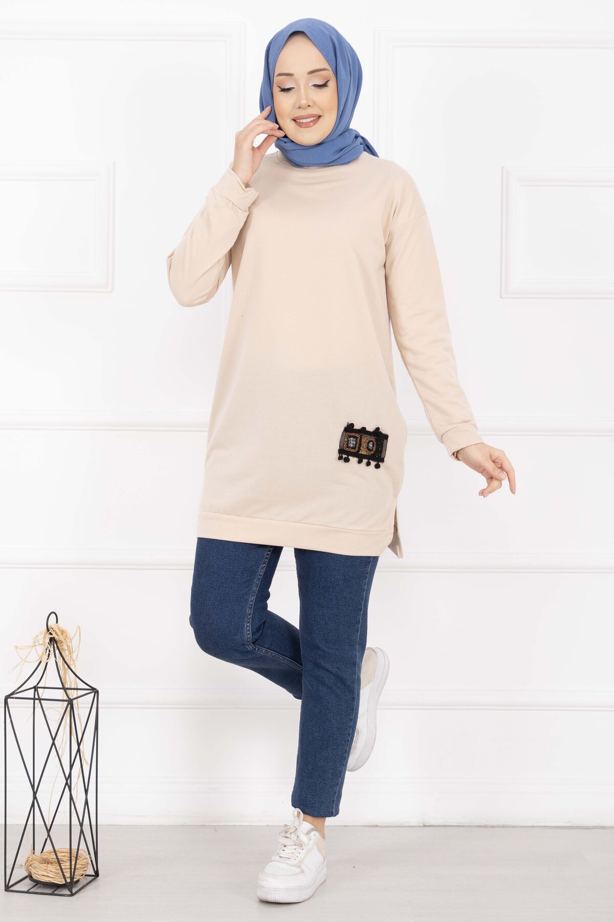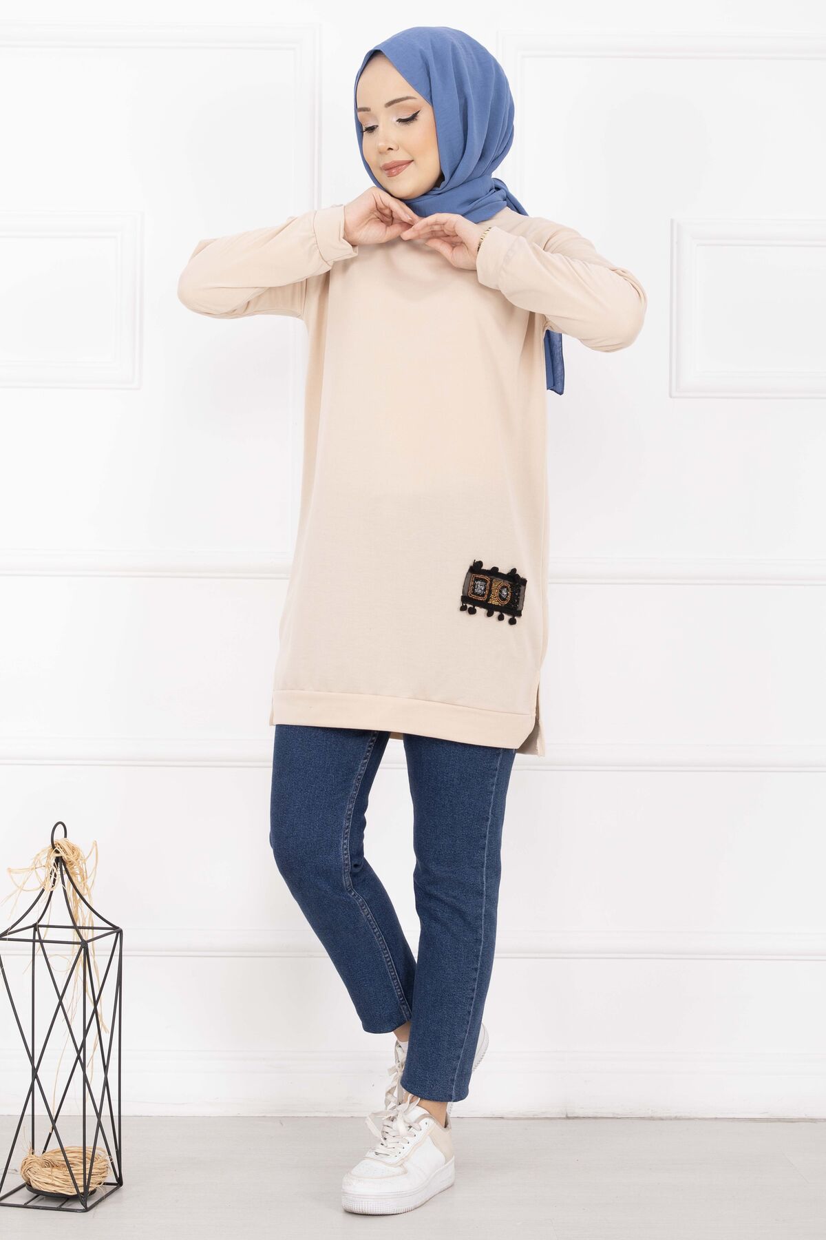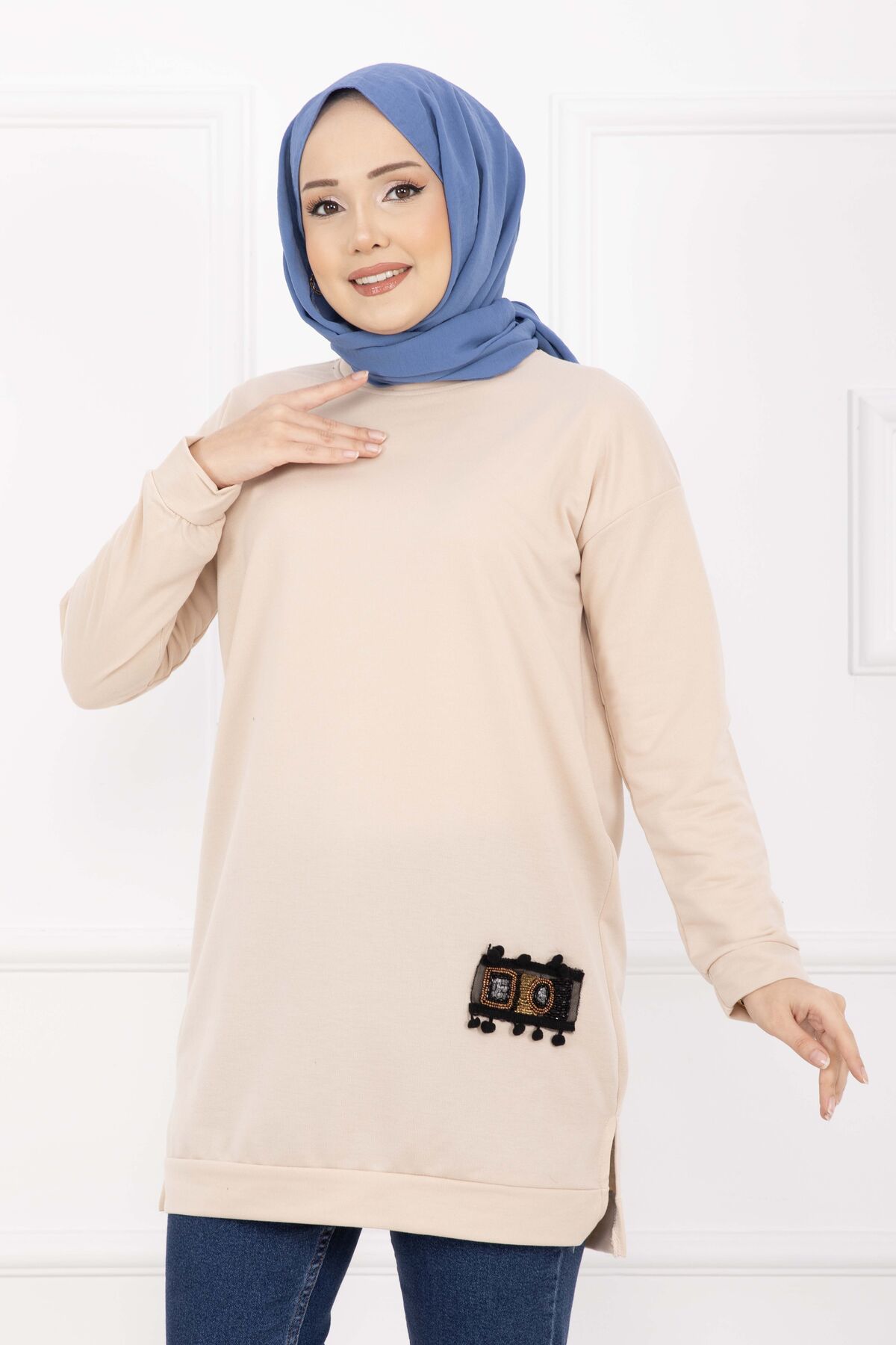 Taş İşlemeli Ponponlu Tesettür Tunik Bej