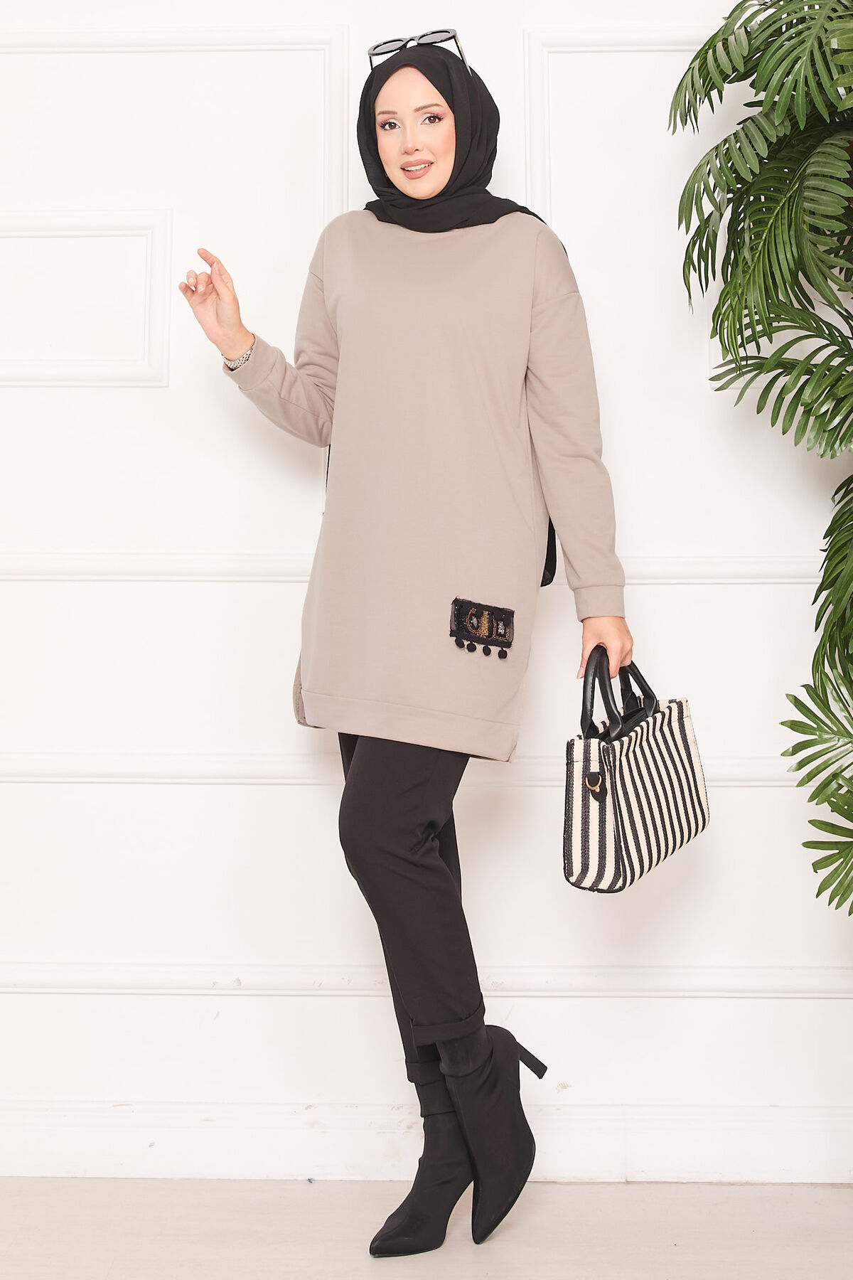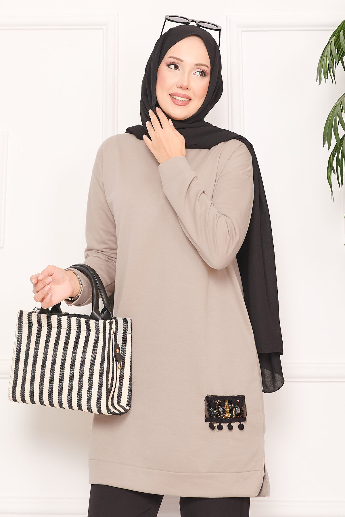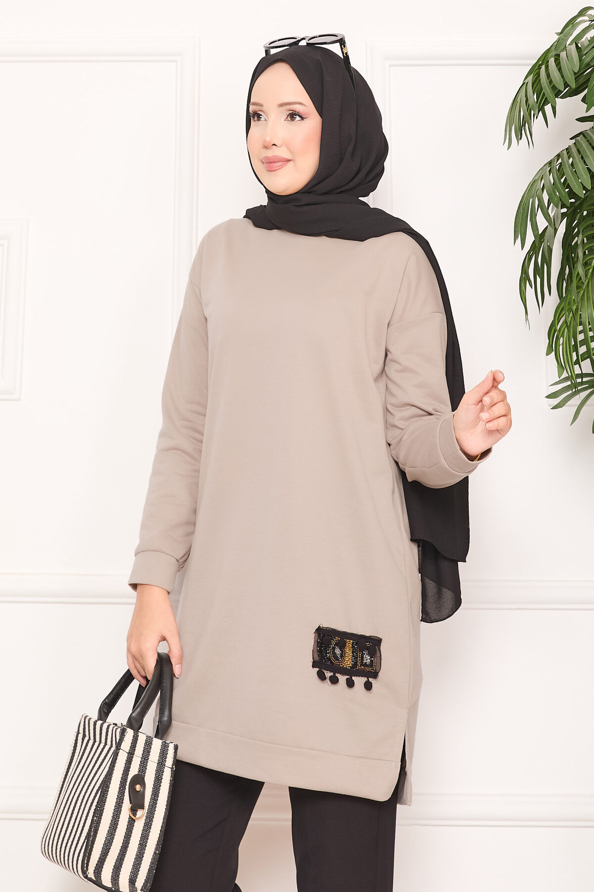 Taş İşlemeli Ponponlu Tesettür Tunik Vizon