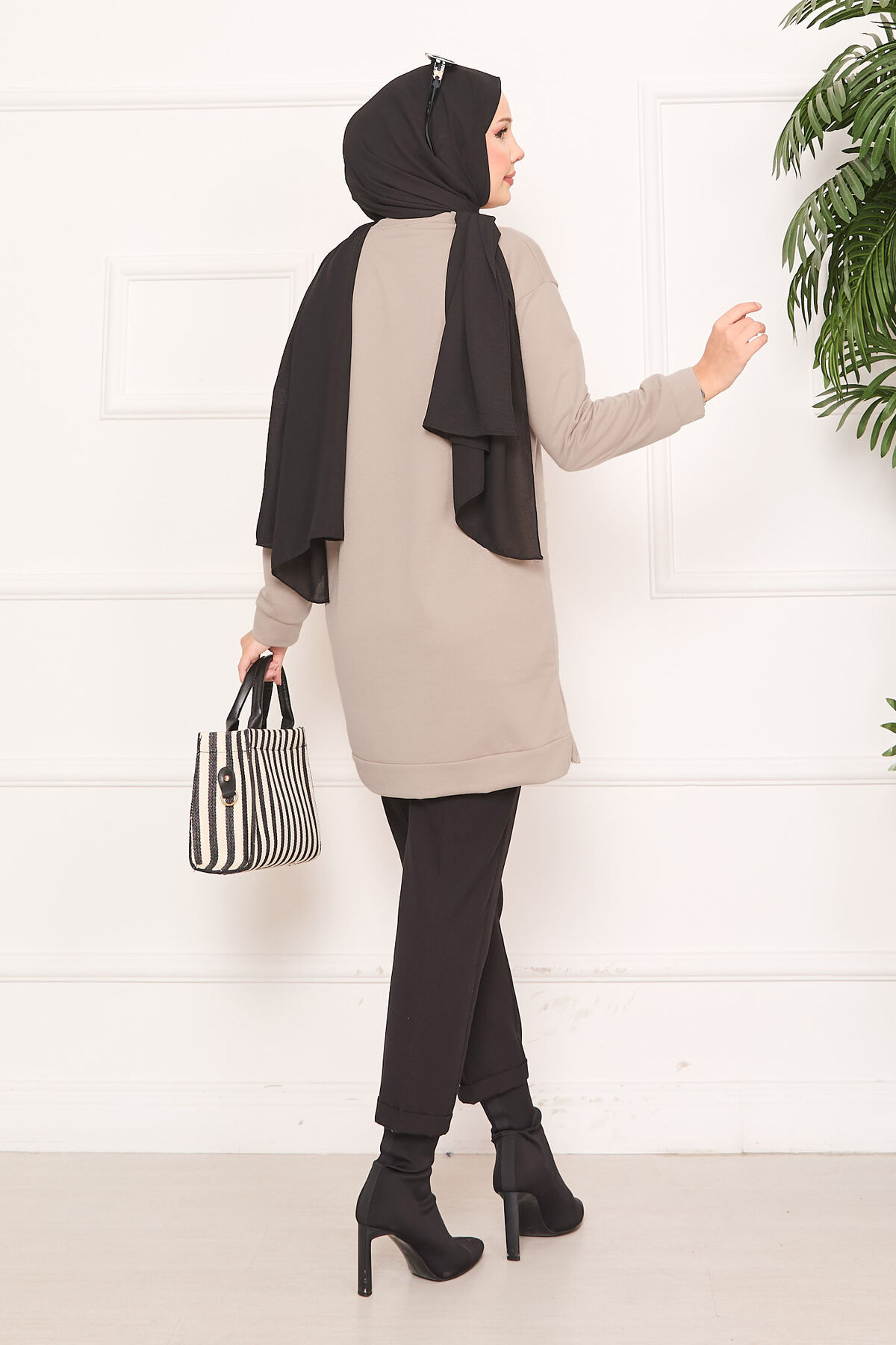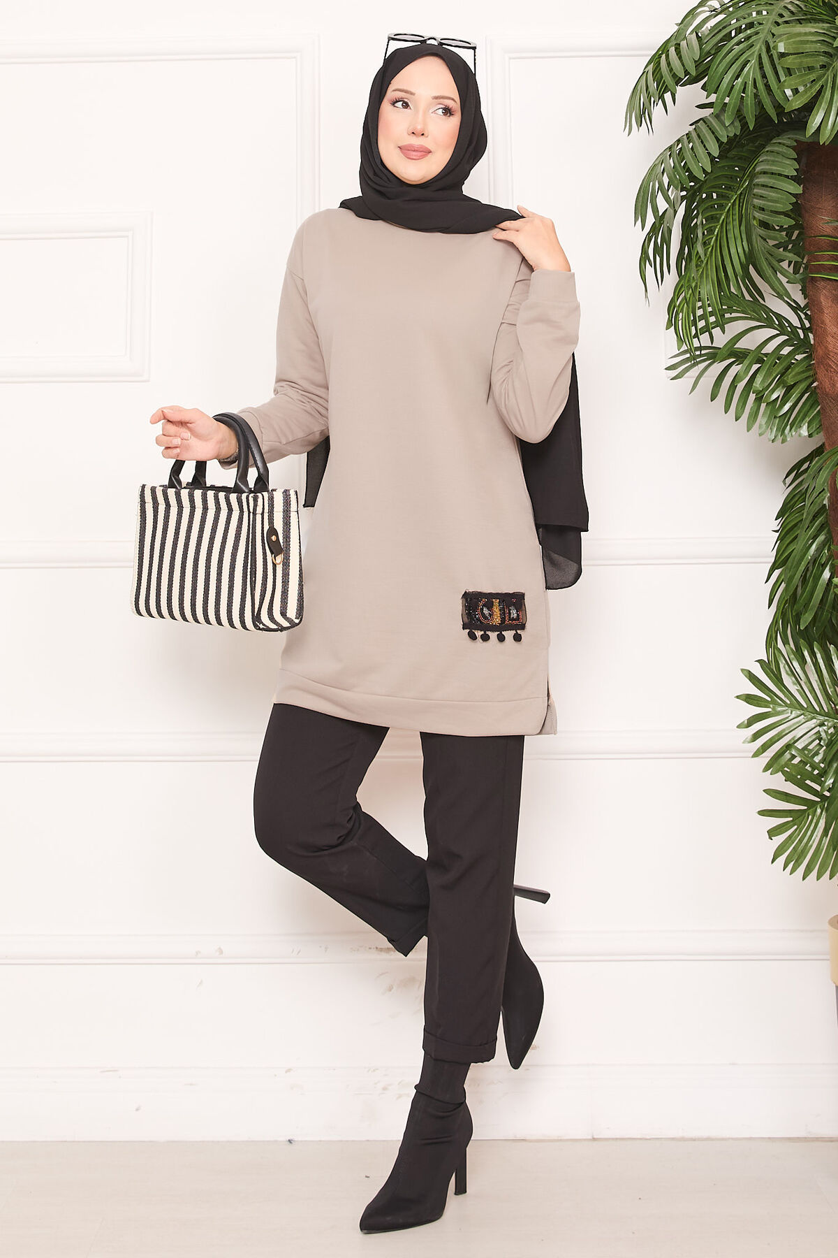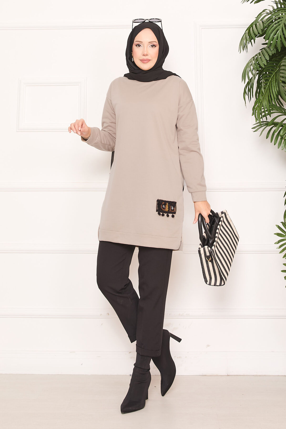 Taş İşlemeli Ponponlu Tesettür Tunik Vizon