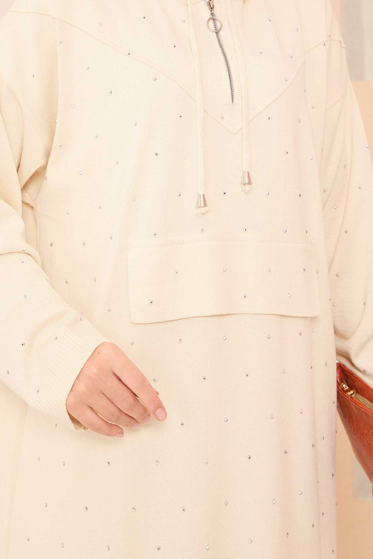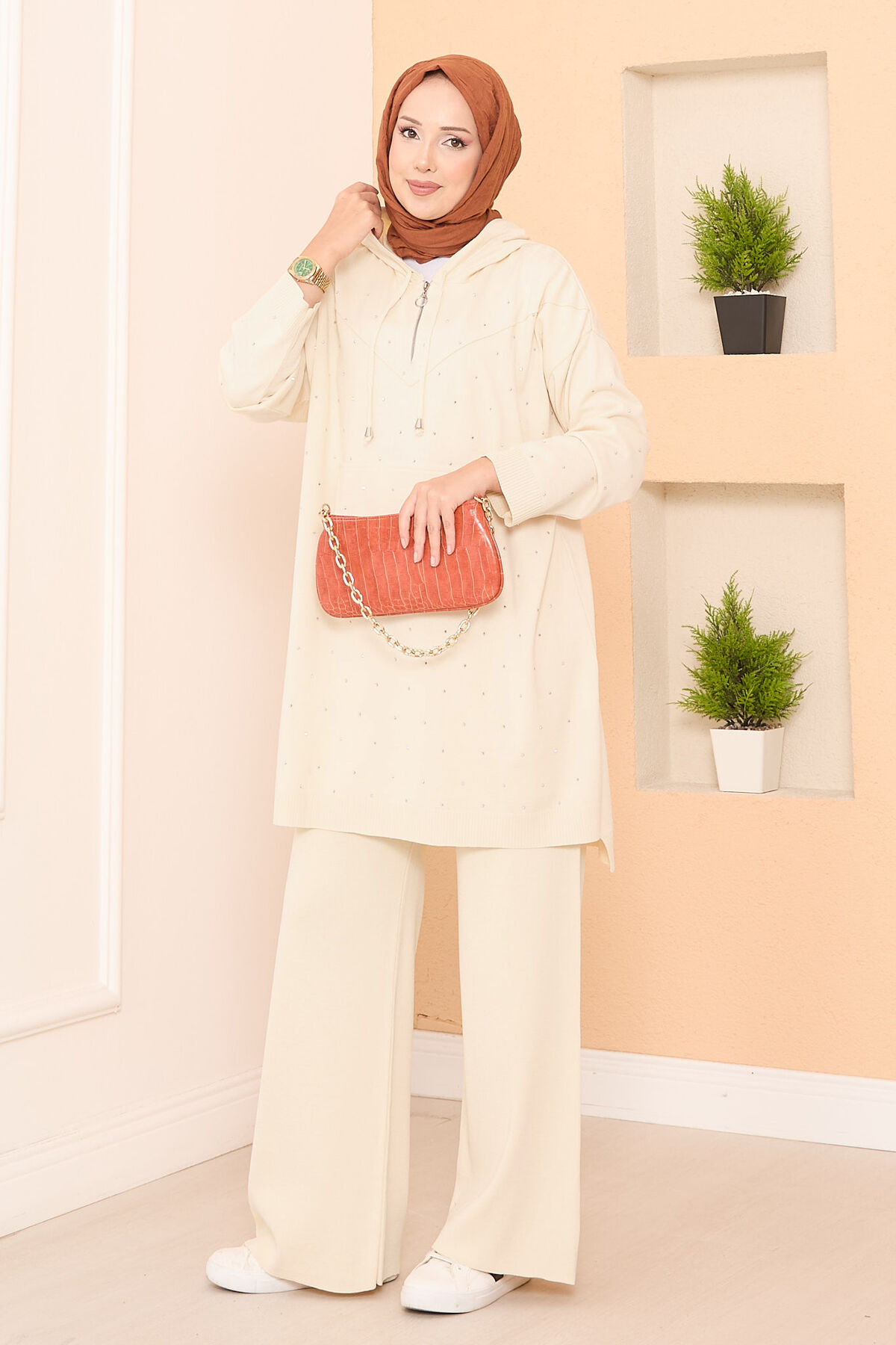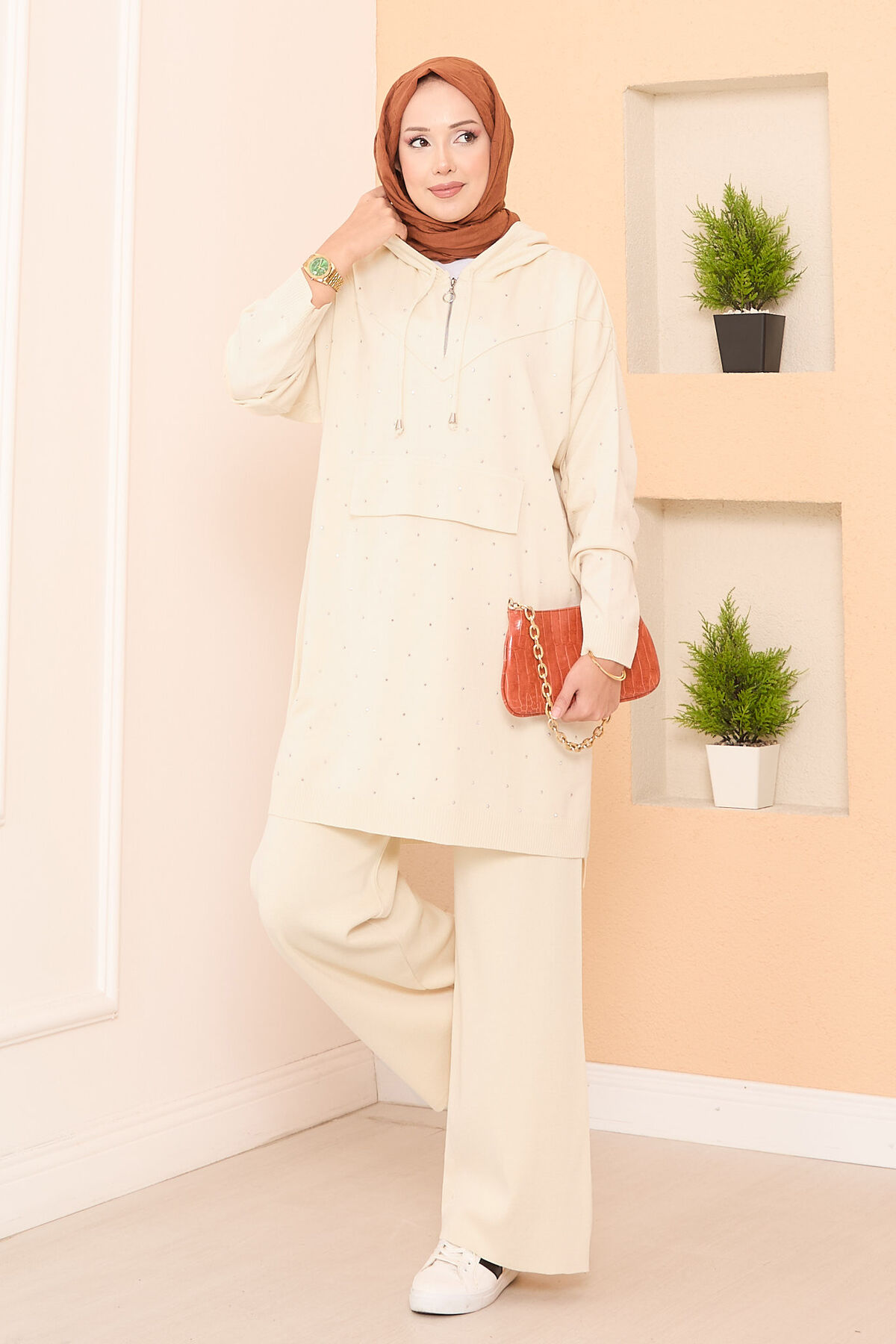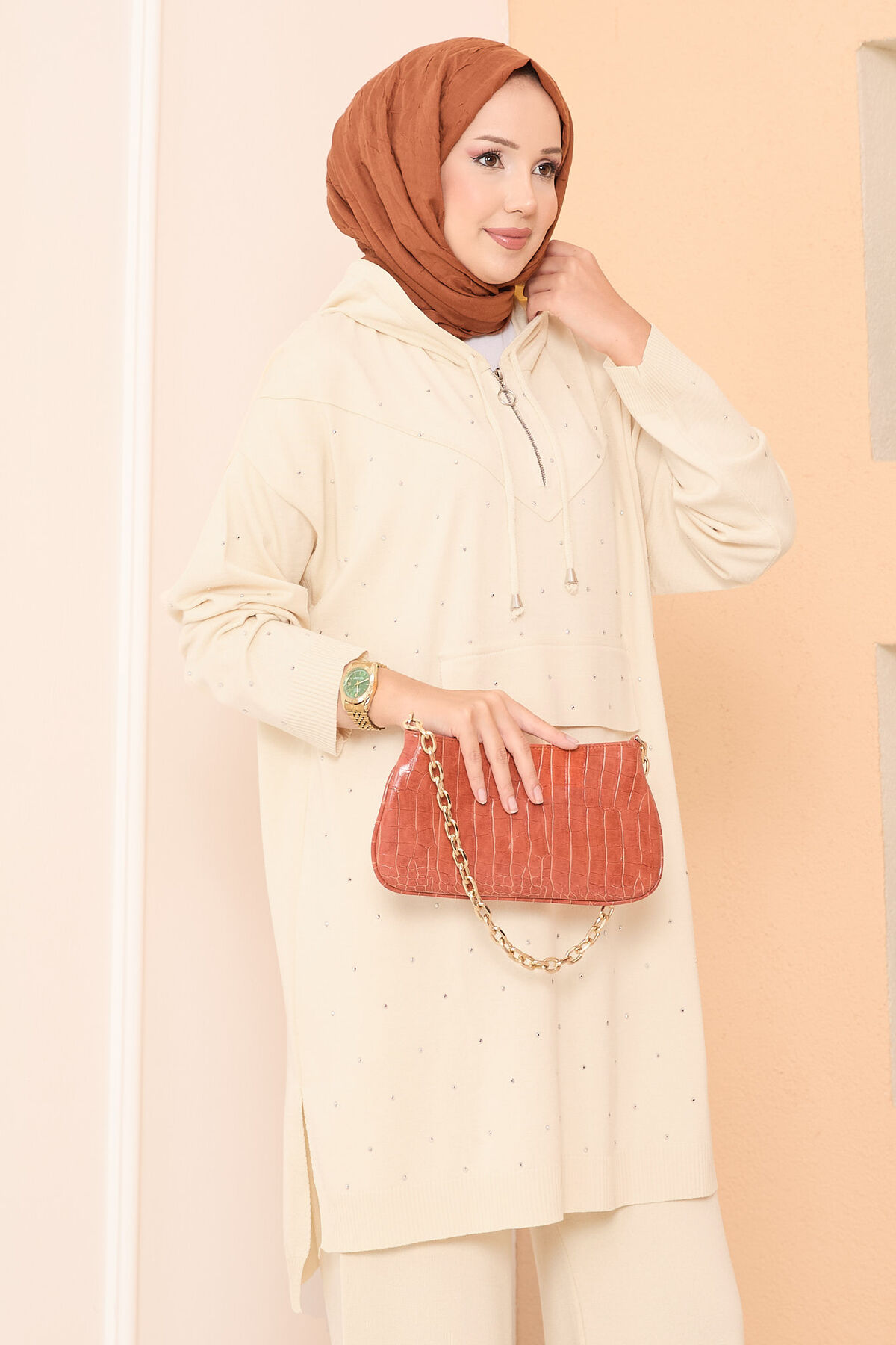 Taş Serpmeli Kapüşonlu Triko İkili Takım Krem