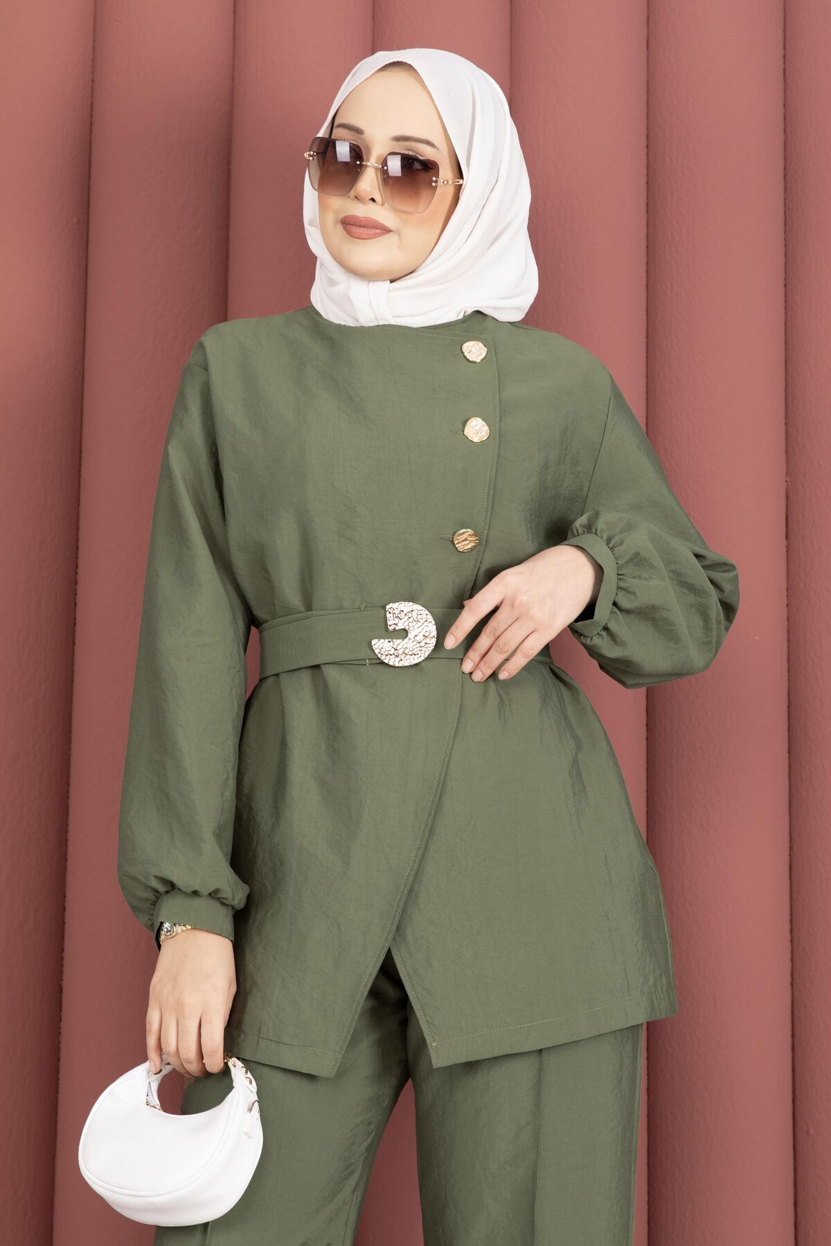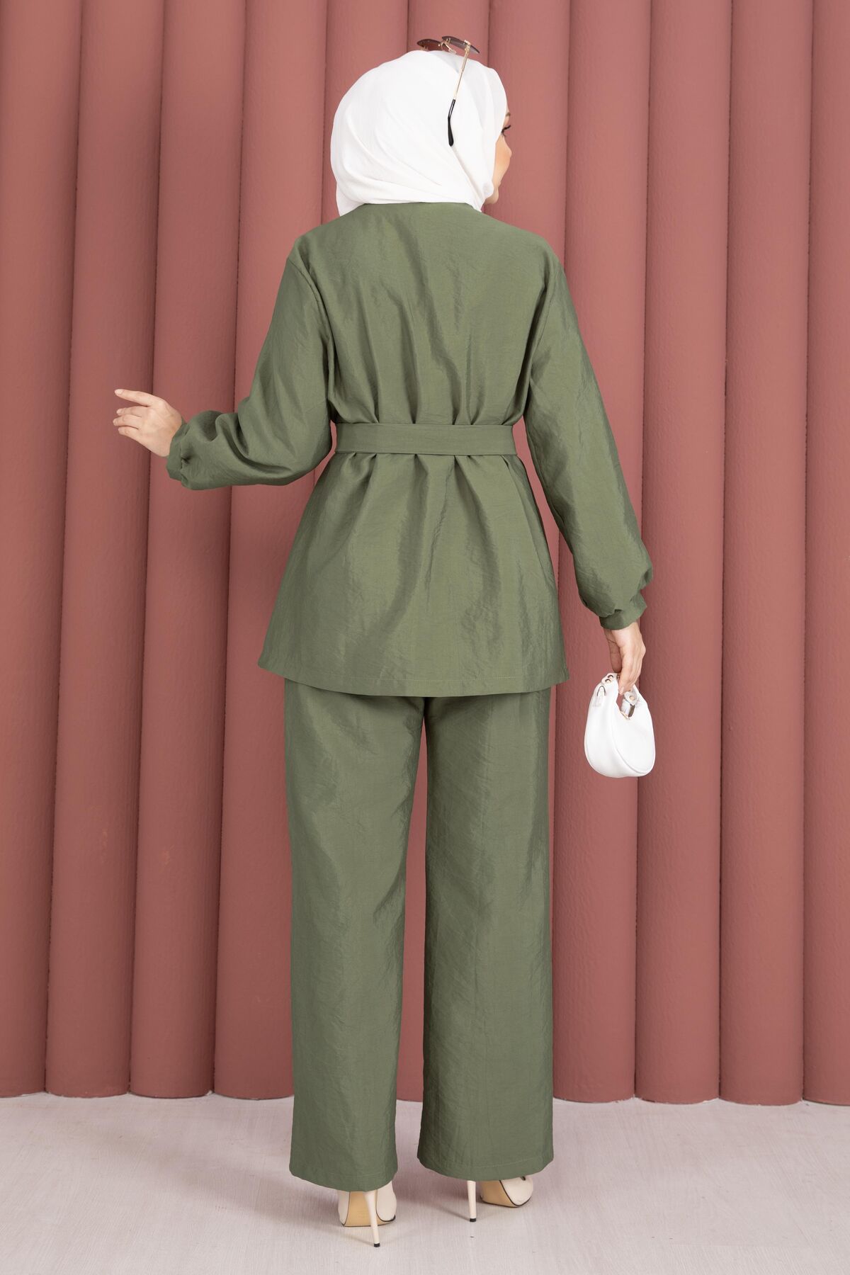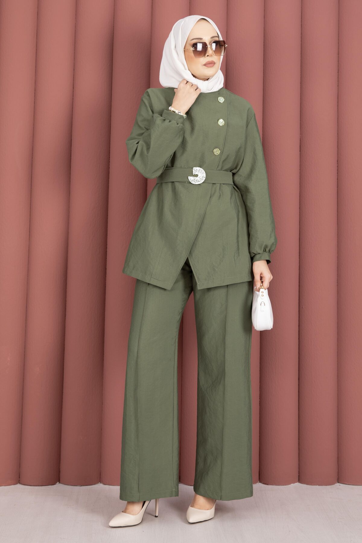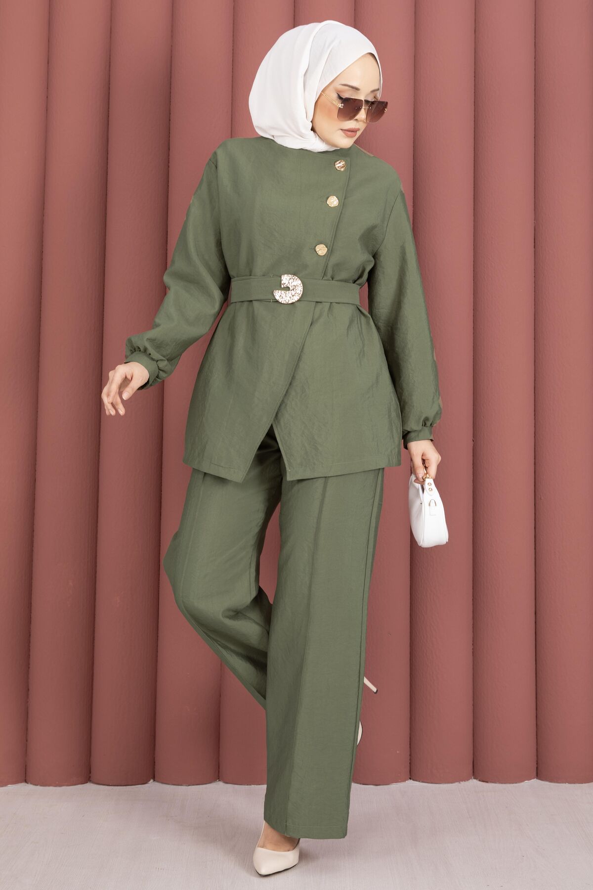 Tasarım Gold Düğmeli Kemerli İkili Takım Çağla Yeşili
