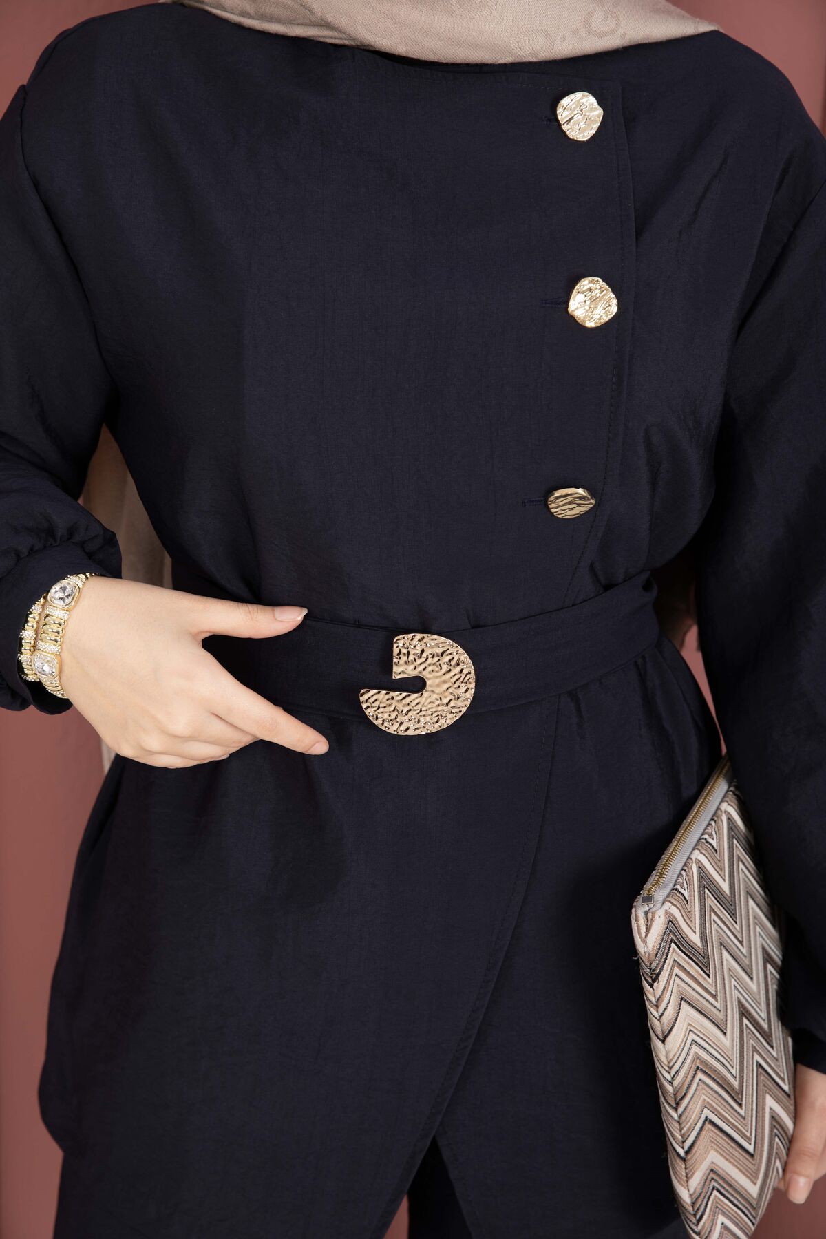 Tasarım Gold Düğmeli Kemerli İkili Takım Lacivert